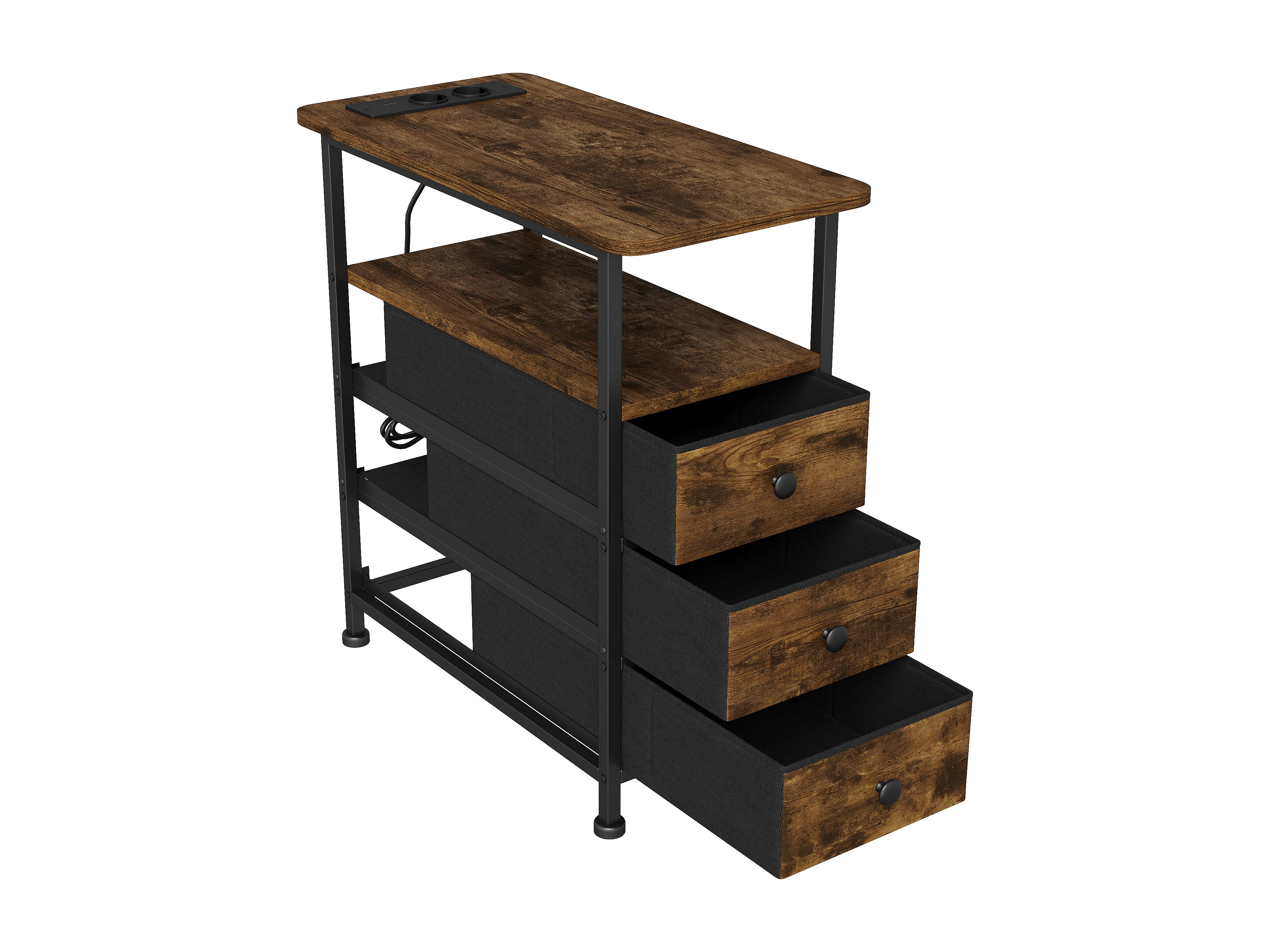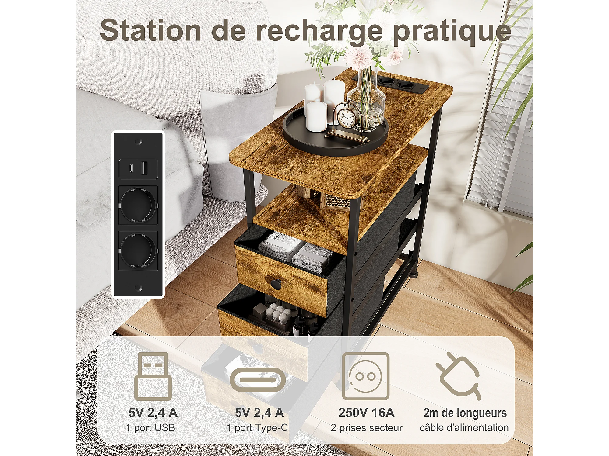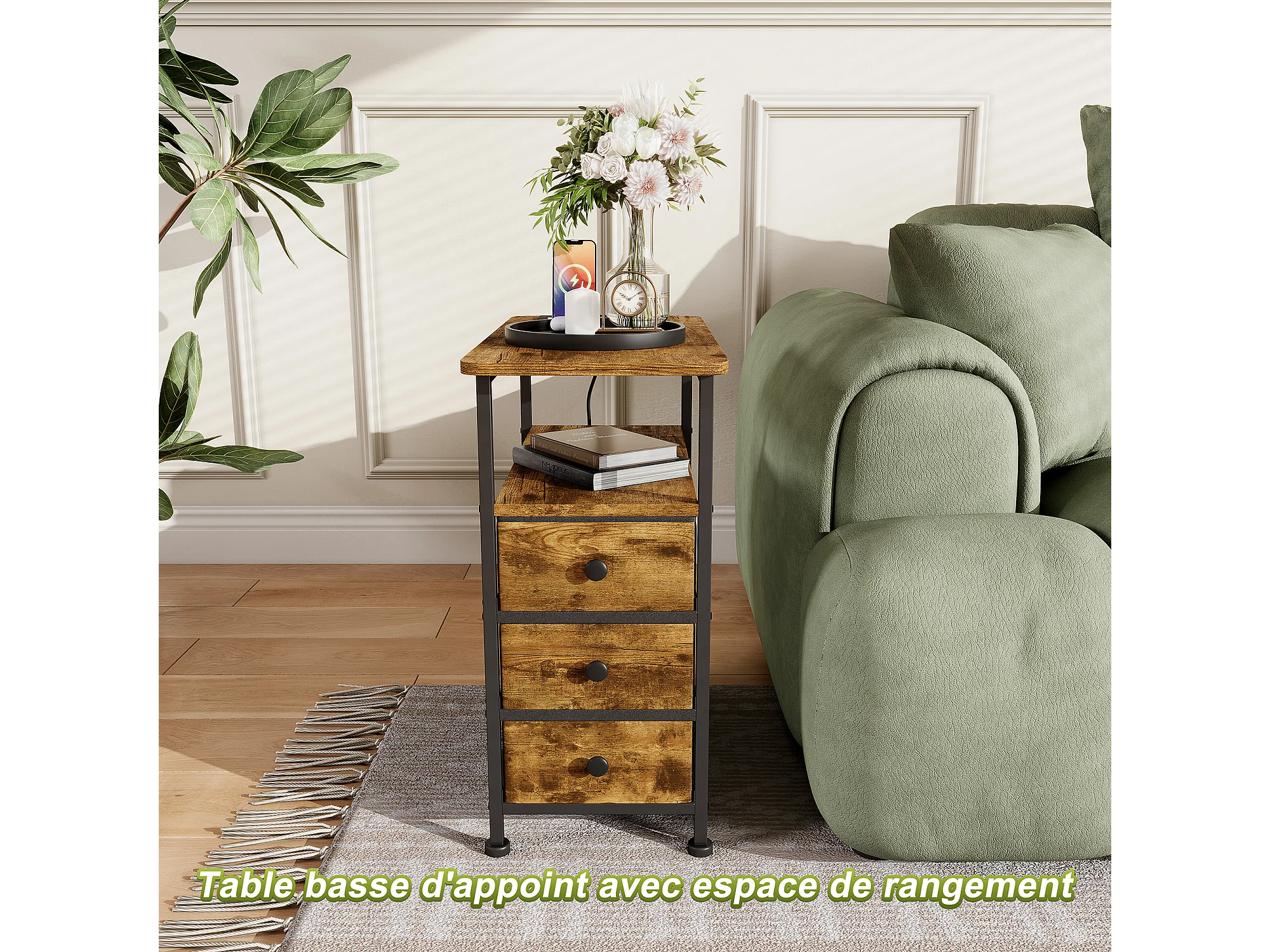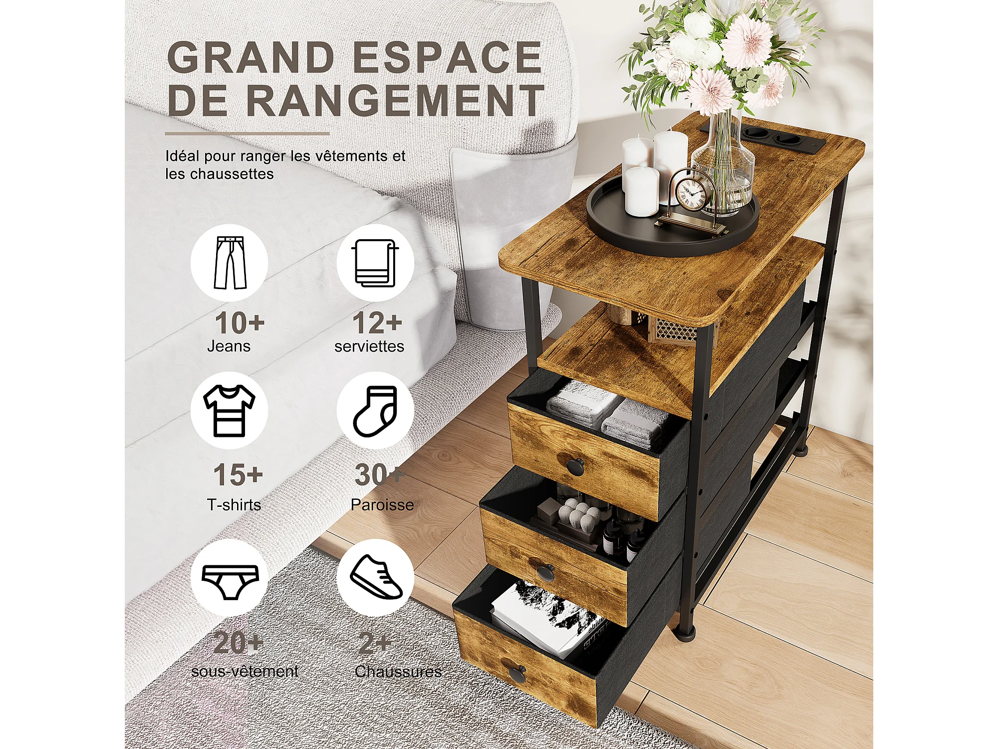 Commode étroite à 3 tiroirs, table de chevet avec fonction de chargement et bande lumineuse, table d'appoint avec tiroirs, 30 x 60 x 62 cm, Tigré