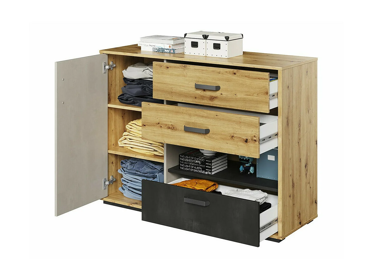 Commode Orlveno 106, Chêne Artisan|Gris|Noir, Avec tiroirs et portes, 90x120x42cm
