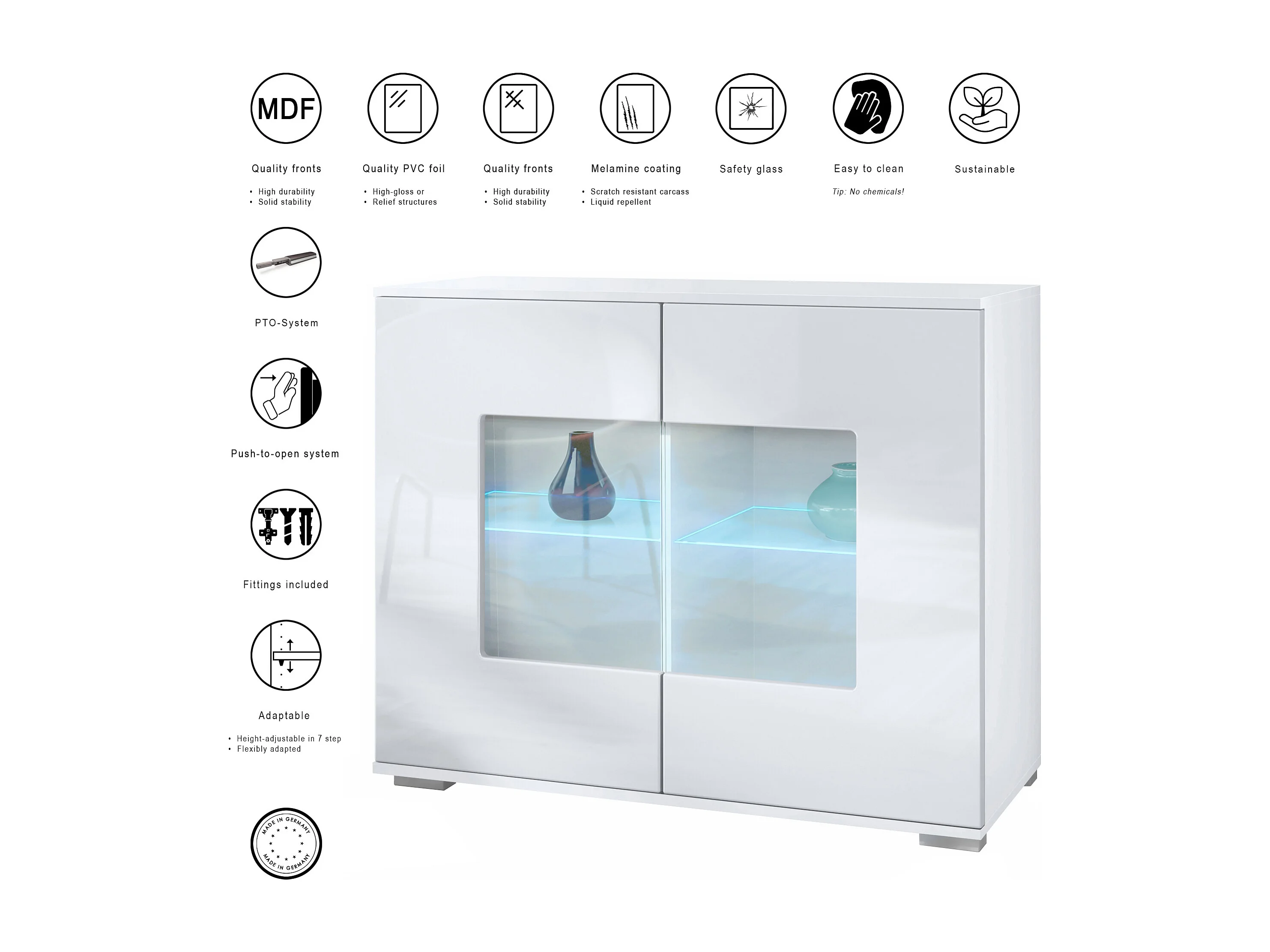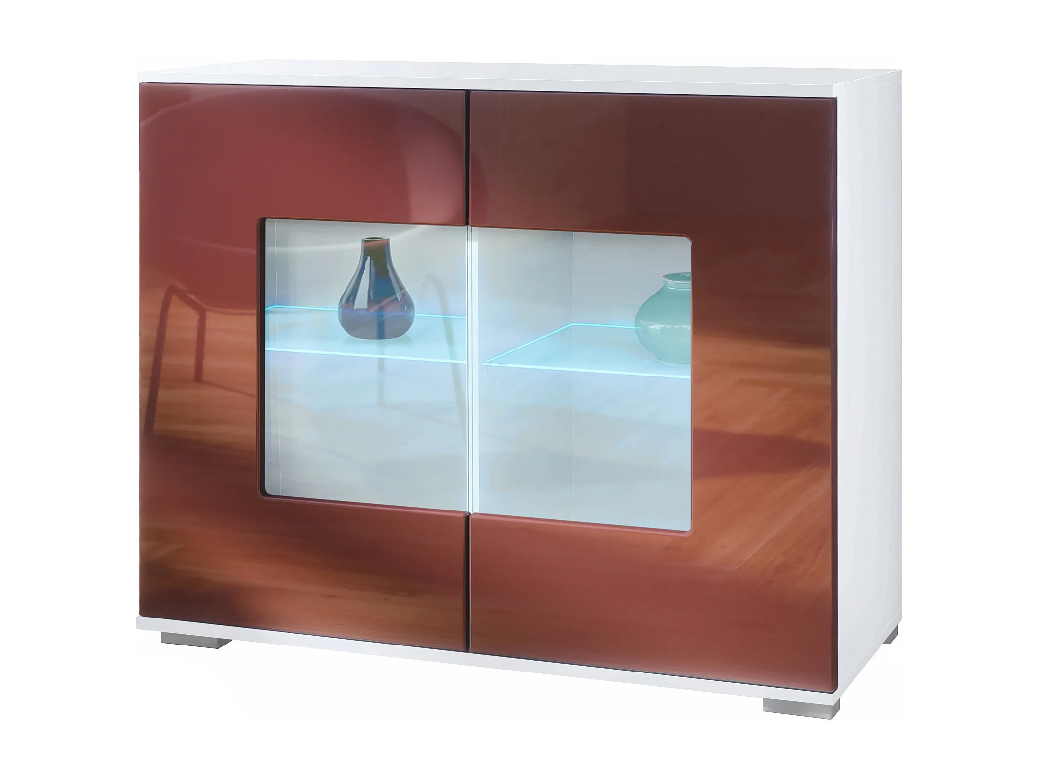 Commode Grömitz V3, Armoire de cuisine moderne avec 2 grandes portes vitrées incl. éclairage RGB blanc mat / bordeaux haute brillance (92,5 x 75.5 x 35)
