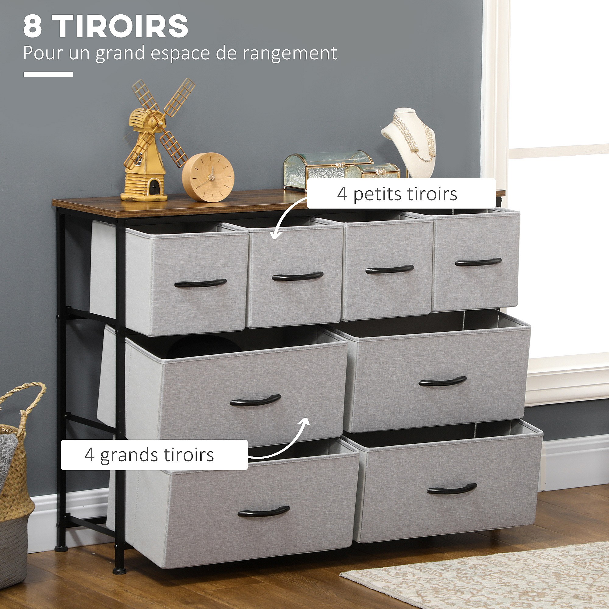 Commode meuble de rangement 8 tiroirs - dim. 100L x 30l x 78H cm - structure acier noir tissu pliant gris