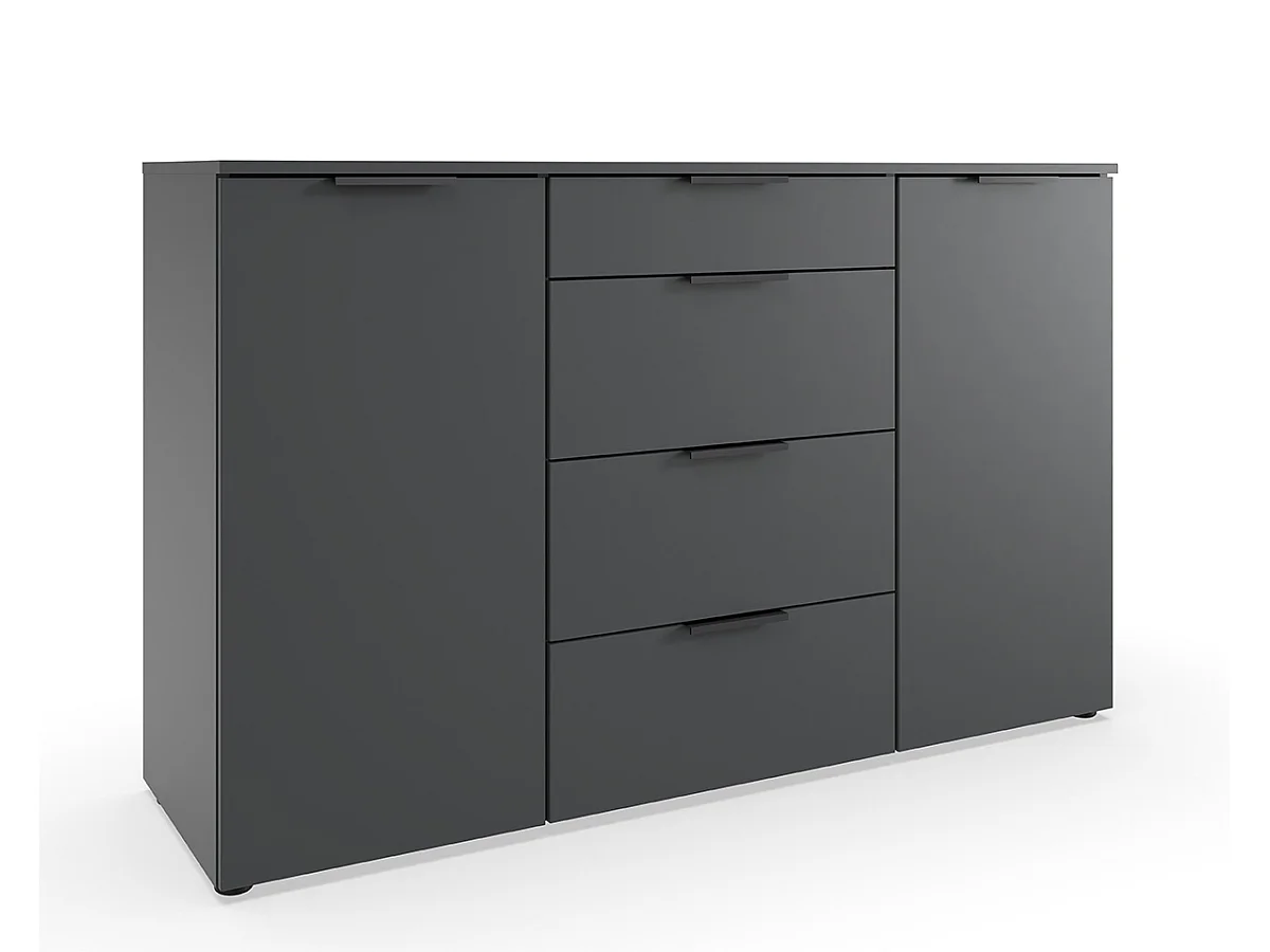 Commode, meuble de rangement avec 2 portes et 4 tiroirs coloris graphite, lamelles imitation chêne Artisan - Longueur 135 x Hauteur 84 x Profondeur 41 cm