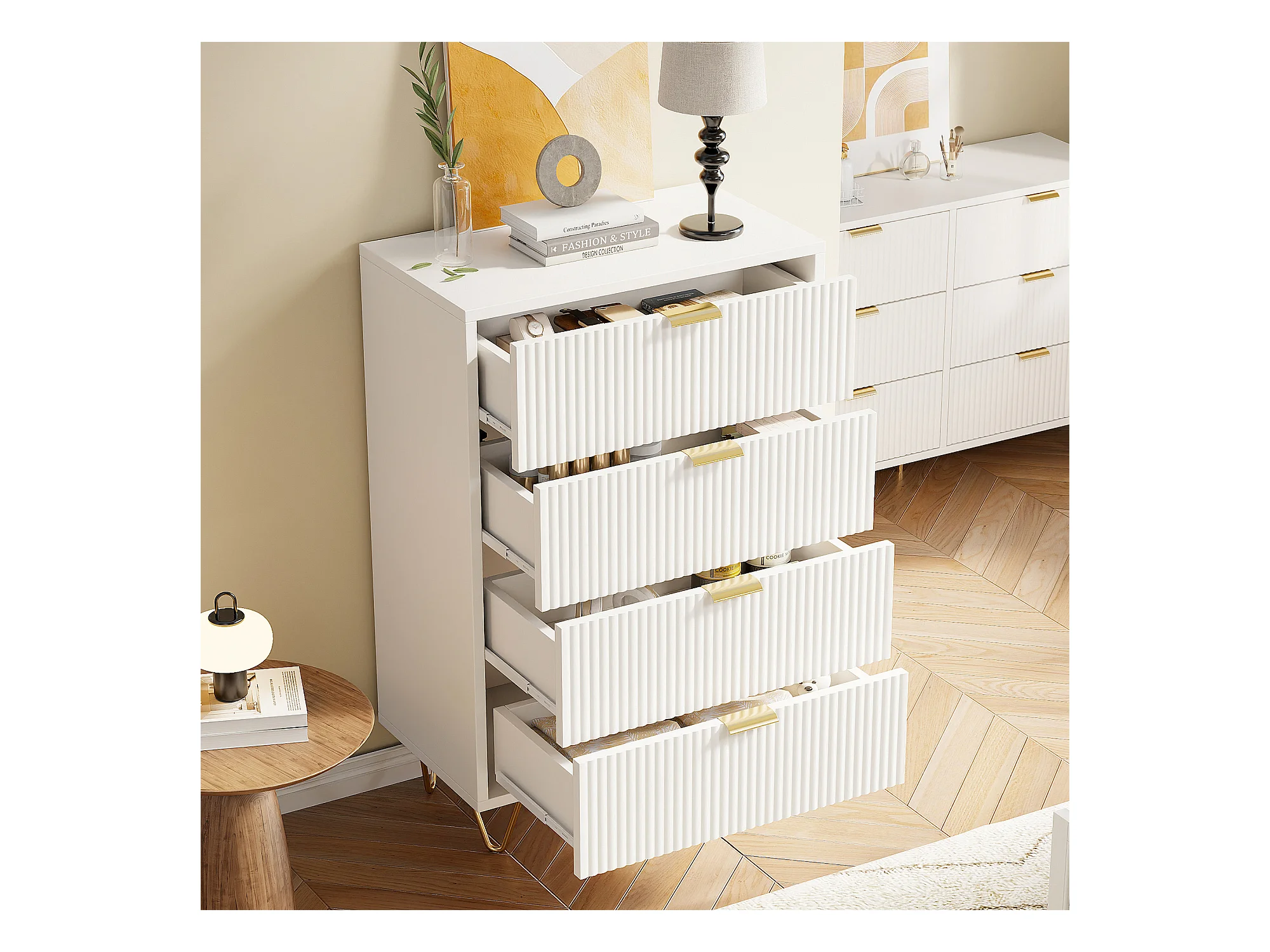 Commode moderne avec 4 tiroirs avec pieds et poignées dorées , entrée , 91 x 34 x 60 cm , blanc