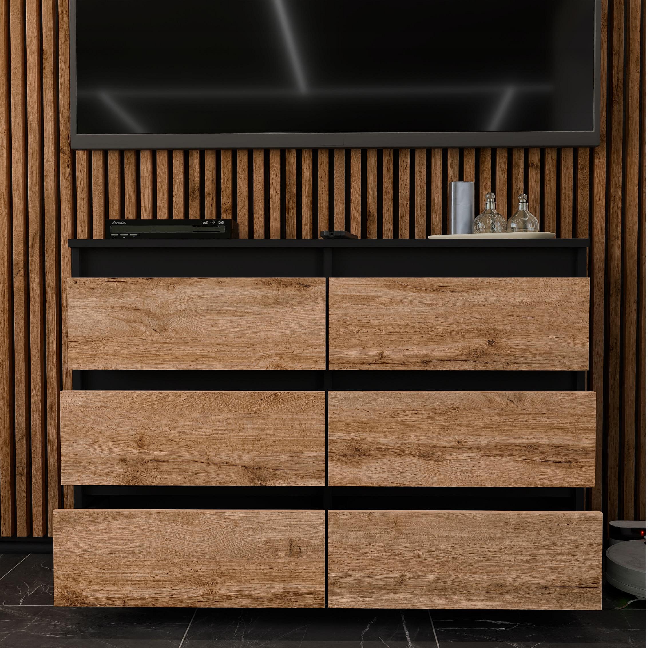 Commode Noire + Chêne Wotan 100 cm – 6 tiroirs – Meuble TV spacieux style loft / salon
