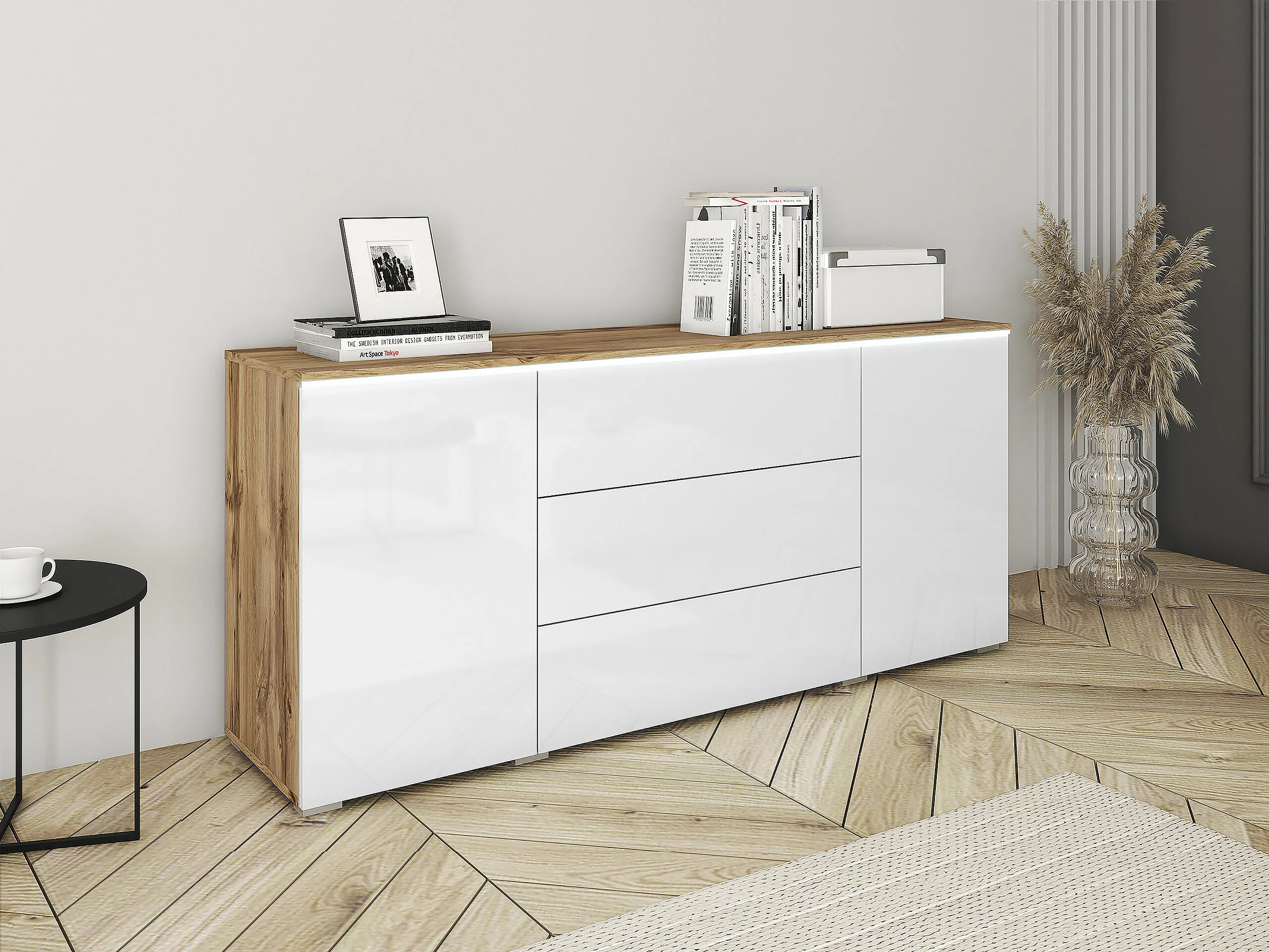 Commode Sarasota 142, Blanc brillant|Chêne wotan, Tiroirs et portes, Nombre de tiroirs: 3