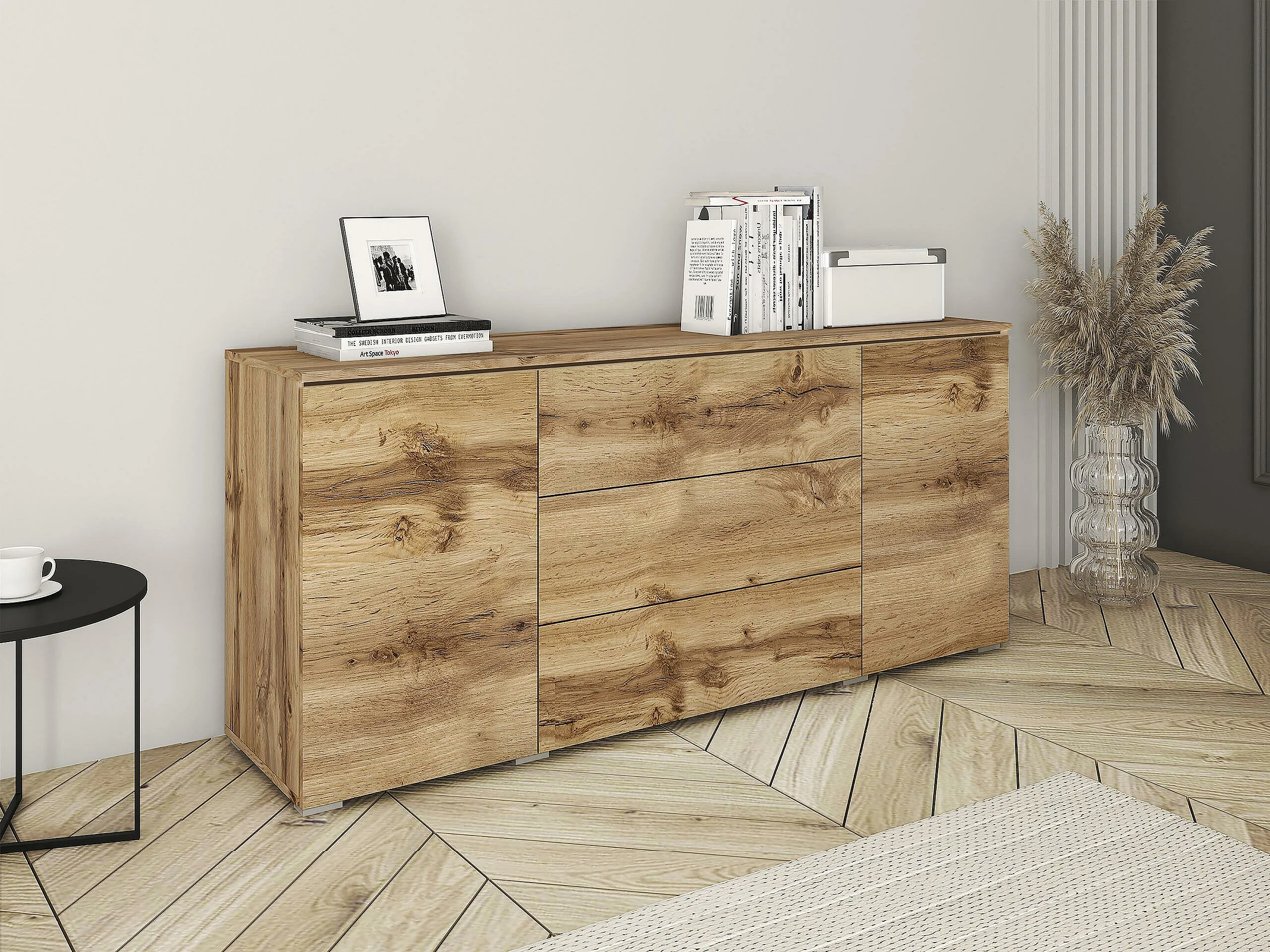 Commode Sarasota 142, Chêne wotan, Tiroirs et portes, Nombre de tiroirs: 3, 66x150x40cm