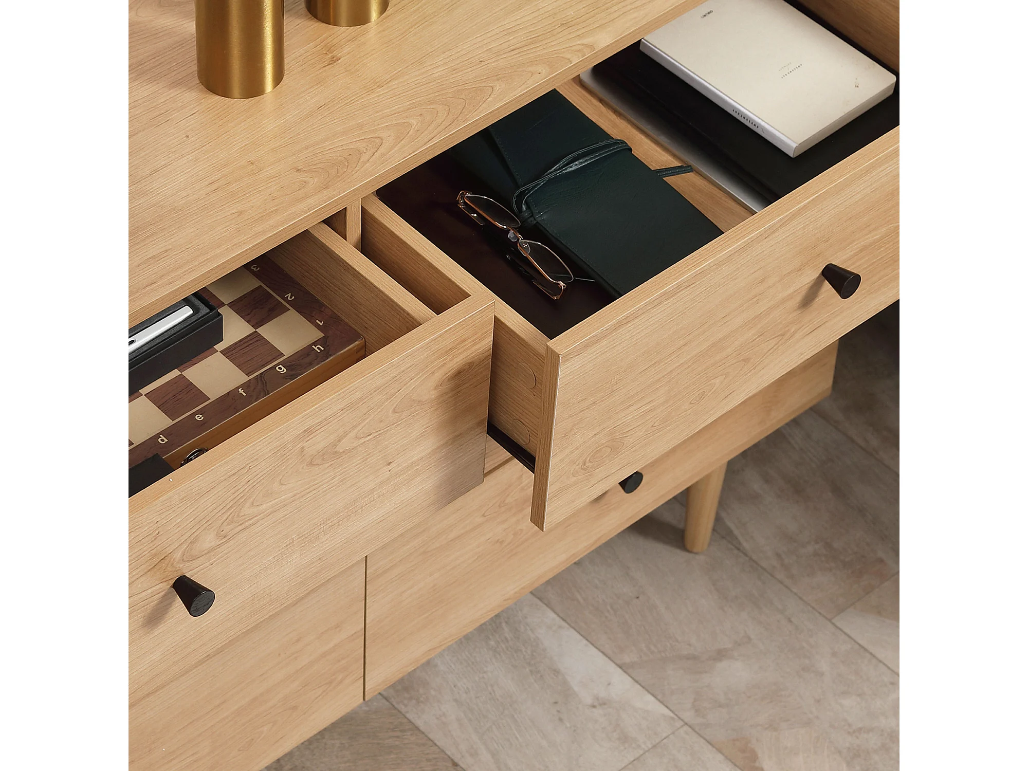 Commode vintage 6 tiroirs coulissants piètement bois de pin panneaux aspect bois de teck