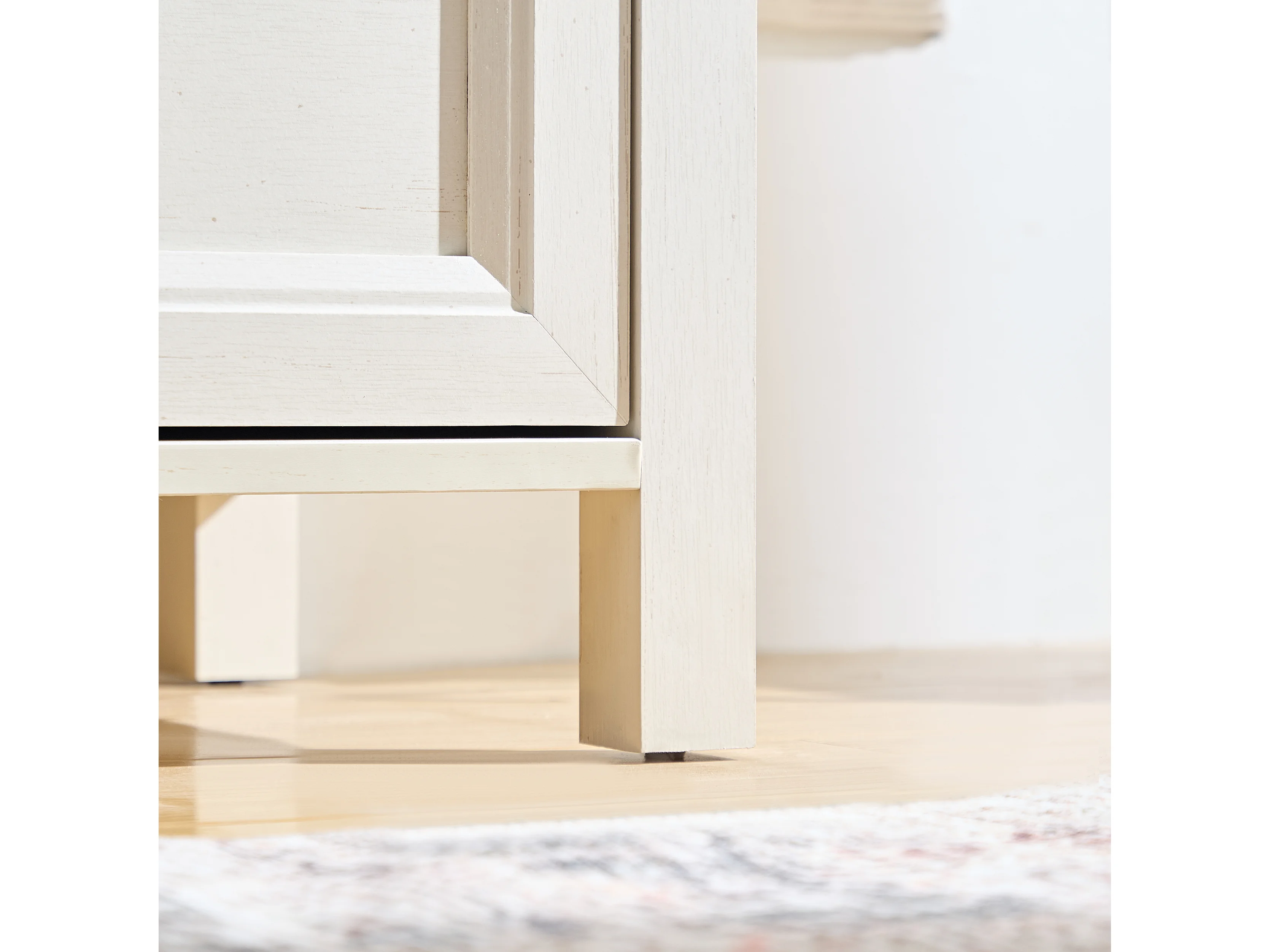 Commode vintage blanche avec 6 tiroirs, poignées en aluminium, plateau en noyer (137x40x79.5 cm)