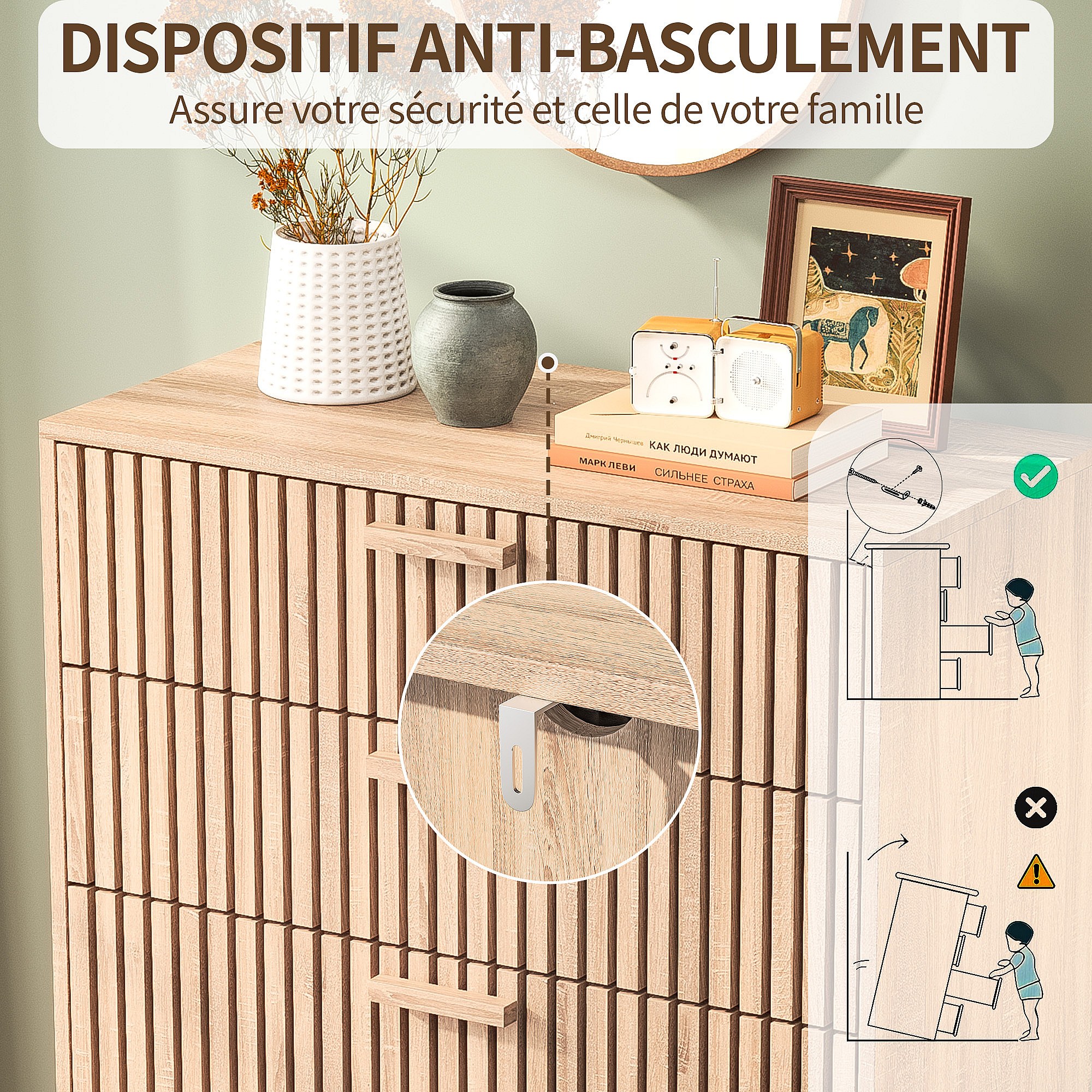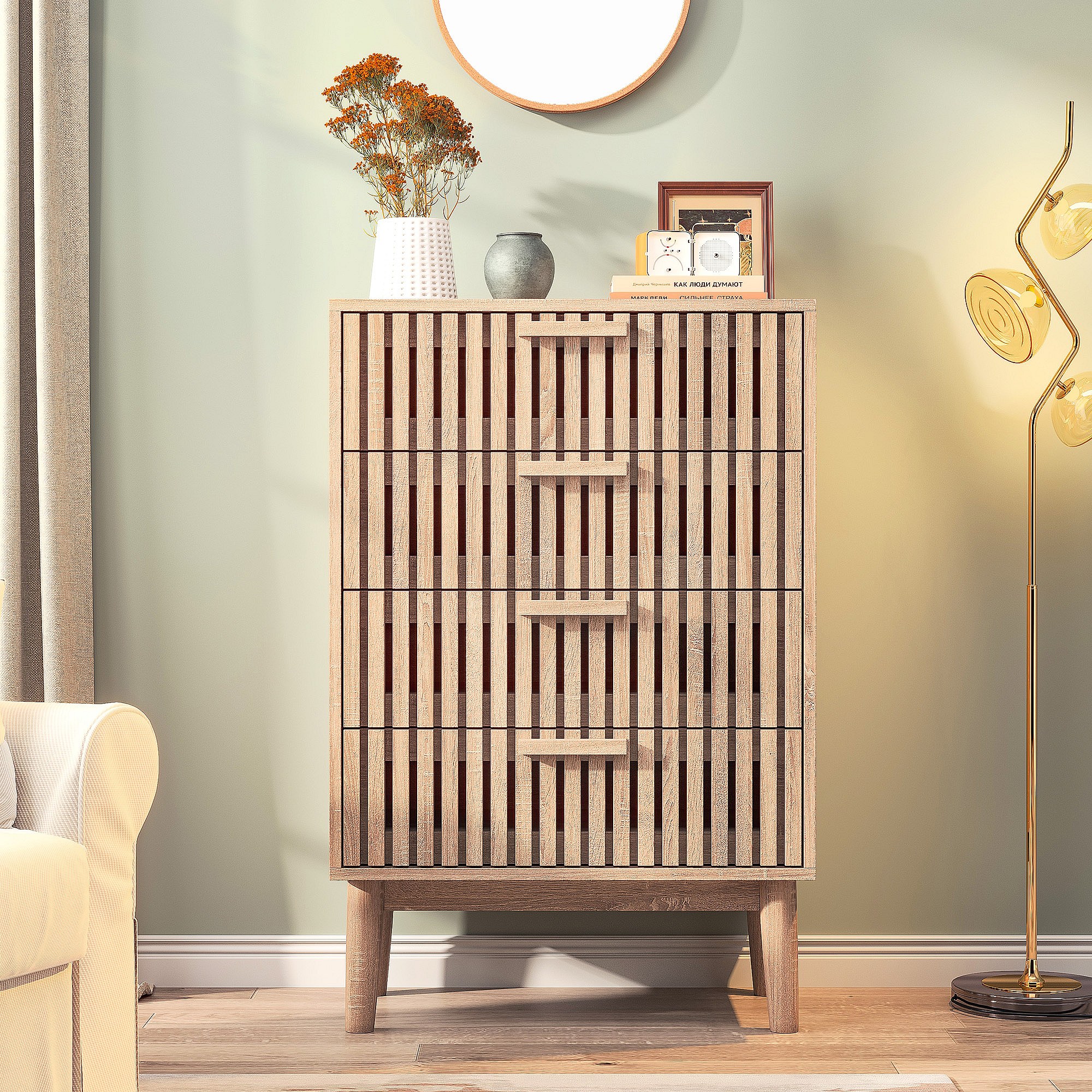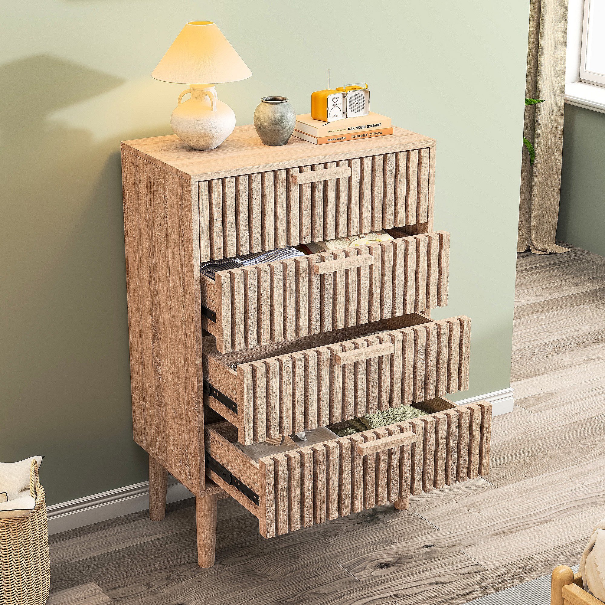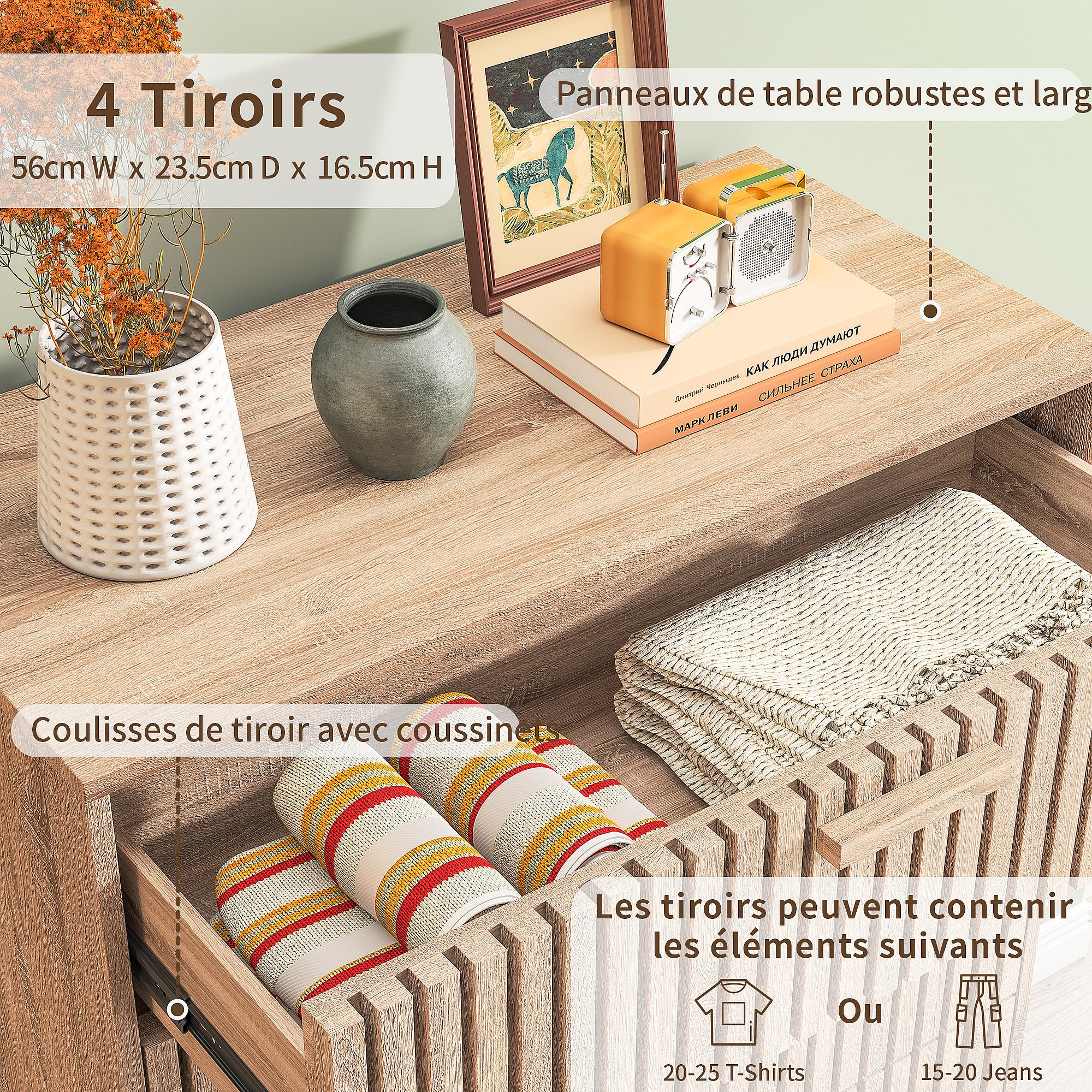 Commodes à tiroirs de chambre, avec poignée en Bois et Pieds de Support, Motif de Ligne, Commode Moderne en Bois et Rotin 4 Tiroirs