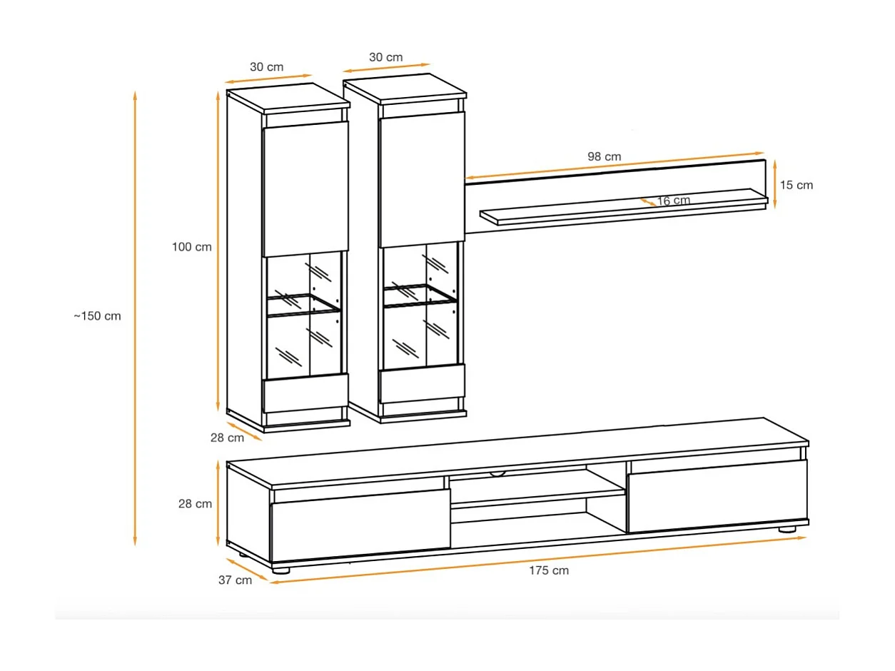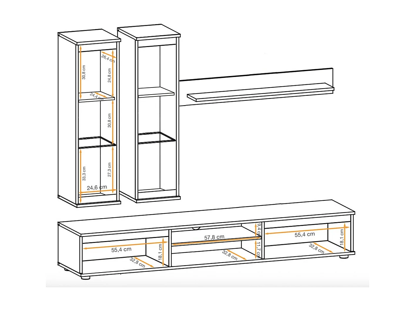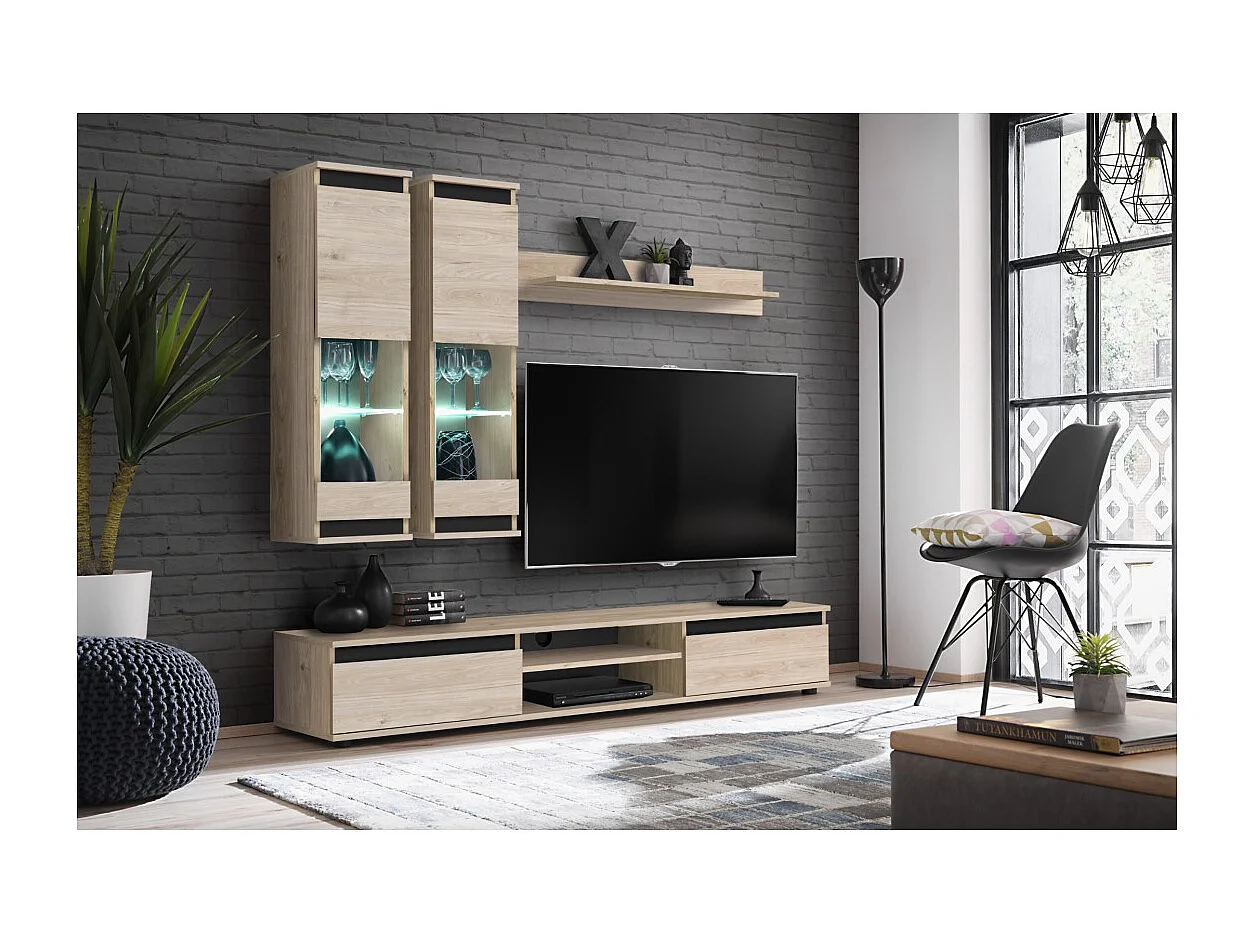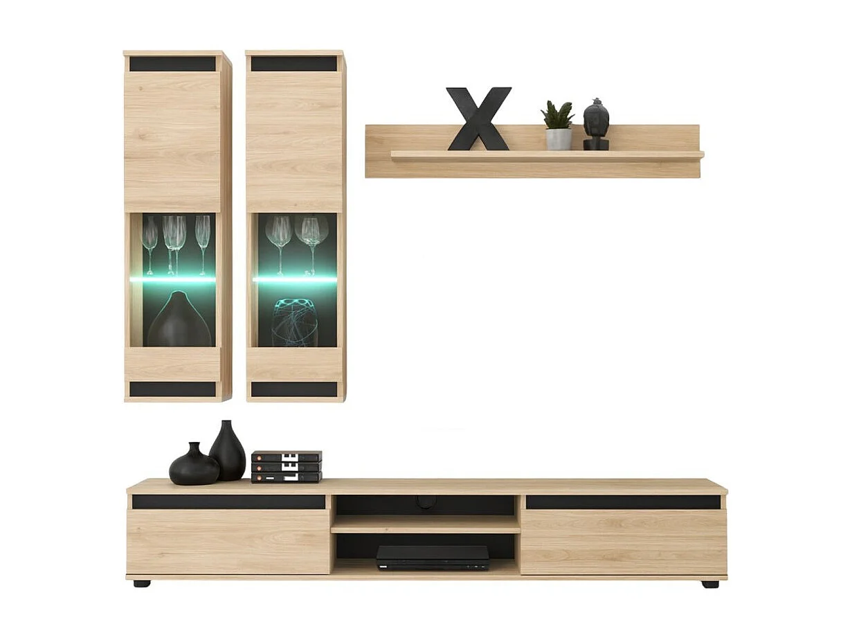 Composition murale DOMO – Meuble TV, 2 vitrines suspendues et étagère murale – Chêne clair et noir