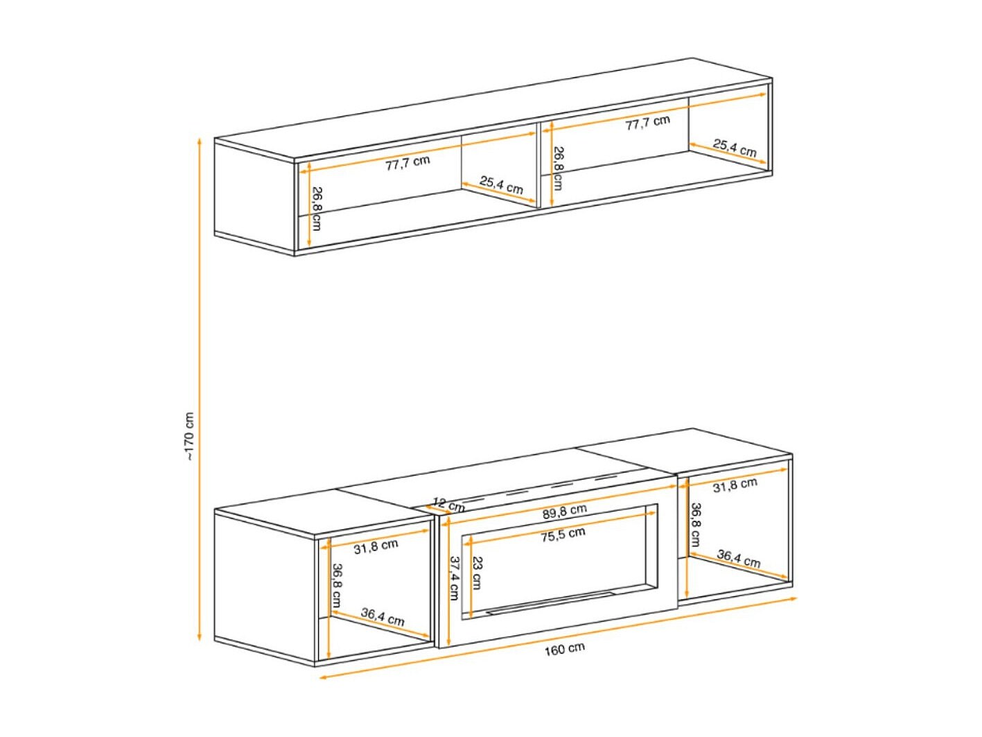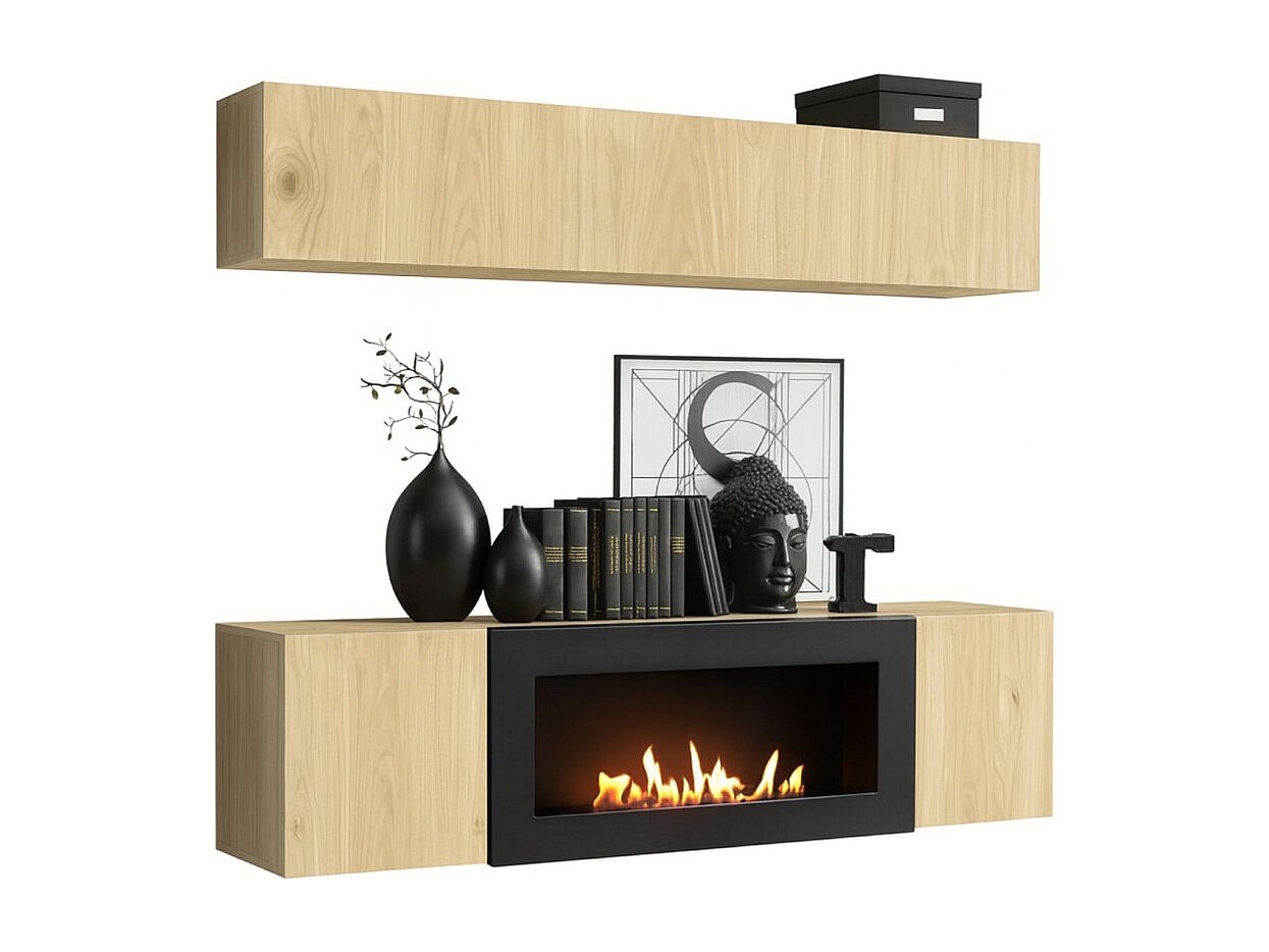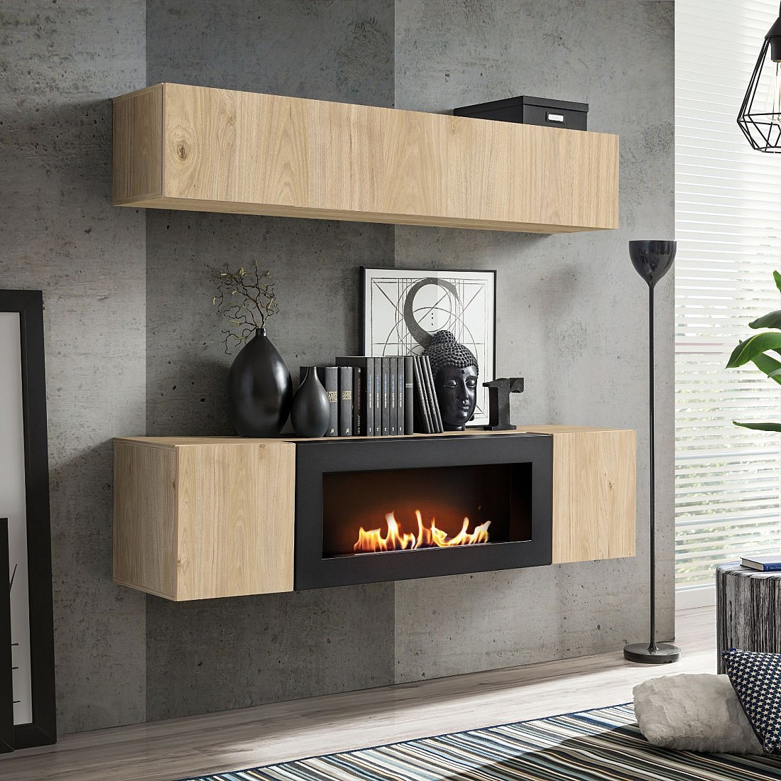 Composition murale FLY – Chêne clair – Vitrine horizontale et meuble TV avec cheminée bio-éthanol