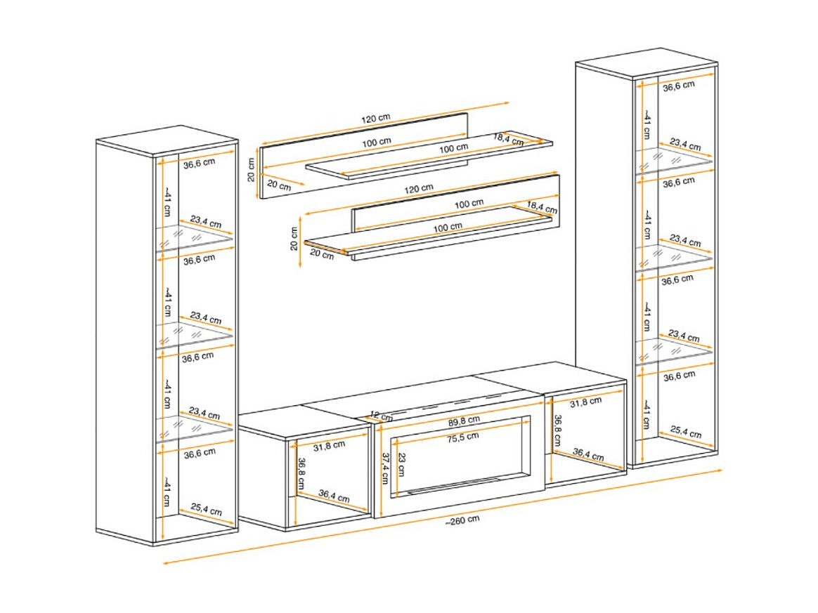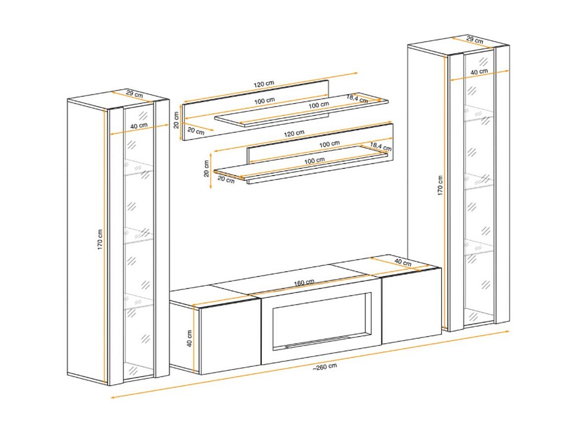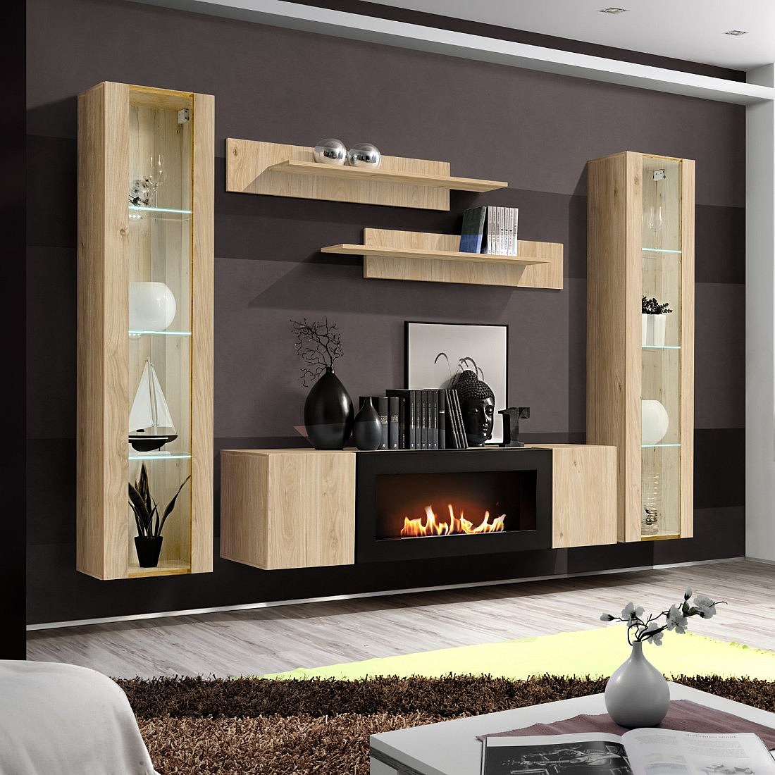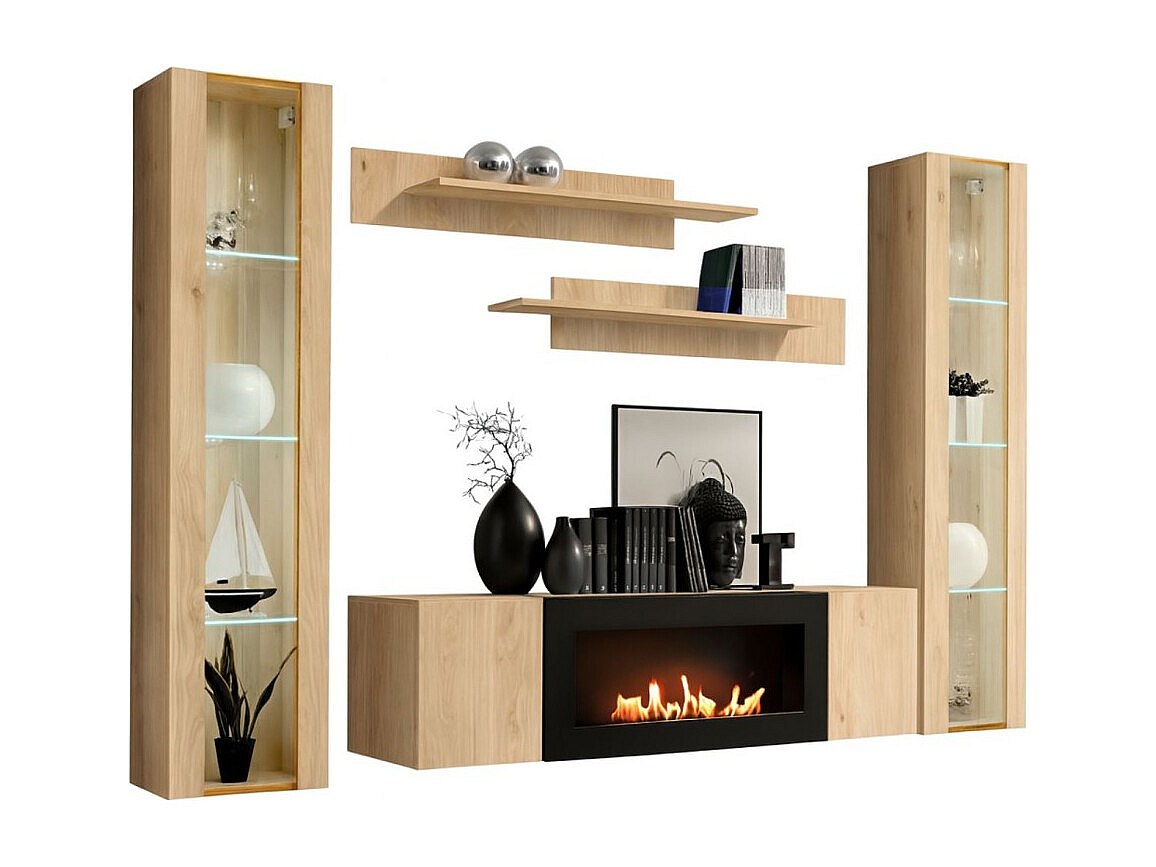 Composition murale FLY – Chêne clair – Vitrines vitrées, étagères et meuble TV avec cheminée bio-éthanol