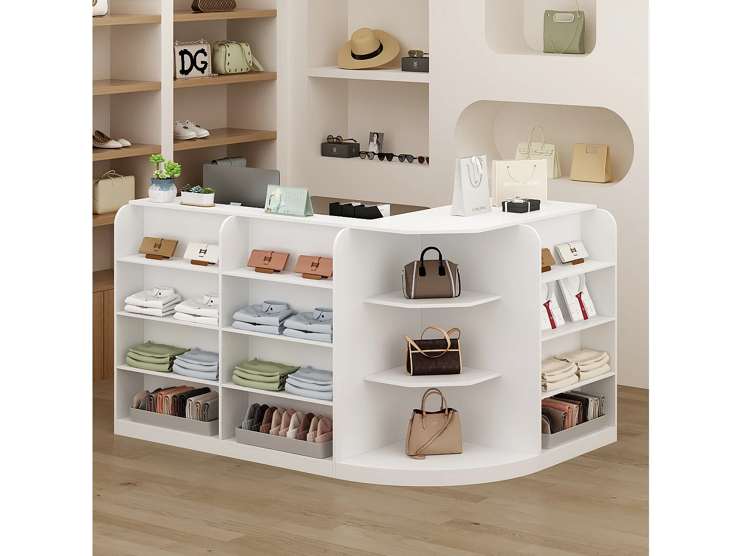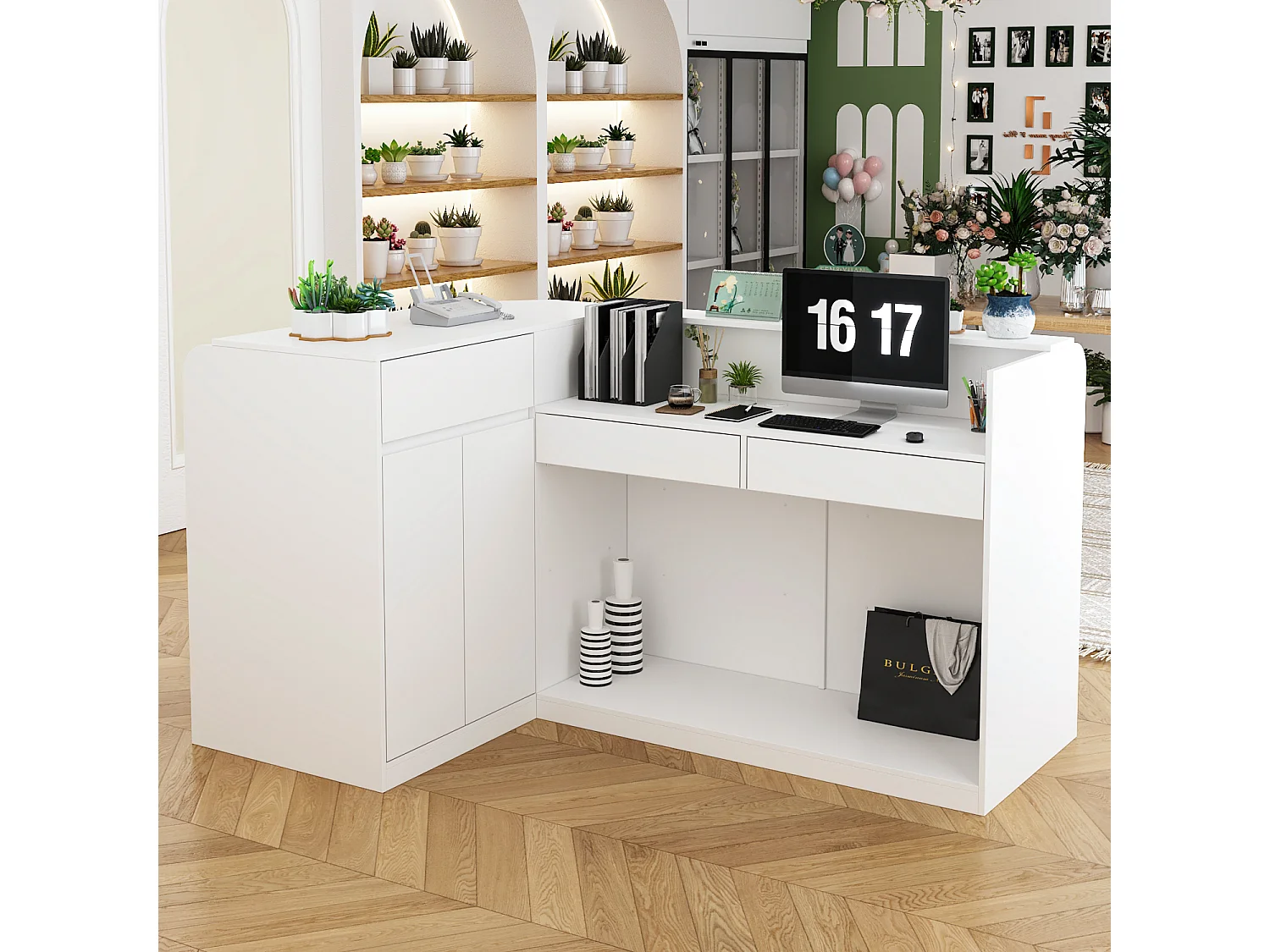 Comptoir de réception avec compartiments ouverts étagères Tiroir verrouillable Salon Bureau Blanc 180x120x100cm