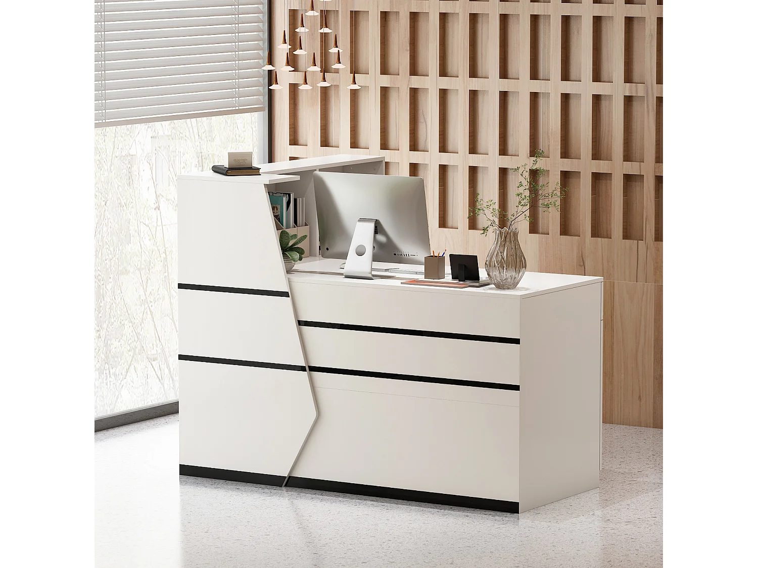 Bureau d'accueil avec porte et étagères, Comptoir de réception avec tiroir verrouillable, Bureau et Salon, 140x100x110cm, Blanc