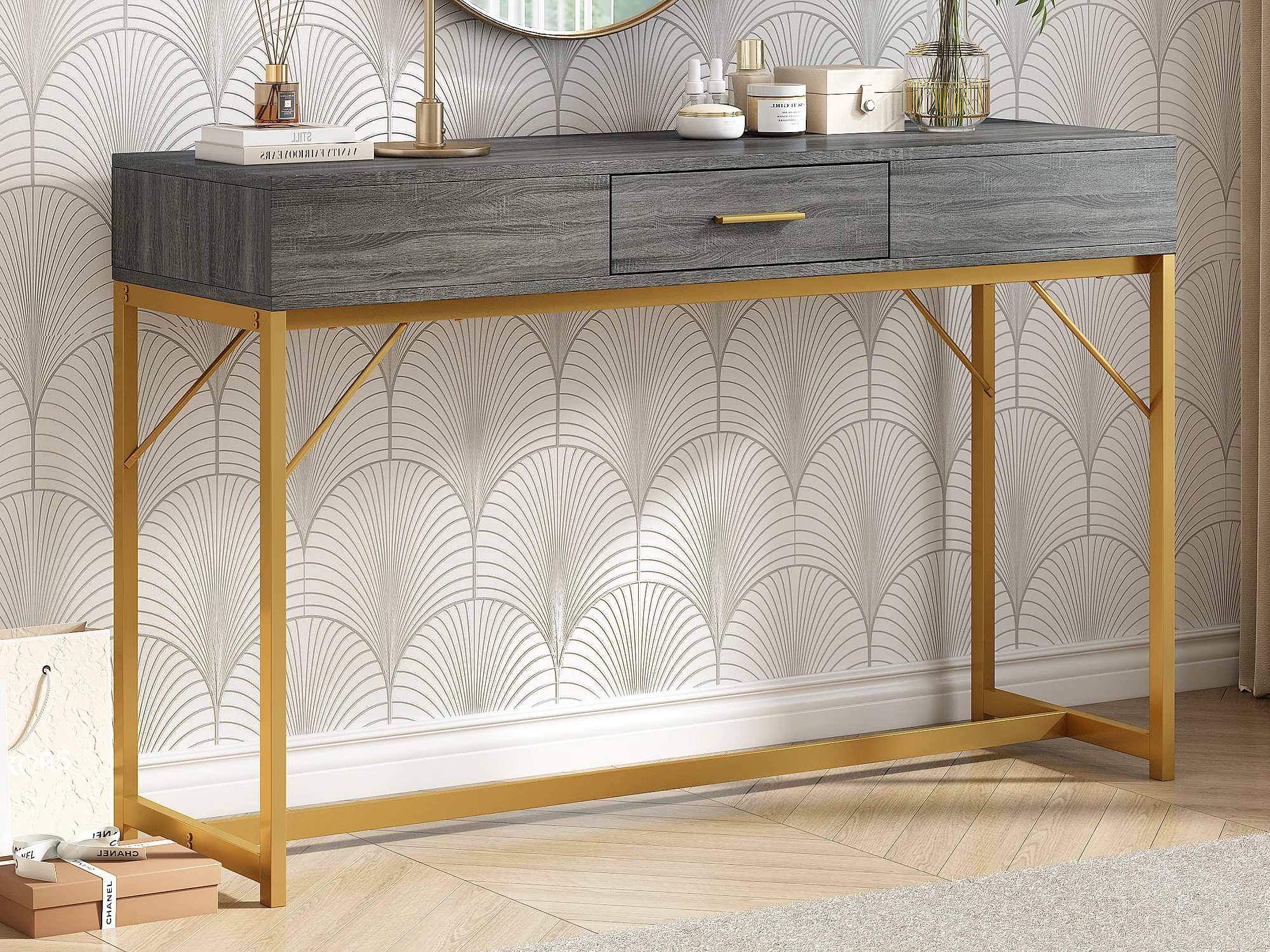 Console avec 1 tiroir - Pièds en métal doré - Gris - BLITZ