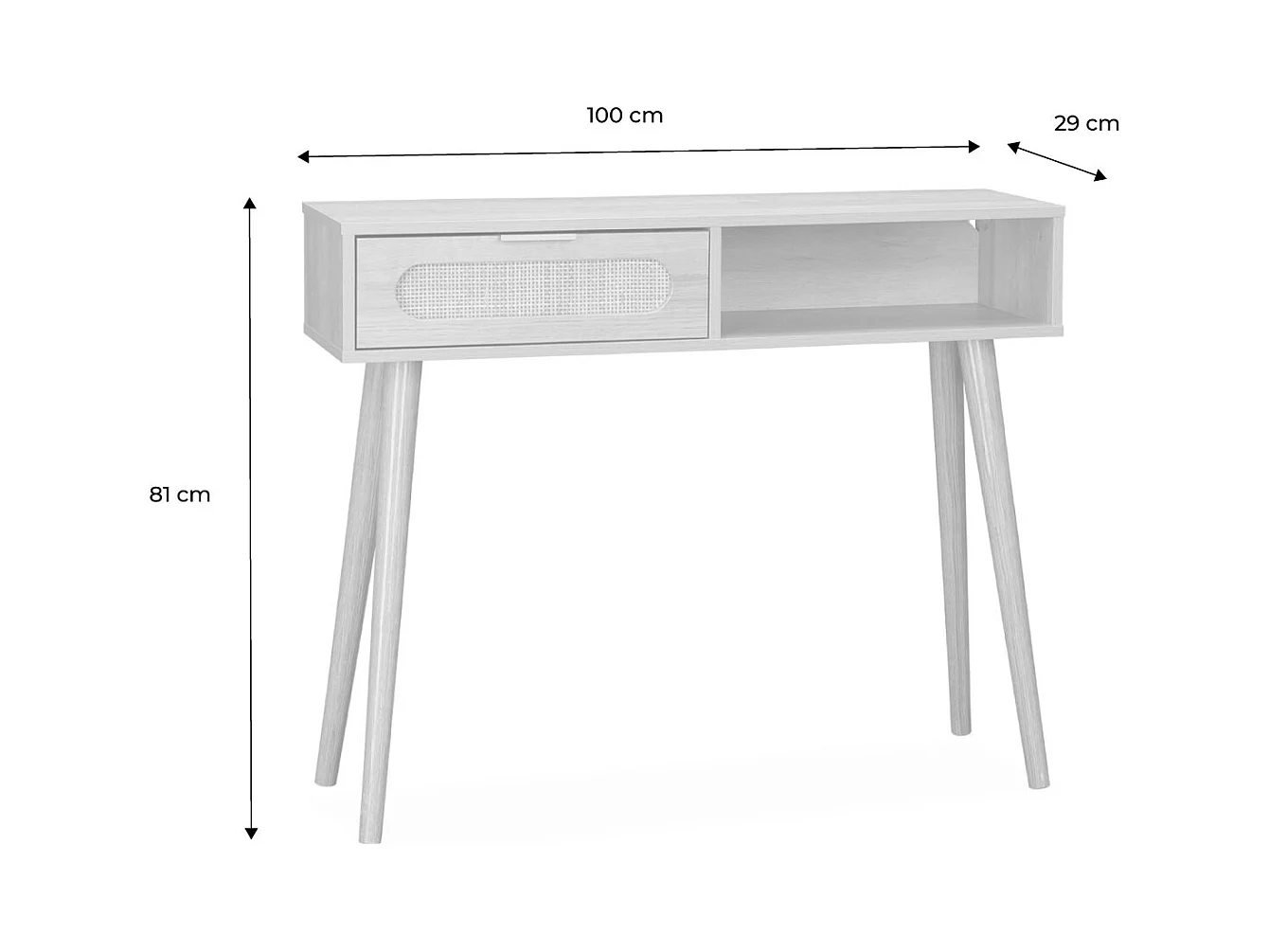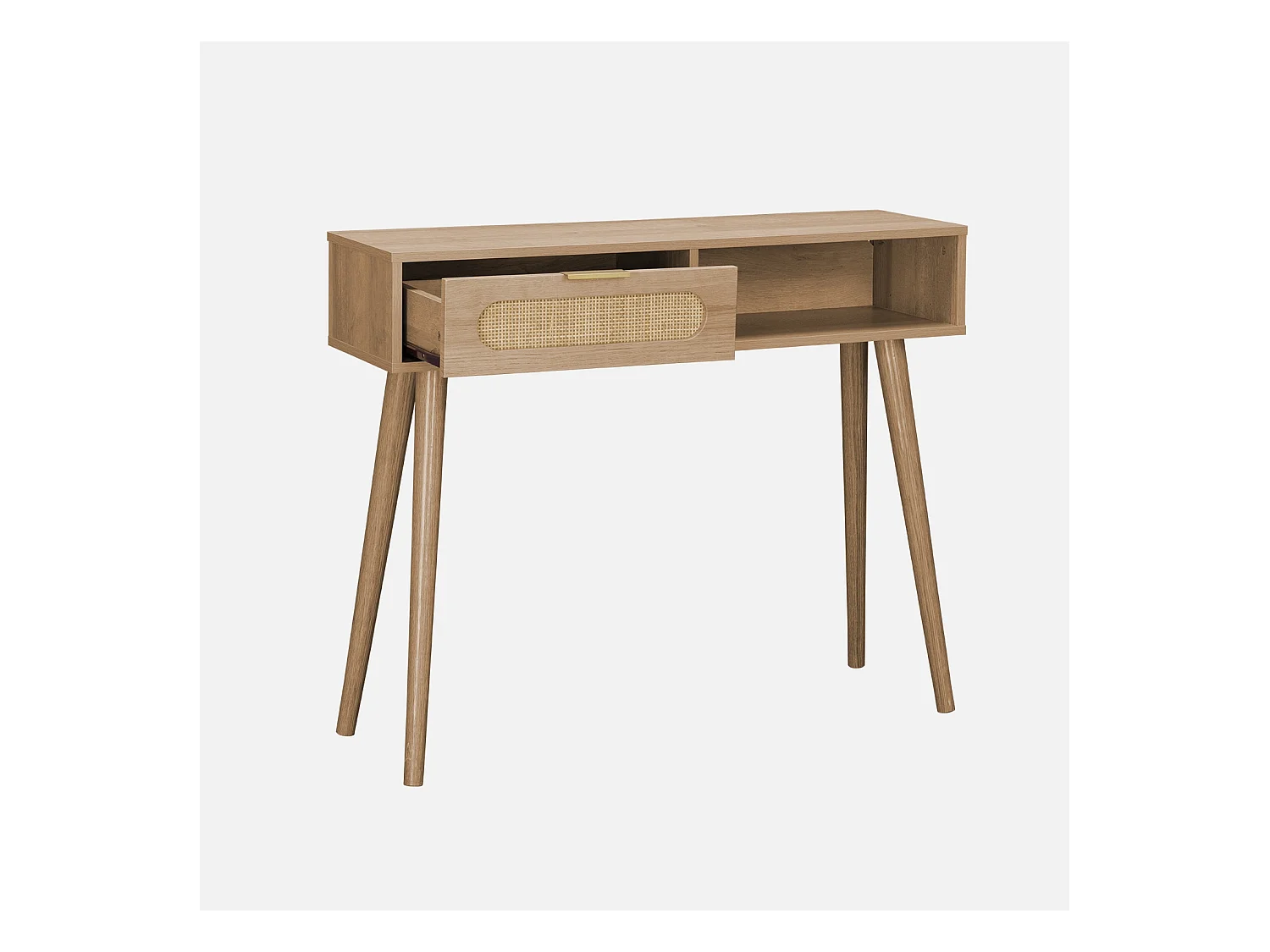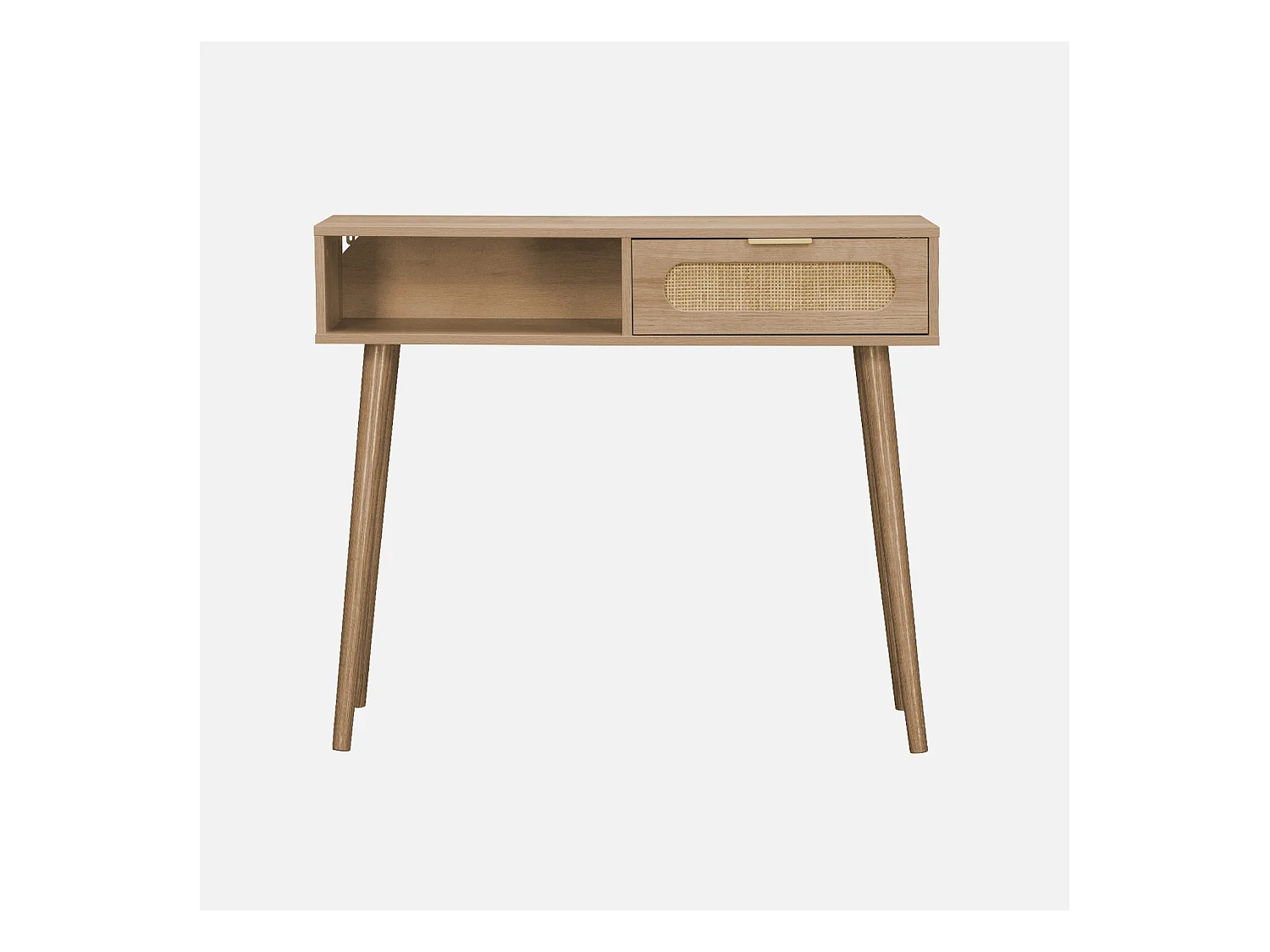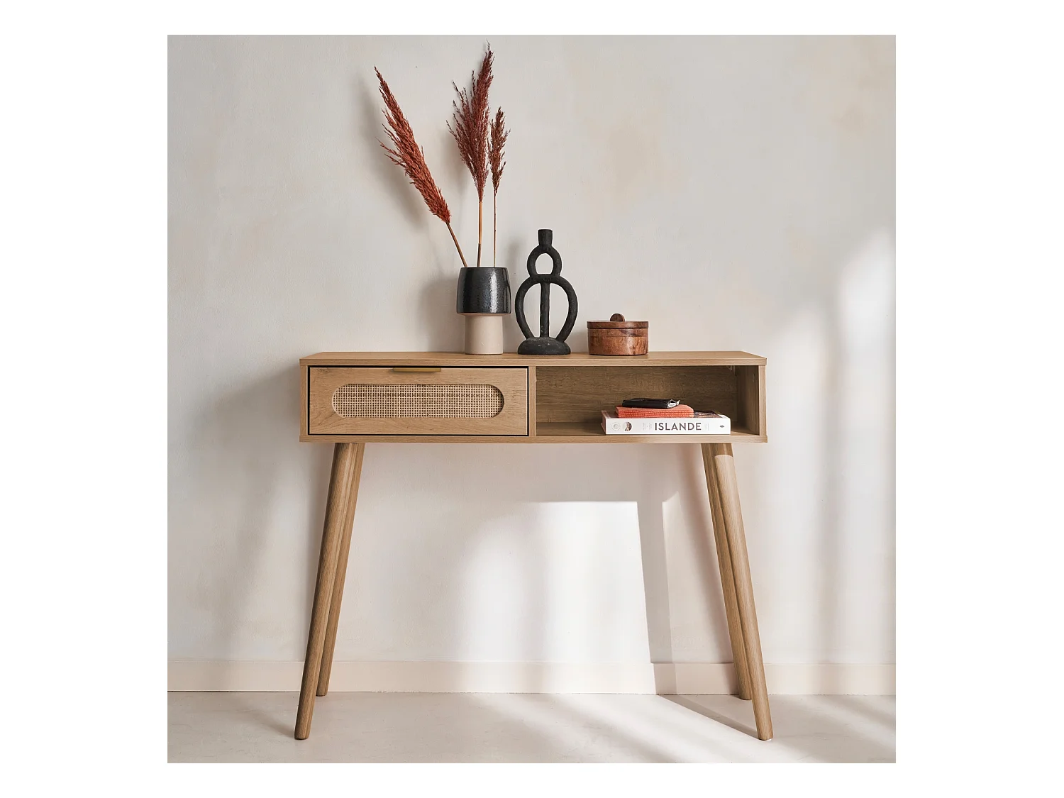 Console décor bois et cannage arrondi . Eva. 1 tiroir. 1 niche. pieds scandinaves. L 100 x l 29 x H 81cm