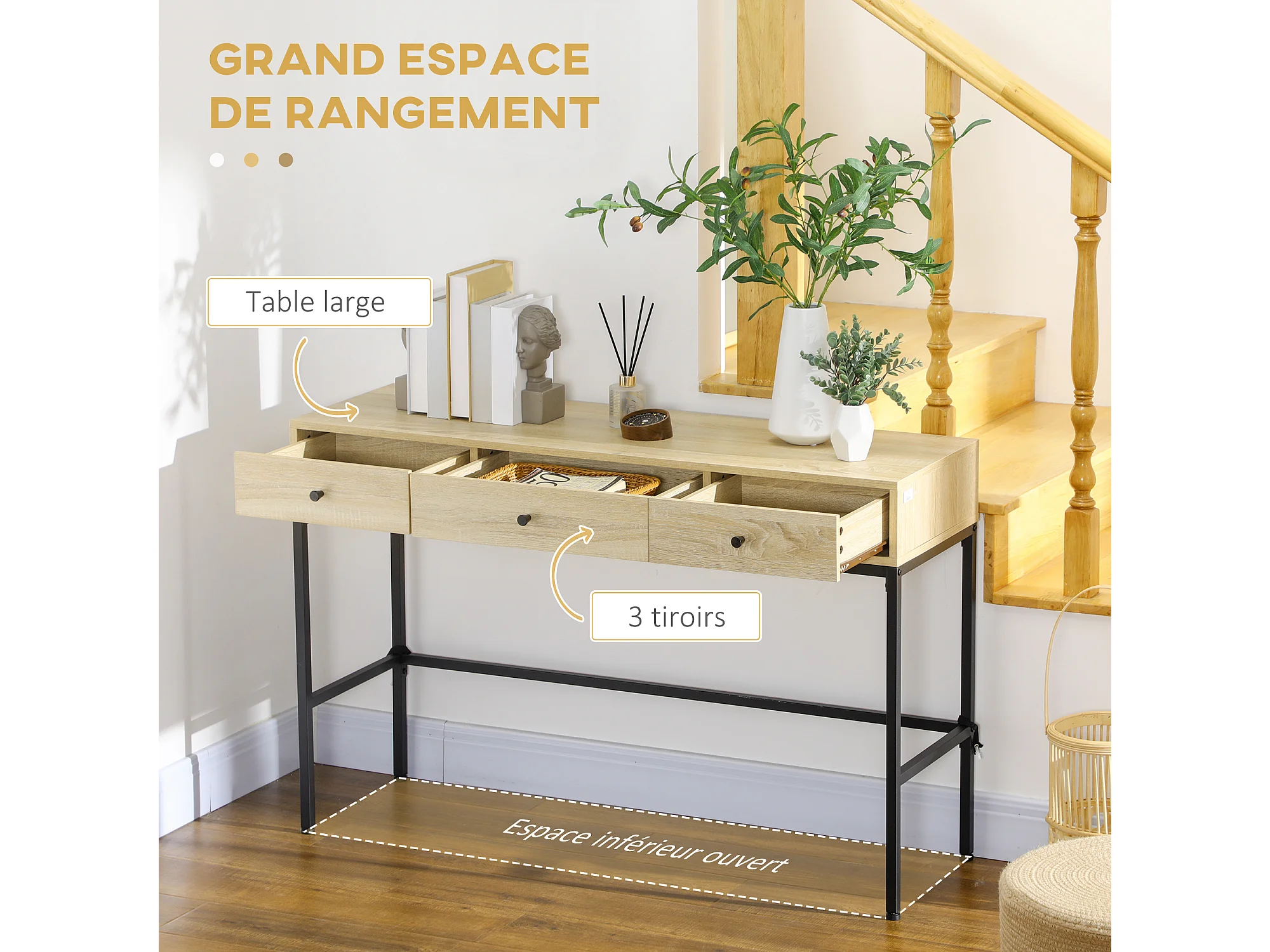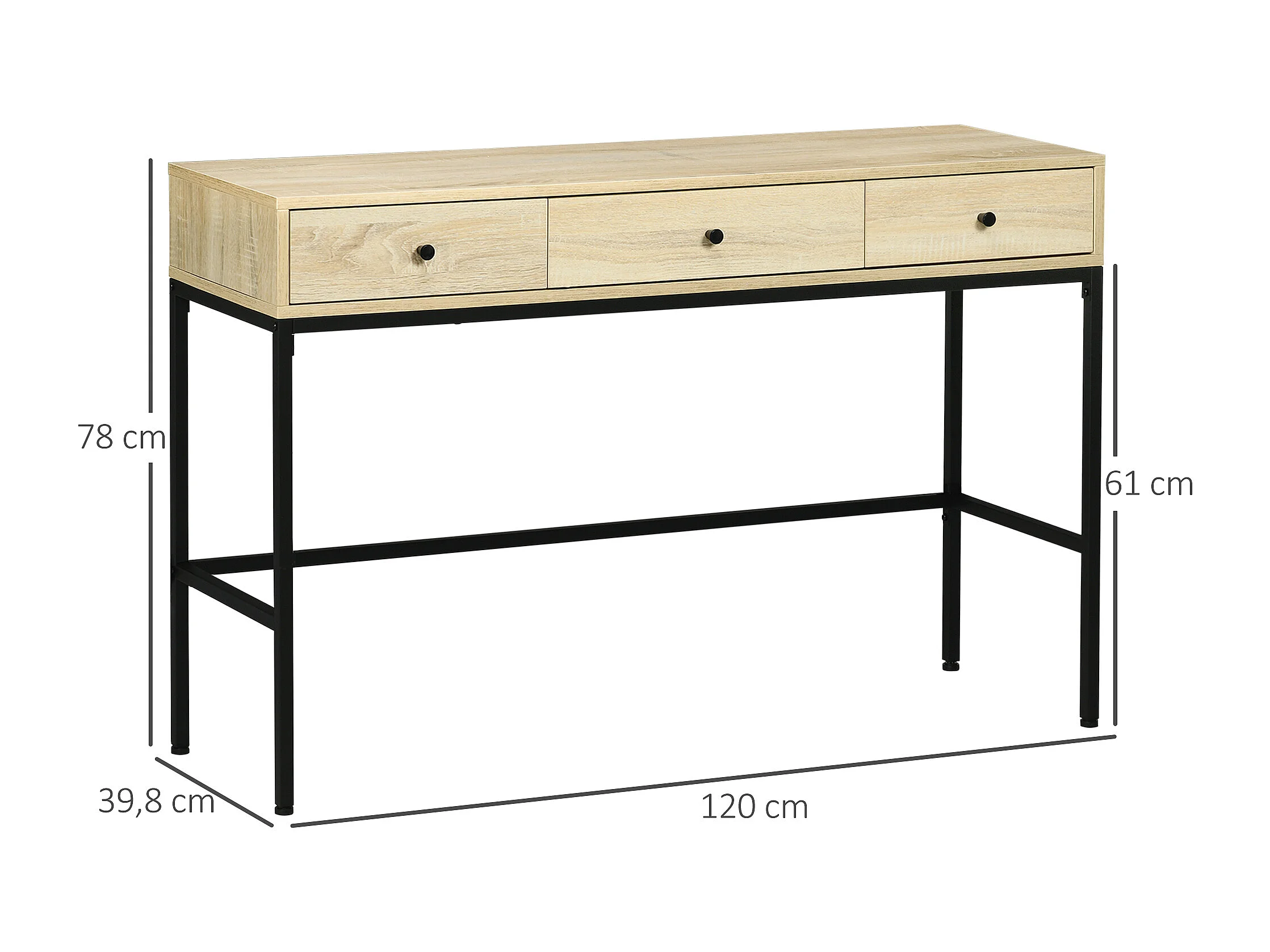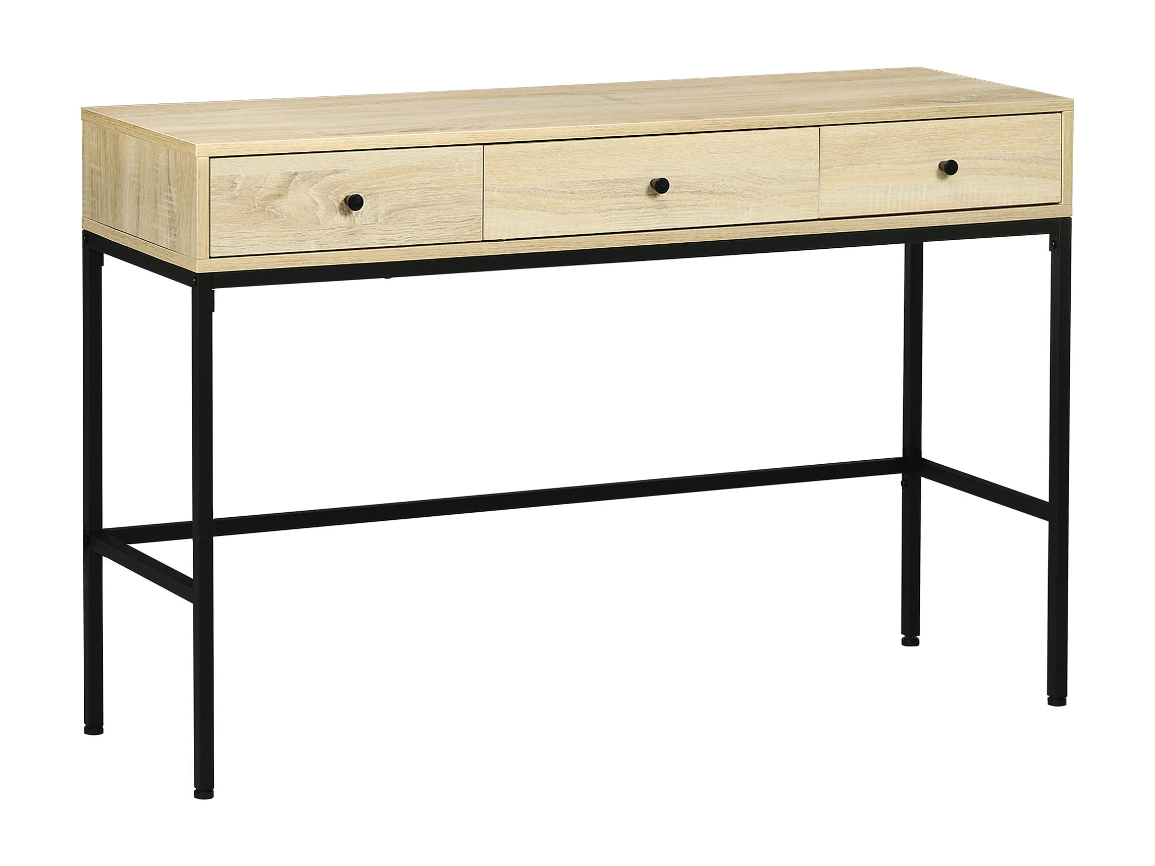 Console design industriel 3 tiroirs structure piètement acier noir panneaux aspect bois clair