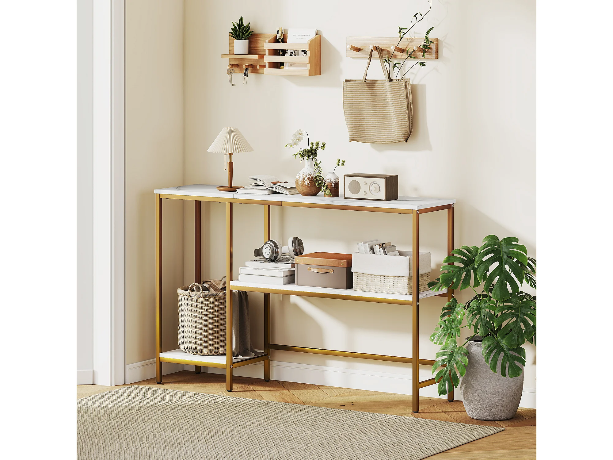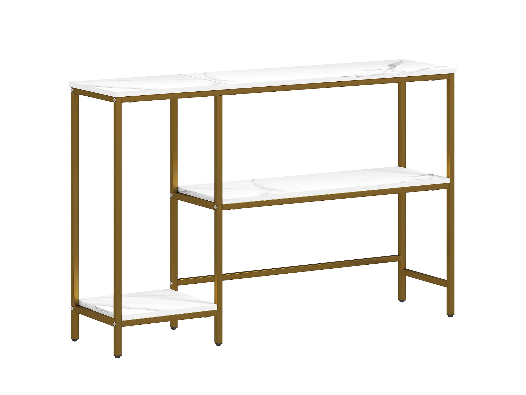 Console design style Art Déco 2 étagères plateau piètement acier doré effet marbre blanc