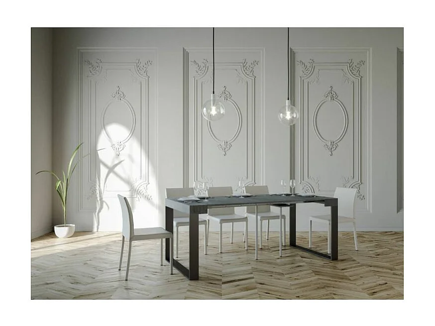 Console extensible bois et 2 pieds acier anthracite Elatra 90x40-196 ou 90x40-300-Couleur Gris ciment-Pied et support sur roulettes-5 rallonges fines