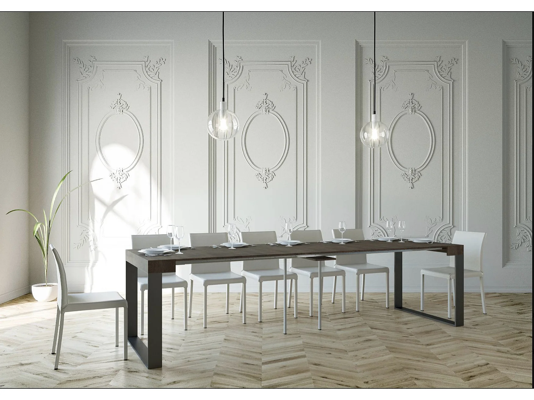 Console extensible bois et 2 pieds acier anthracite Elatra 90x40-196 ou 90x40-300-Couleur Marron-Support 4 pieds-5 rallonges fines