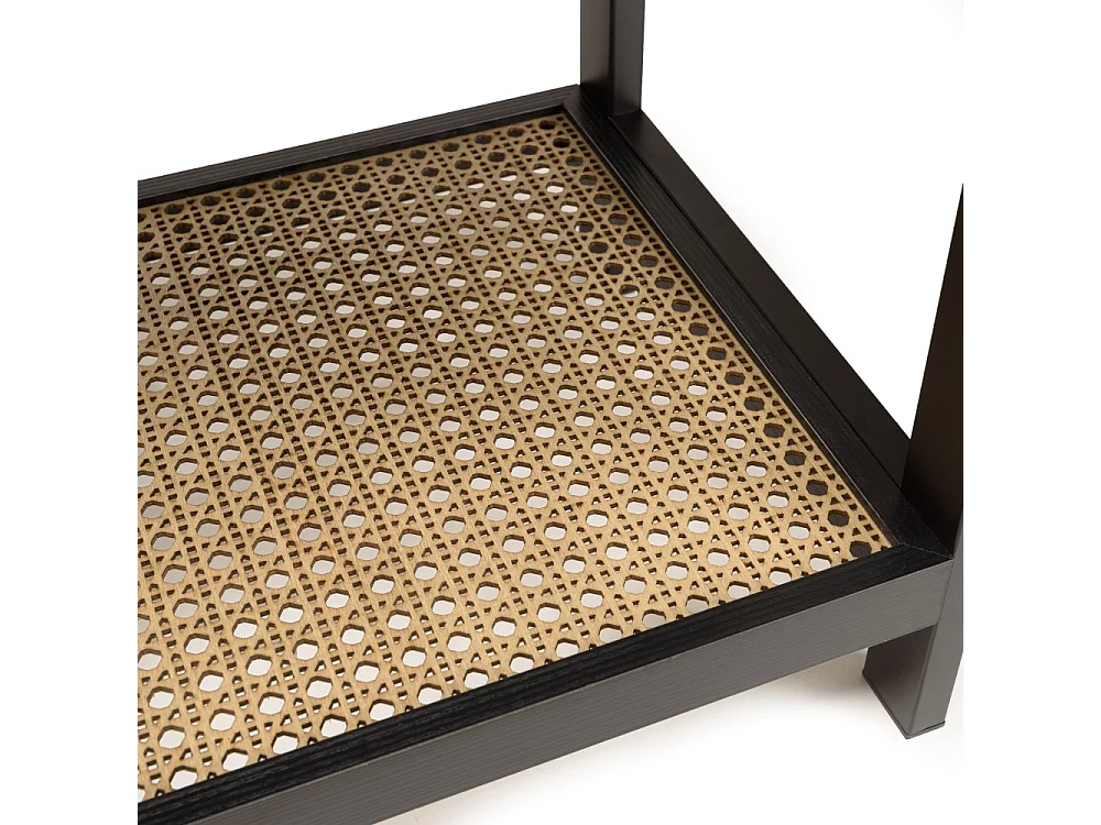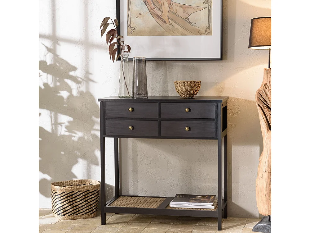 CHARLIE - Console bois noire 4 tiroirs 1 étagère effet cannage
