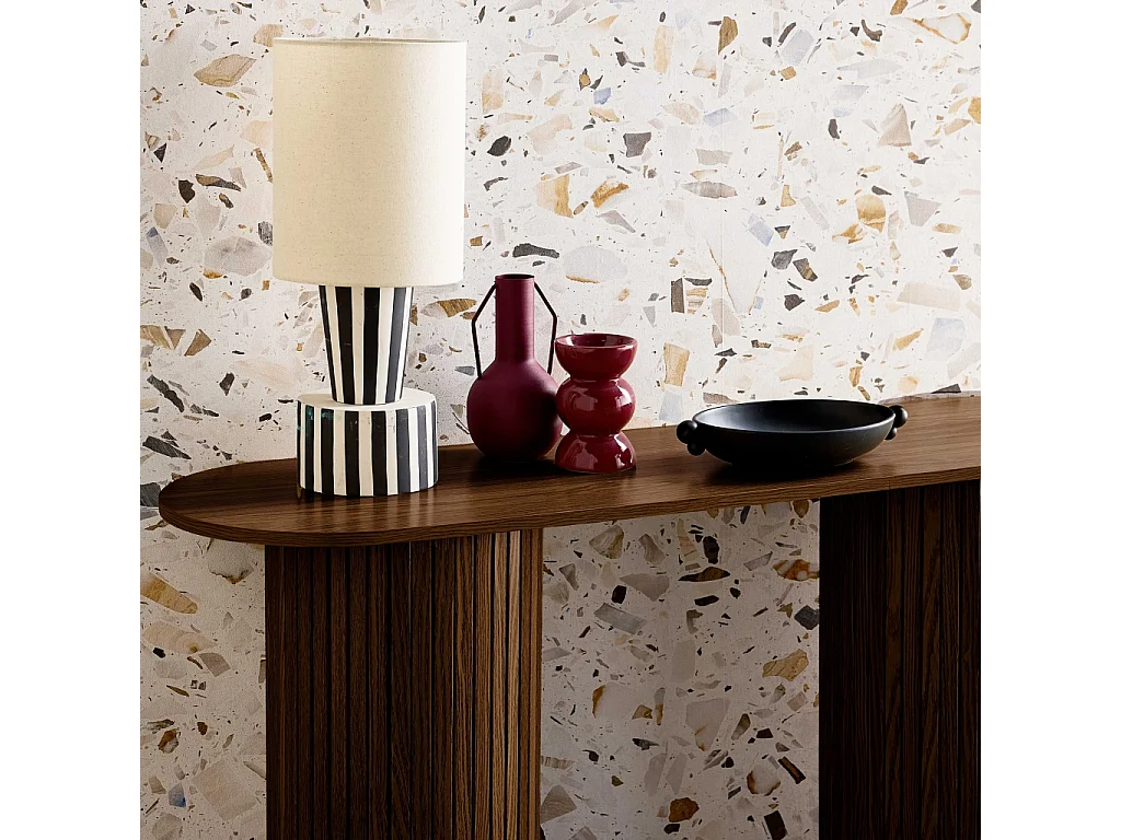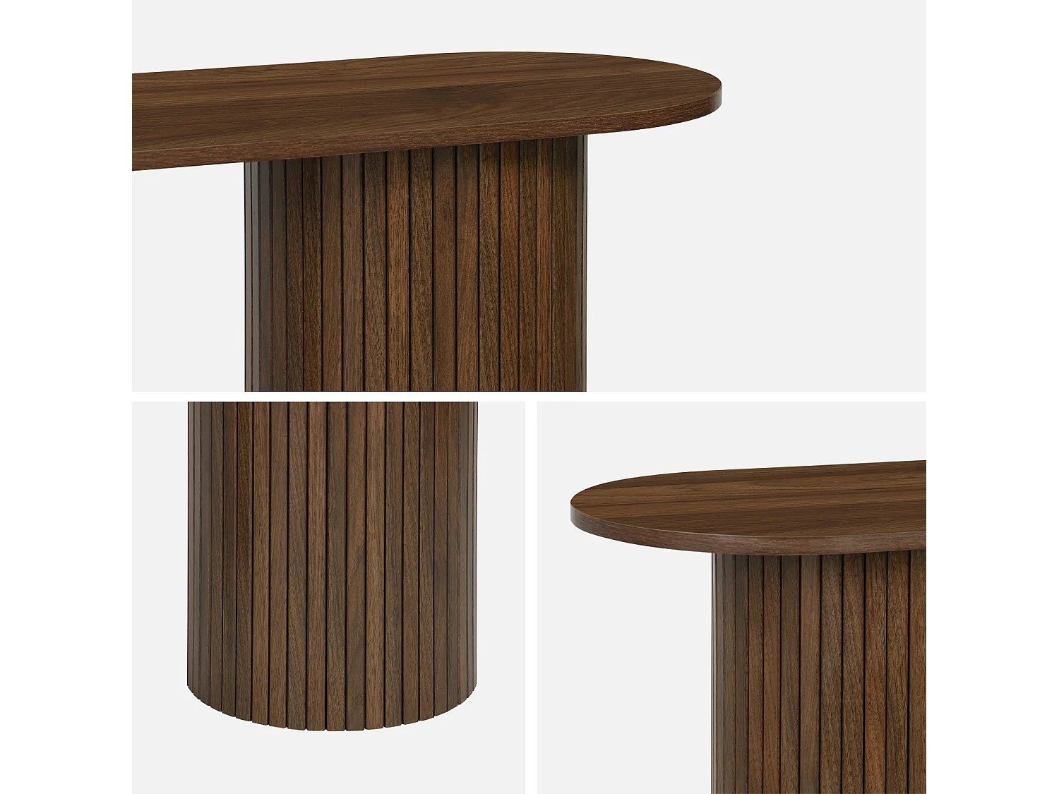 Console ovale scandinave décor bois rainuré. pieds ronds. couleur noyer. L 120 x P 35 x H 75cm