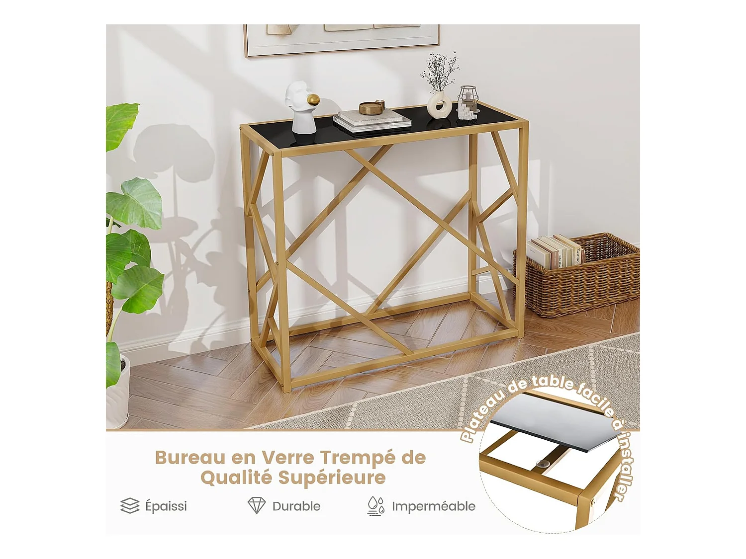 Console fixe design en acier doré et verre trempé Kizoa 120cm