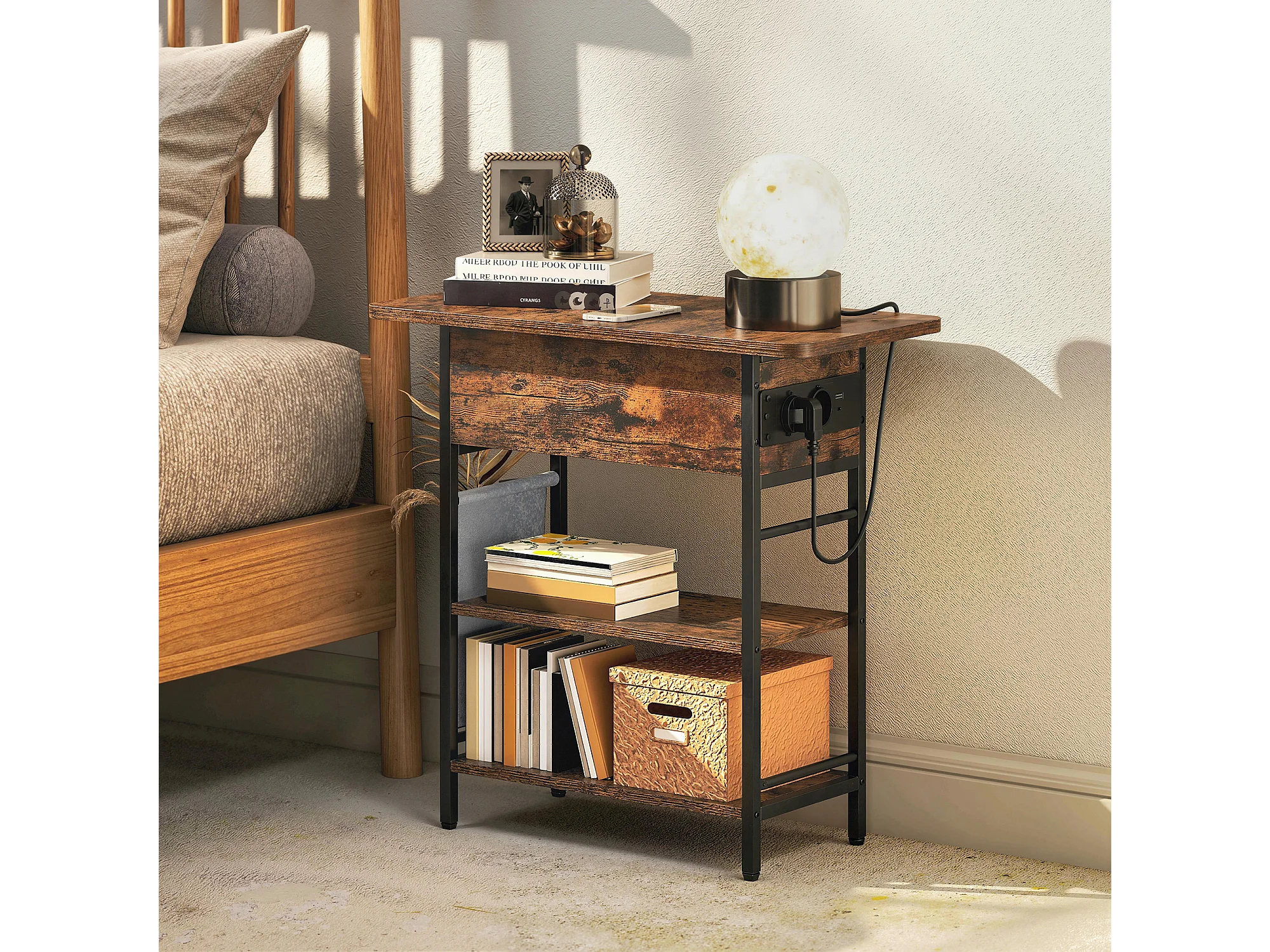 Console style industriel avec station de charge prises secteur et USB dim. 60 x 30 x 58,5 cm métal noir effet bois vieilli