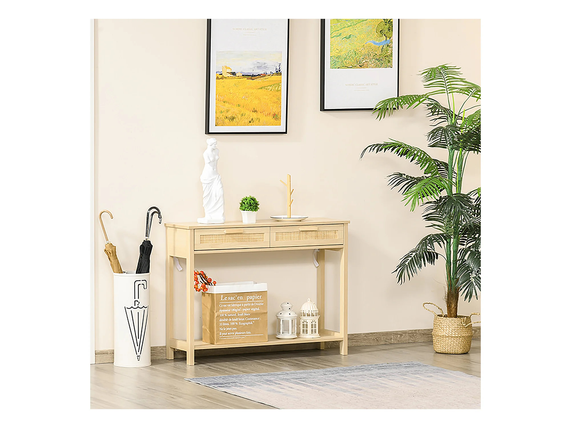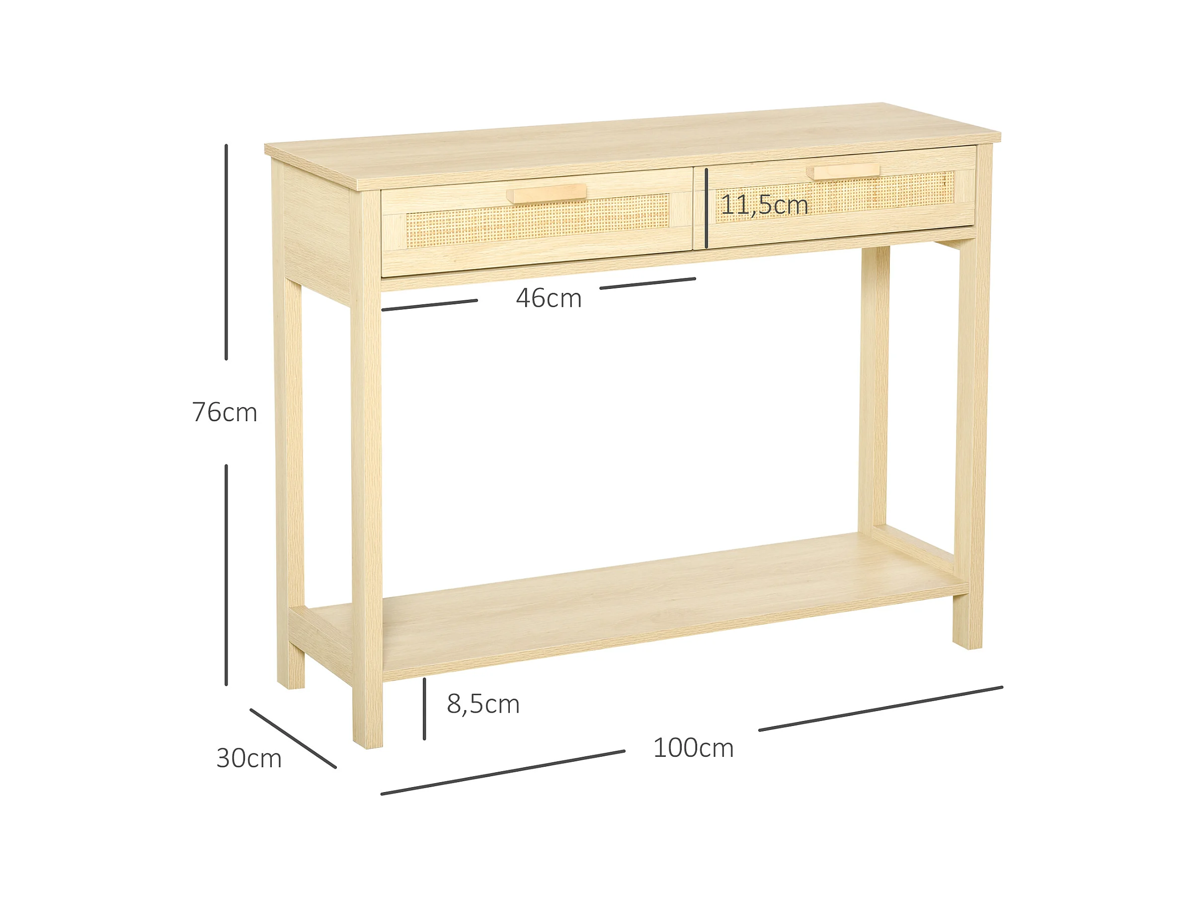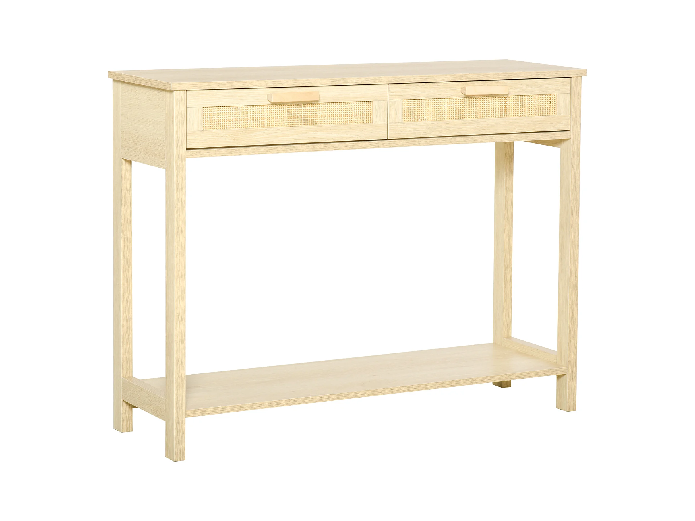 Console table d'appoint dim. 100L x 30l x 76H cm 2 tiroirs façades cannage en rotin étagère MDF aspect bois clair