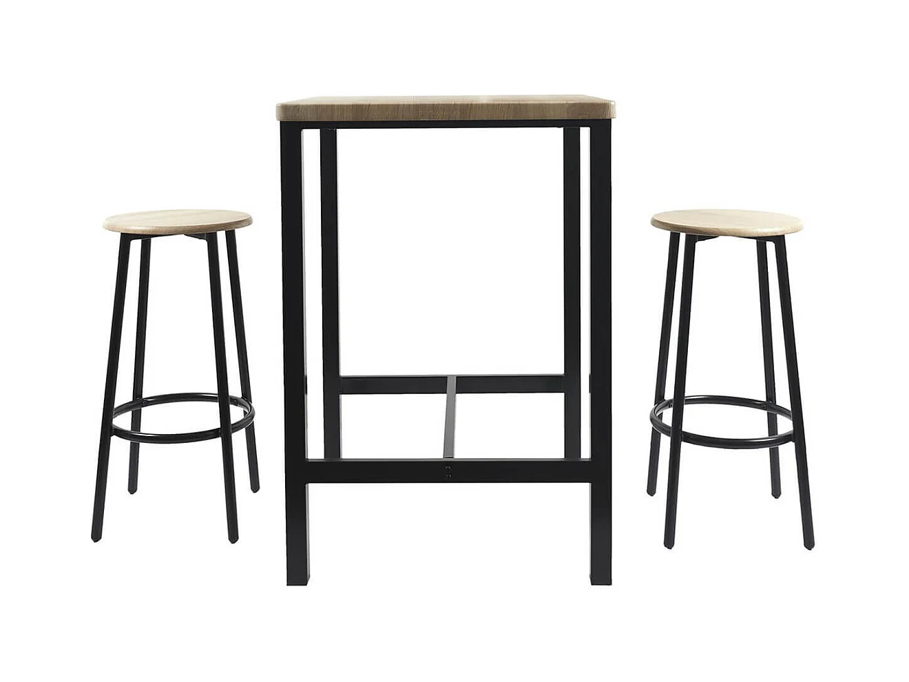 Ensemble 2 places 3 pièces design contemporain - table de bar, 2 tabourets de bar - acier noir aspect bois vieilli