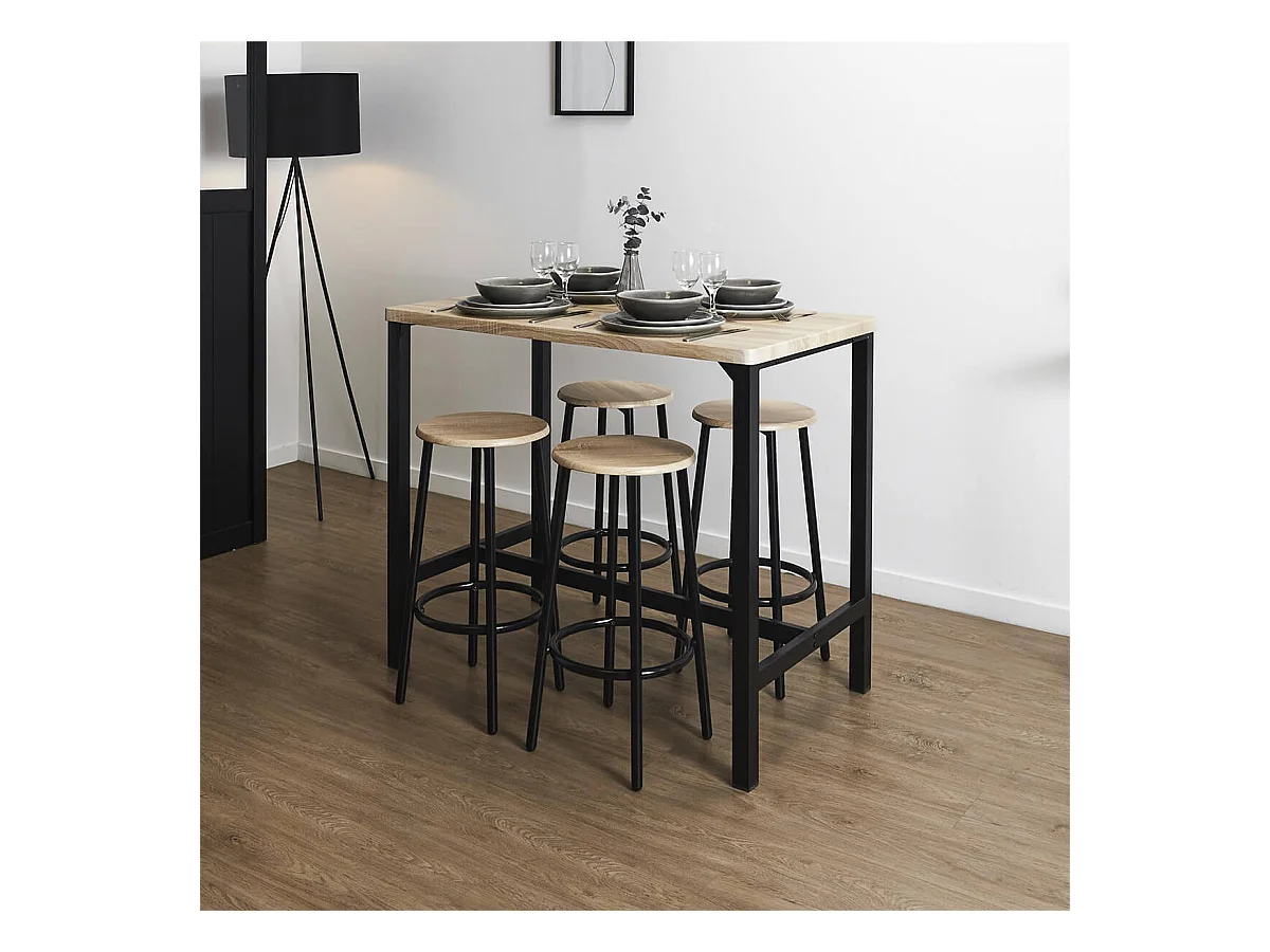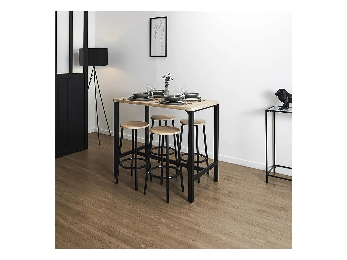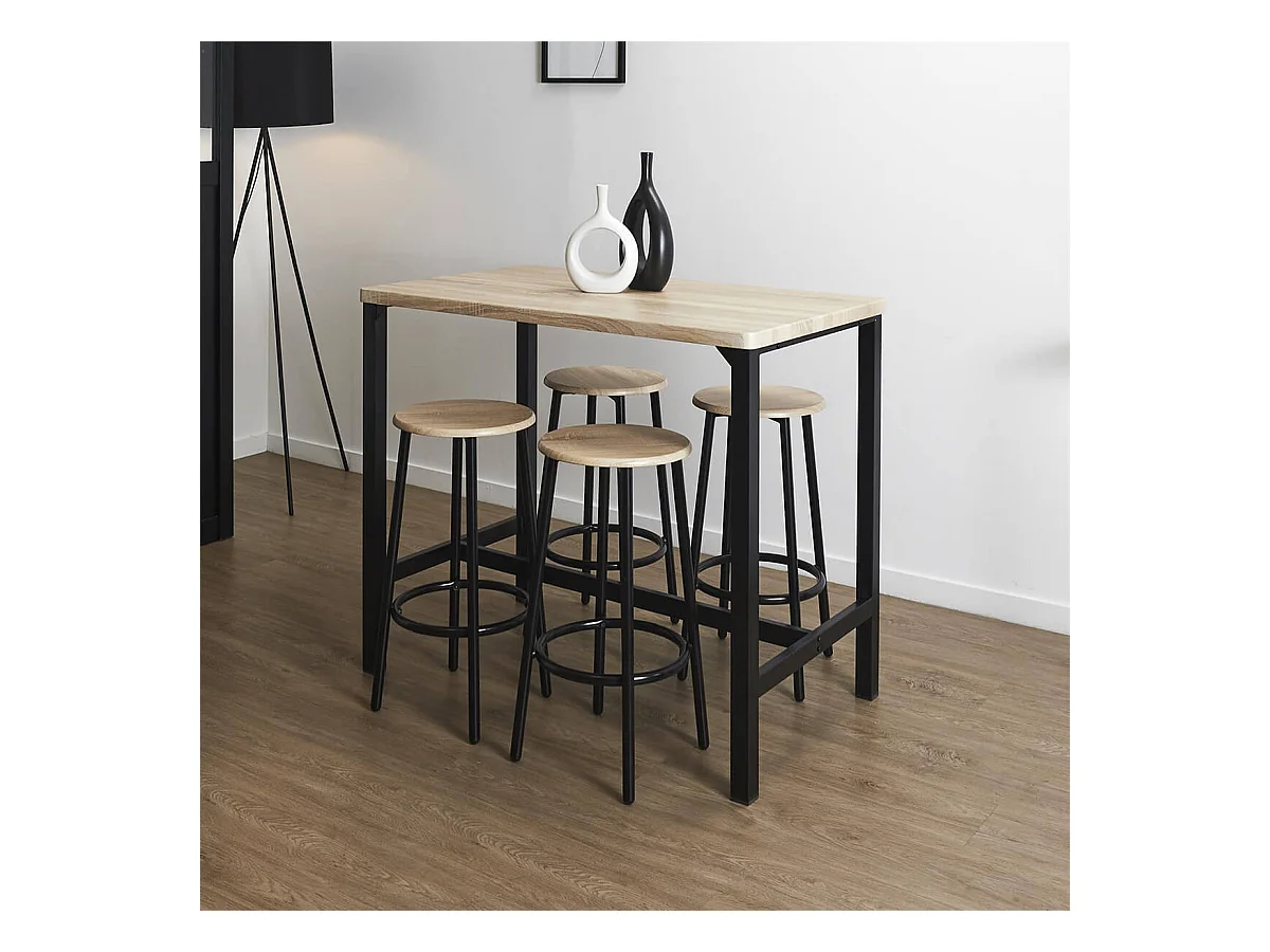 CORTEZ - Ensemble Table Haute et 4 Tabourets en MDF et Pieds Métal Noir