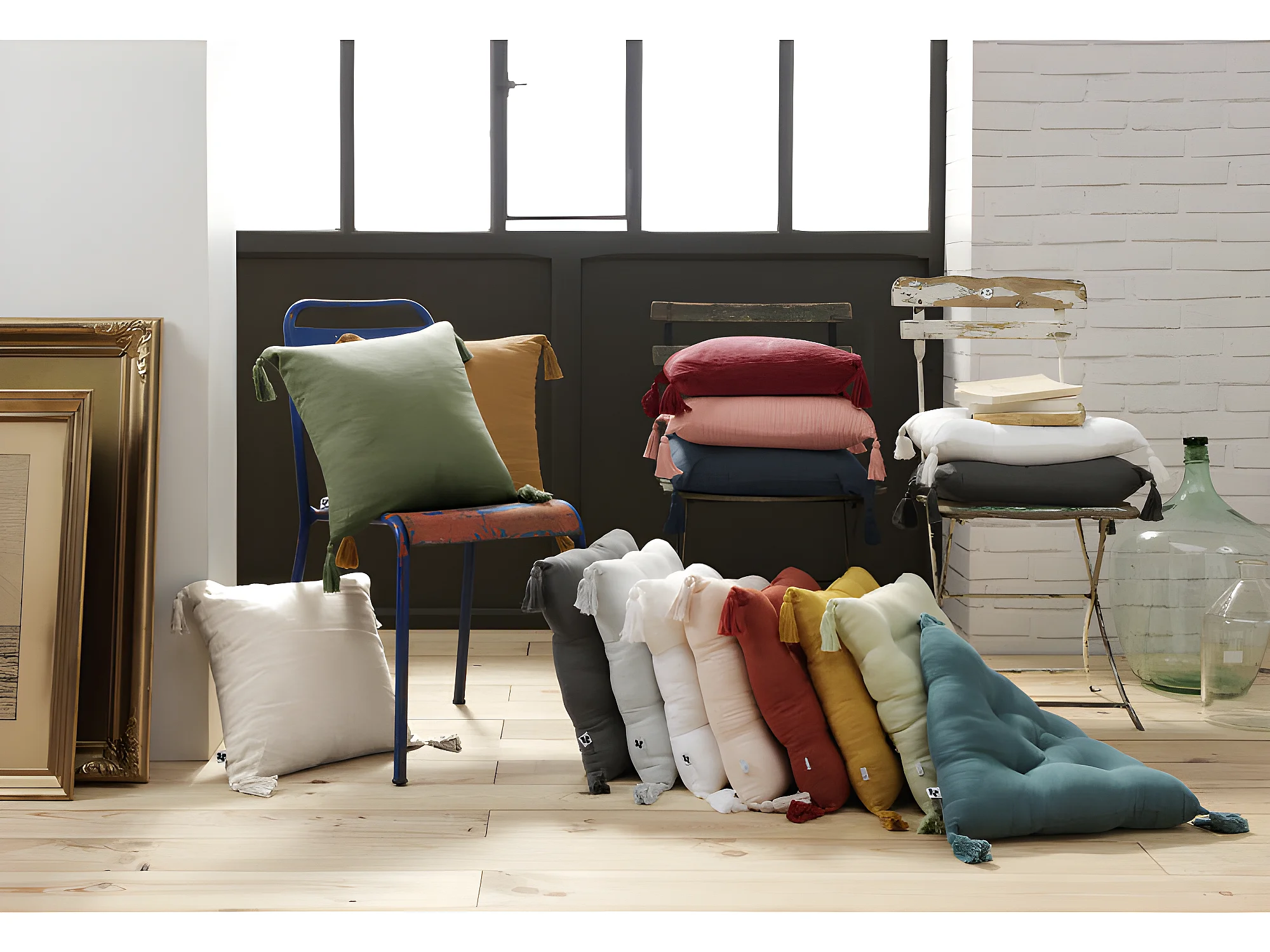 Coussin capitonné 5 points avec pompons "Gaïa" 40 x 40 cm "Gaze de Coton"