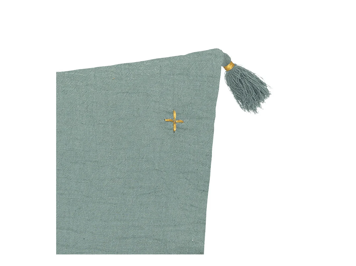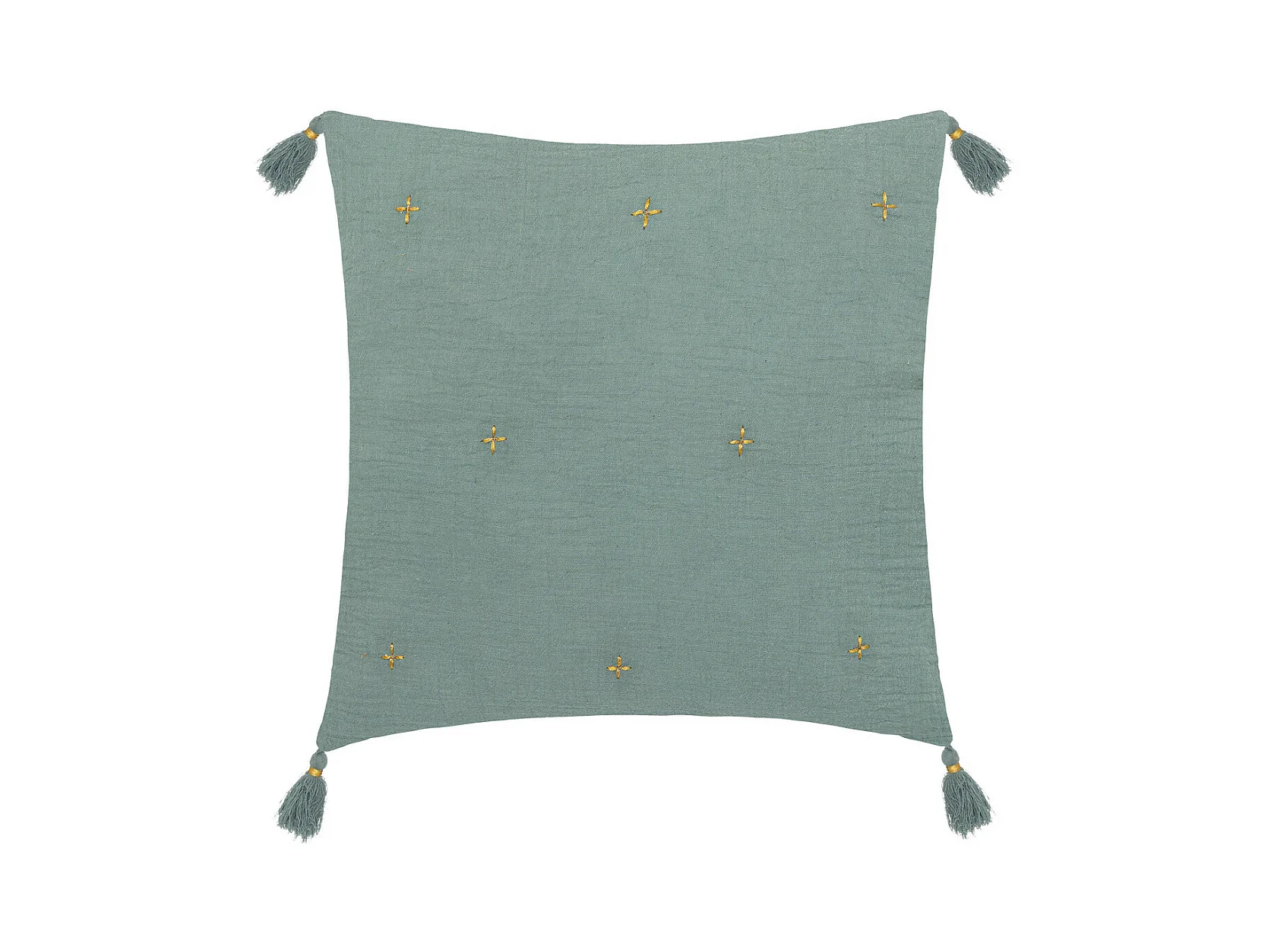 Coussin décoratif Vert Céladon brodé doré avec pompons 40 x 40 cm
