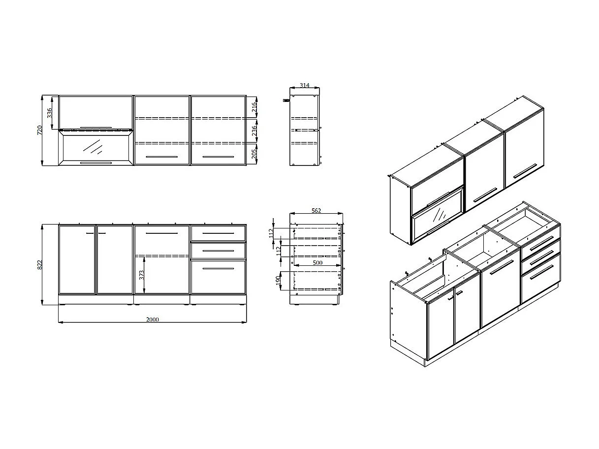 Cuisine 6 éléments couleur Blanc avec plan de travail - Longueur 200 x Profondeur 56/60 x Hauteur 200 cm