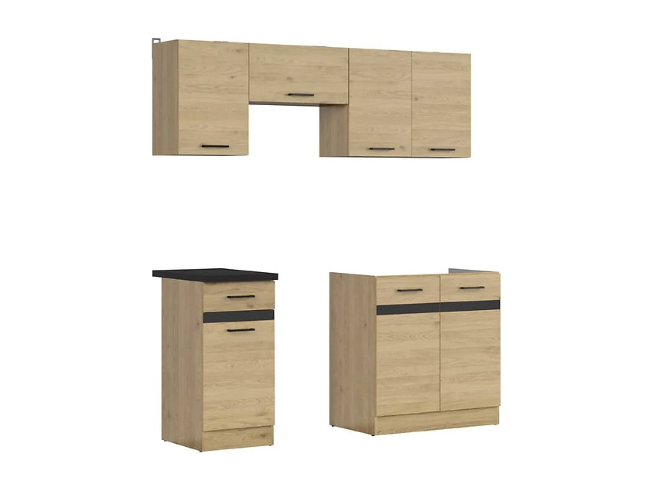 Cuisine complète 180 cm,Ensemble de meuble de cuisine coloris Chêne berstein, plan de travail noir inclus
