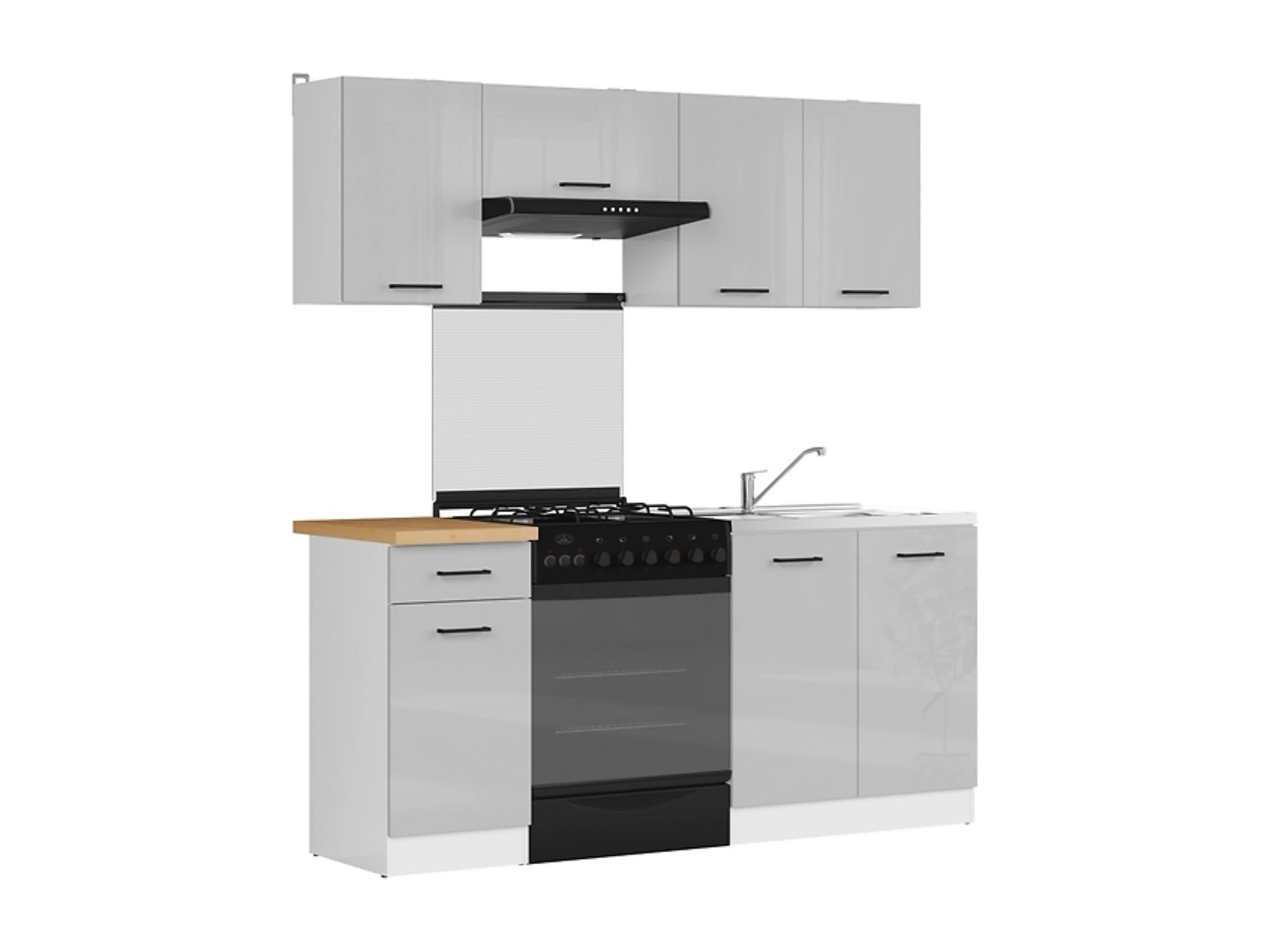 Cuisine complète 180 cm,Ensemble de meuble de cuisine coloris gris clair brillant/blanc, plan de travail coloris Chêne doré inclus