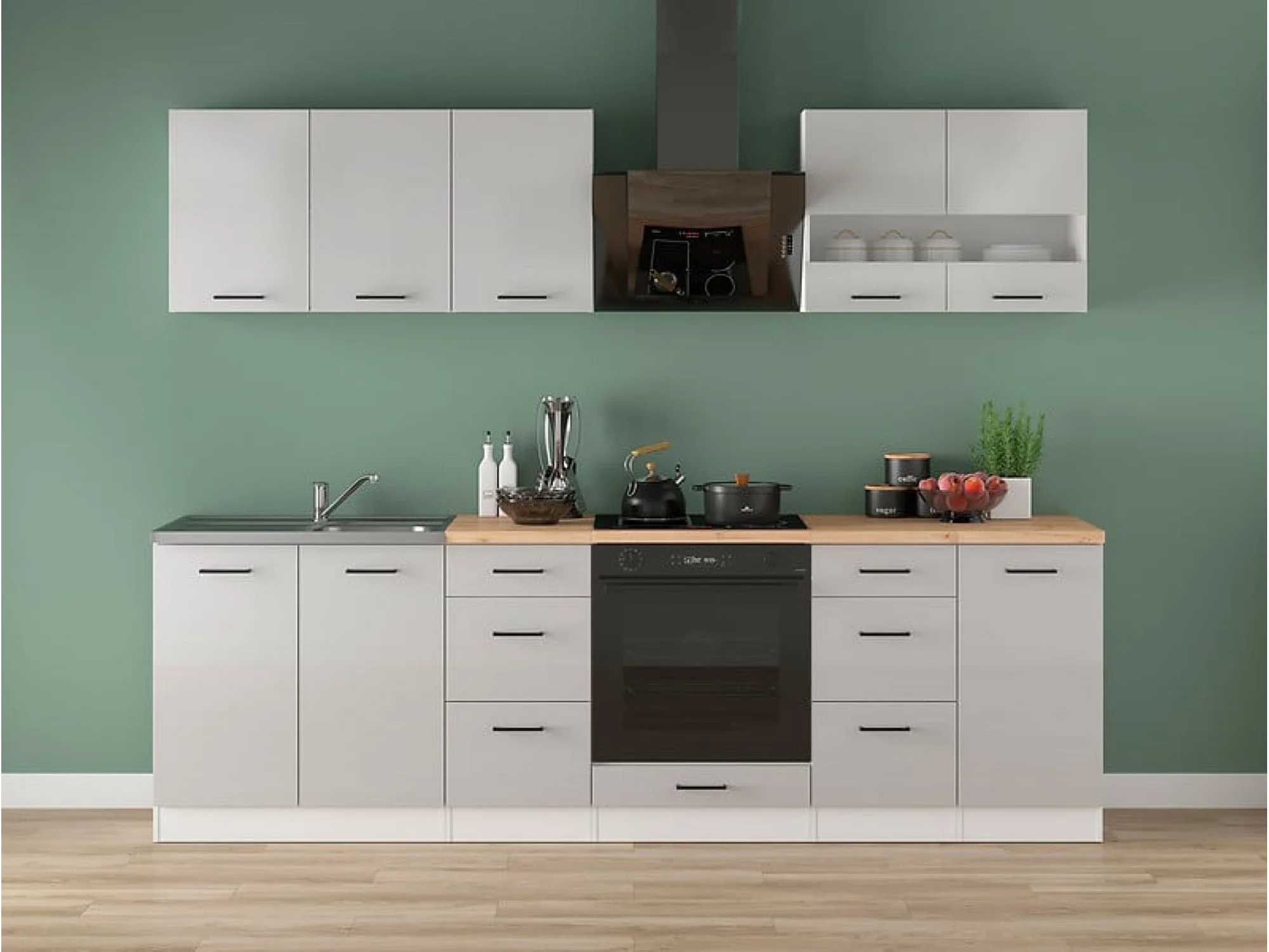 Cuisine complète 260 cm,Ensemble de meuble de cuisine coloris Blanc/Gris clair brillant, plan de travail non inclus