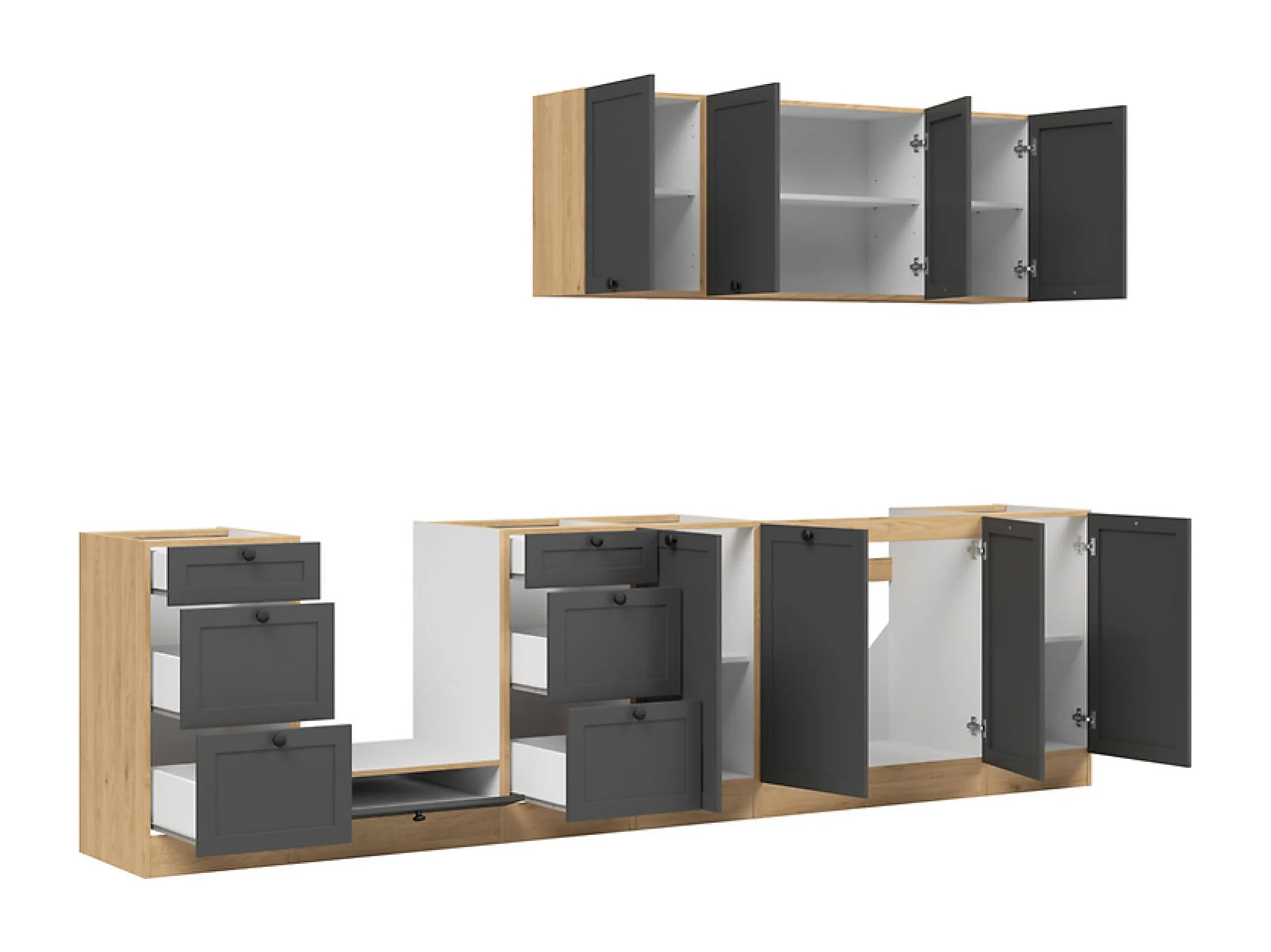 Cuisine complète 300 cm,Ensemble de meuble de cuisine coloris Gris graphite/Chêne bernstien, plan de travail non inclus