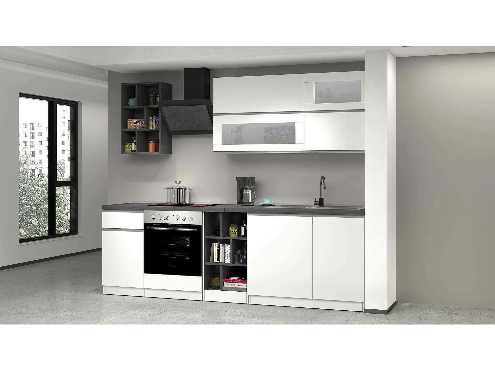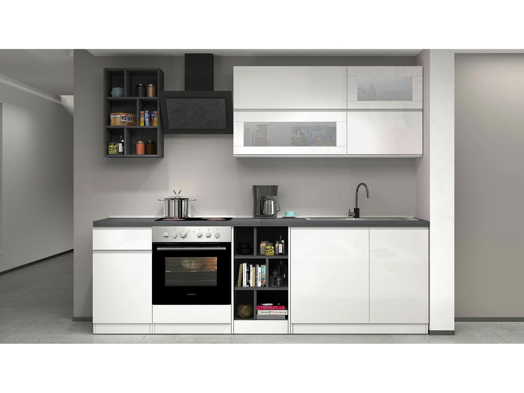 Cuisine complète Dcastill, Ensemble avec garde-manger, Meuble de kitchenette, Kit bloc linéaire, 100% Made in Italy, 255x60h85 cm, Blanc brillant et ardoise