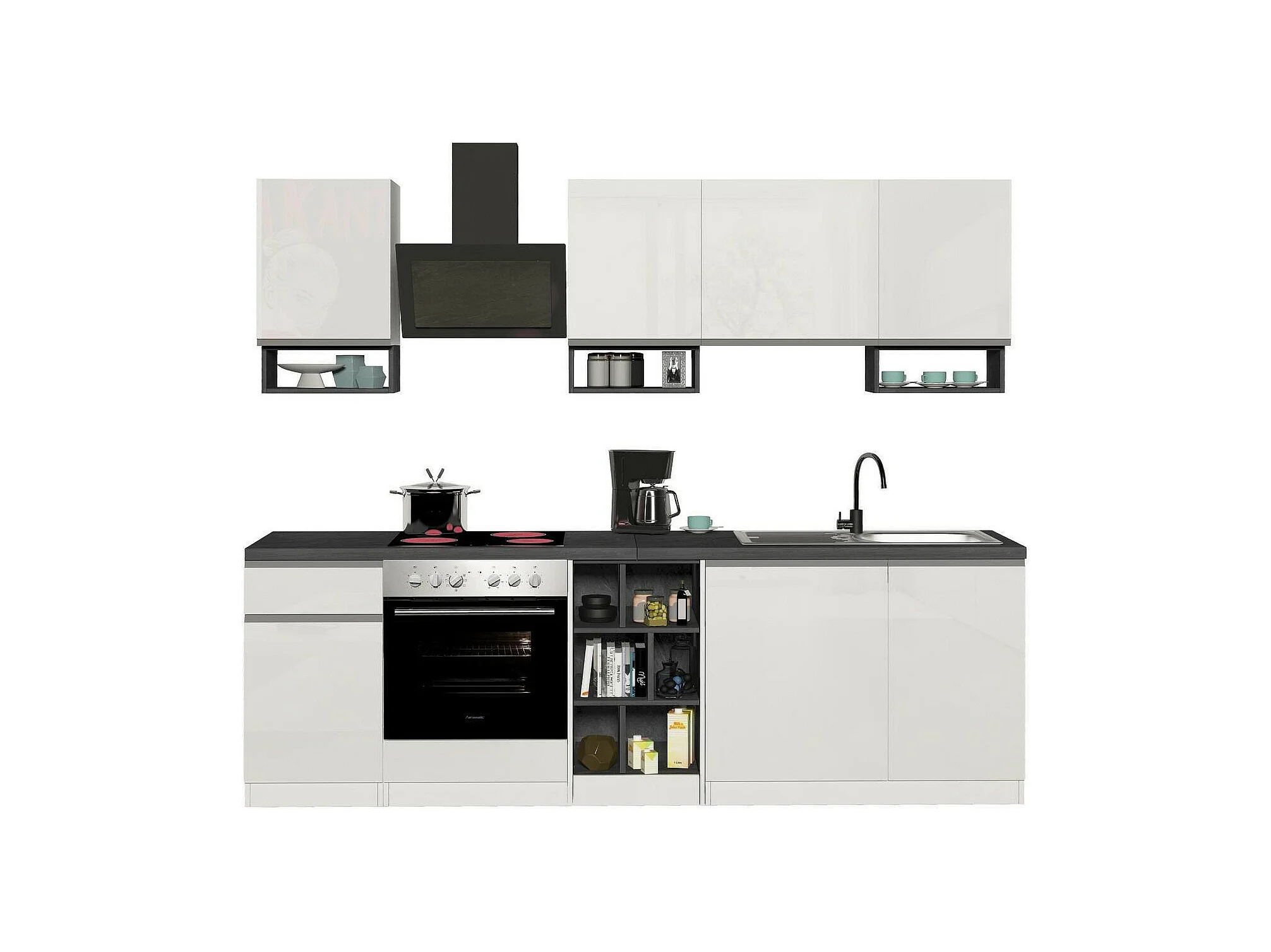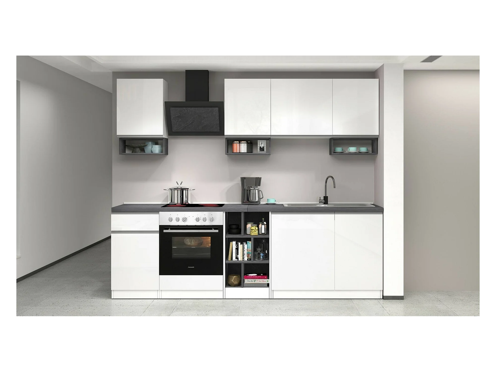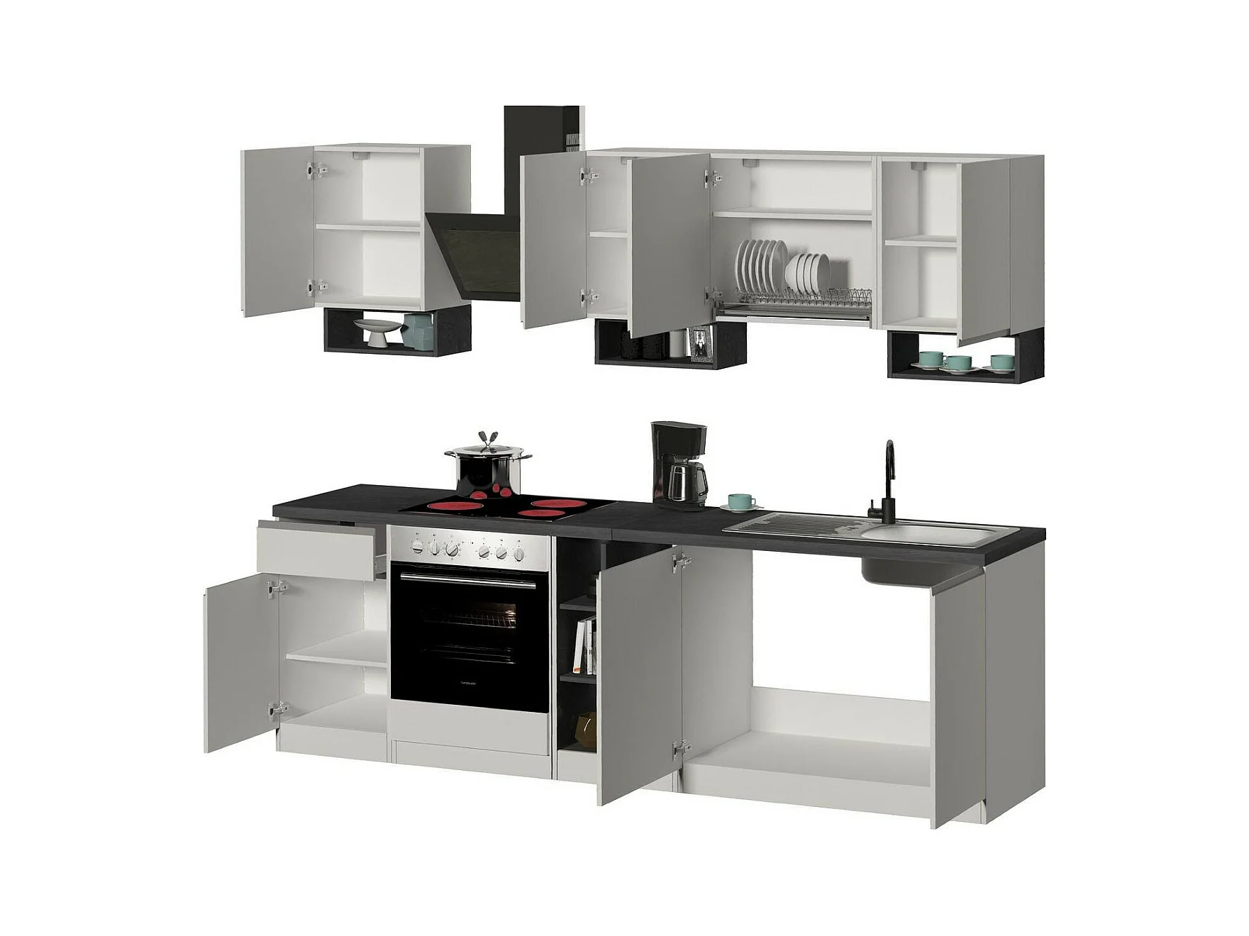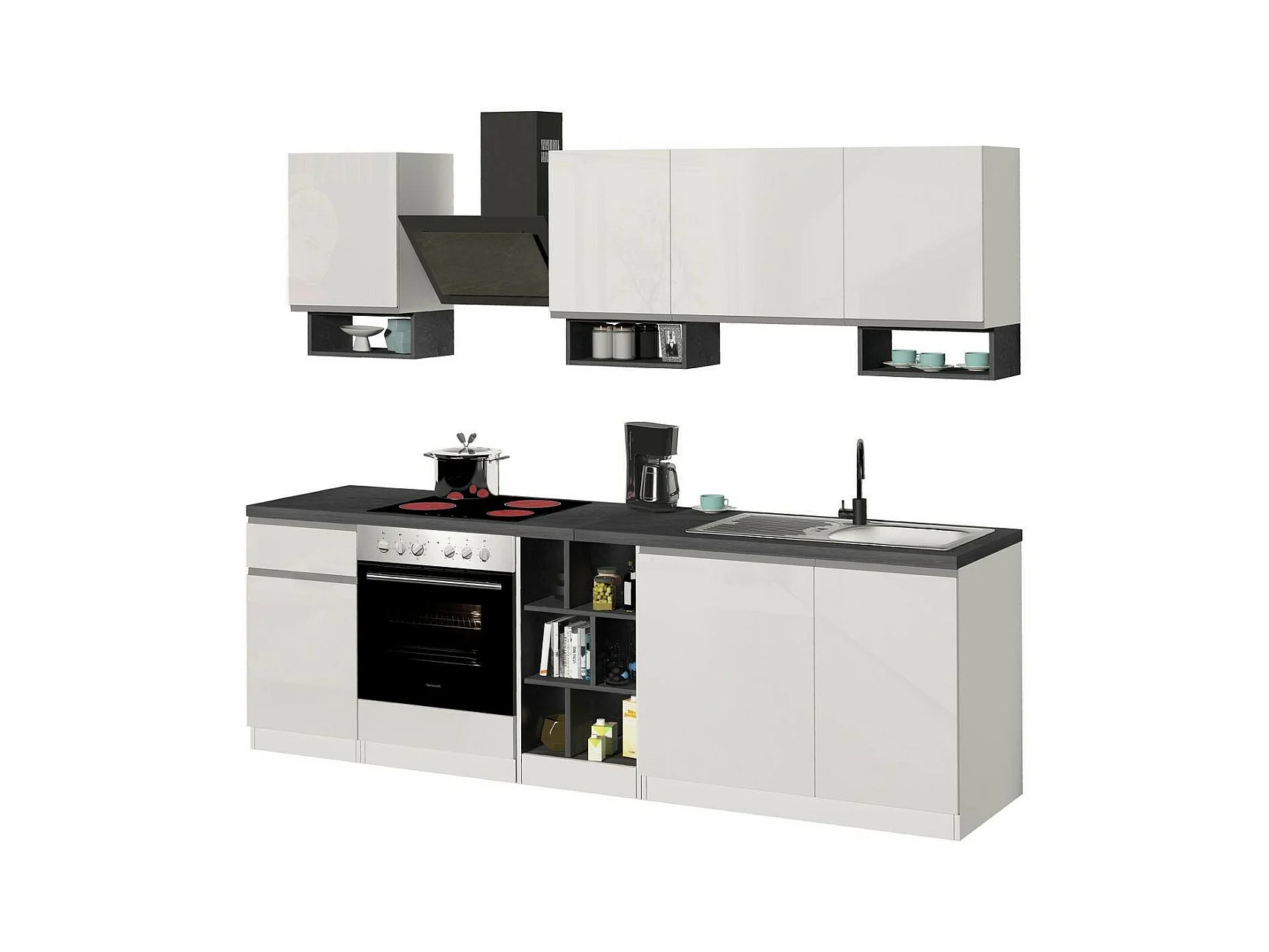Cuisine complète Dcelient, Ensemble avec garde-manger, Meuble de kitchenette, Kit bloc linéaire, 100% Made in Italy, 255x60h85 cm, Blanc brillant et ardoise
