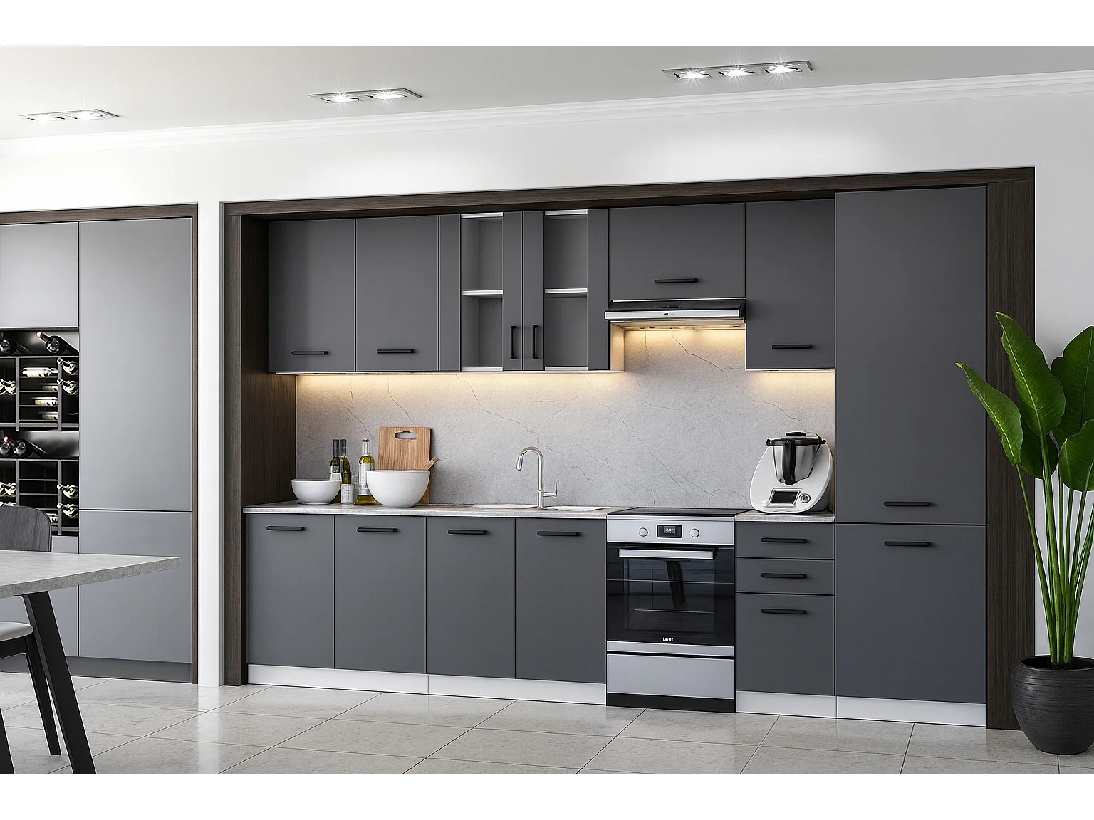 Cuisine complète Jolly GRIS graphite 320 cm avec colonne et vitrine 8 éléments