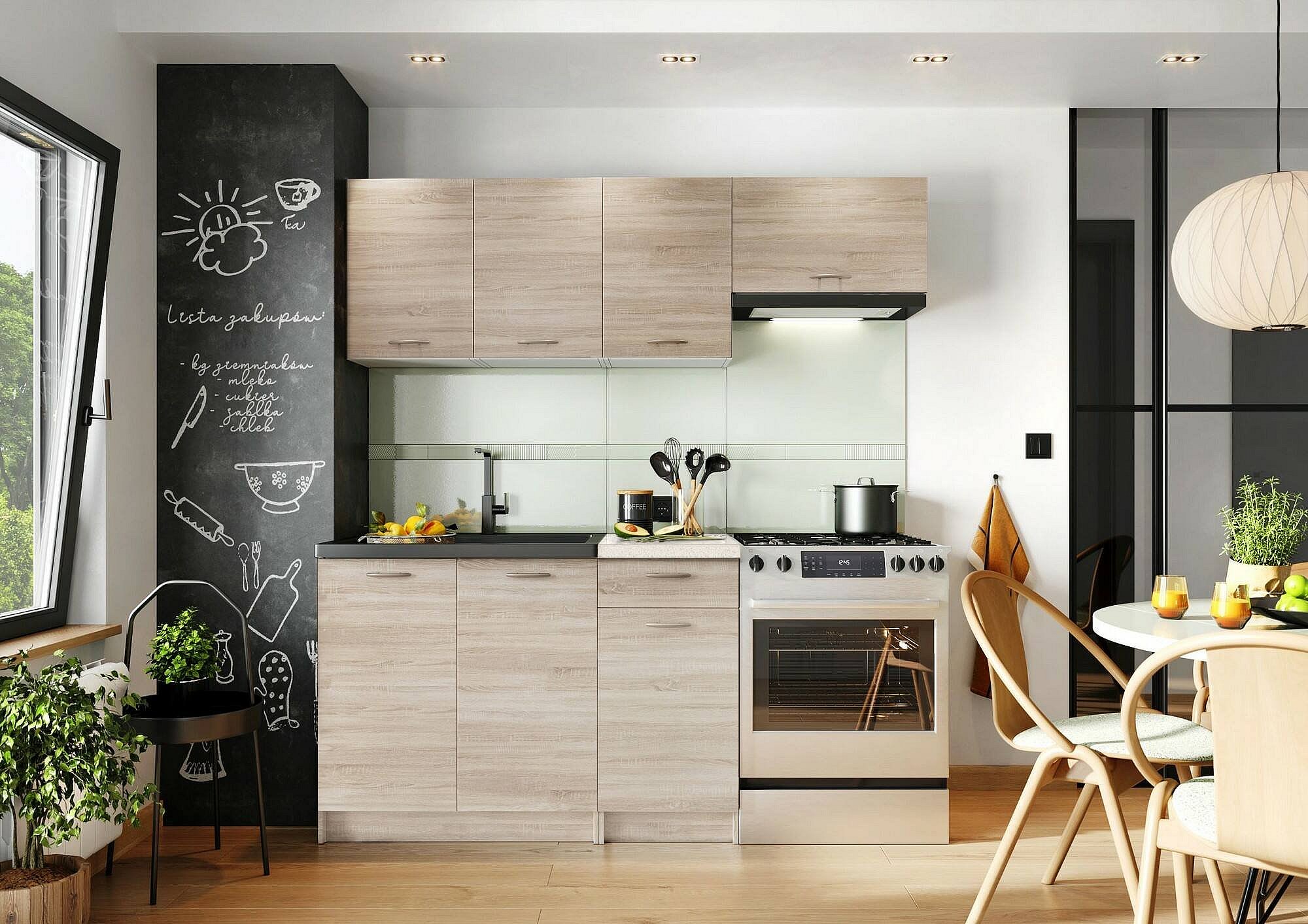 CUISINE COMPLÈTE - Ensemble compact et fonctionnel avec éléments hauts et bas, portes et tiroir - Son style minimaliste et son design moderne le rendent idéal pour meubler n'importe quelle pièce avec des exigences d'espace - Chêne. STRUCTURE ET UTILISATION - Rendez votre cuisine fonctionnelle avec ces meubles design compacts et essentiels, conçus pour les appartements avec des besoins d'espace - Fonctionnalité maximale dans un espace minimum : cette cuisine compacte au design moderne est la solution idéale pour les environnements urbains, les studios ou les petits appartements - Le mur de la cuisine est parfait pour mieux organiser la préparation des repas et contenir les appareils électroménagers - Le garde-manger est un meuble multifonctionnel pratique, idéal pour ranger la vaisselle, la nourriture, les boissons. DIMENSIONS EN CM - Cuisine complète : Longueur : 180 Largeur : 180 Hauteur : 200. CARACTÉRISTIQUES TECHNIQUES - Cuisine composée d'éléments hauts avec portes battantes et abattantes, d'éléments fixes avec portes battantes et tiroir, étagères intérieures incluses - Pratique : les portes et les tiroirs sont équipés de poignées, pour faciliter l'ouverture du meuble - Inclus : Prédisposition pour l'évier (perçage) - Non inclus : Évier encastrable (compatible avec un évier de 80x60 cm), réfrigérateur, four, plaque de cuisson, hotte, mitigeur, divers appareils électroménagers - Adapté à tout type de plaque de cuisson, le perçage de la plaque de cuisson est à la charge du client en fonction de ses besoins - Solide et robuste : le produit est entièrement réalisé en panneau mélaminé - Emballage résistant, conçu pour le commerce électronique. QUALITÉ ET DESIGN - Enrichissez votre maison avec ce meuble, parfait pour meubler un environnement contemporain et lumineux - Idéal pour ceux qui recherchent la fonctionnalité, ce produit est parfait pour les appartements de toutes tailles - Garantie de deux ans à compter de la date d'achat
