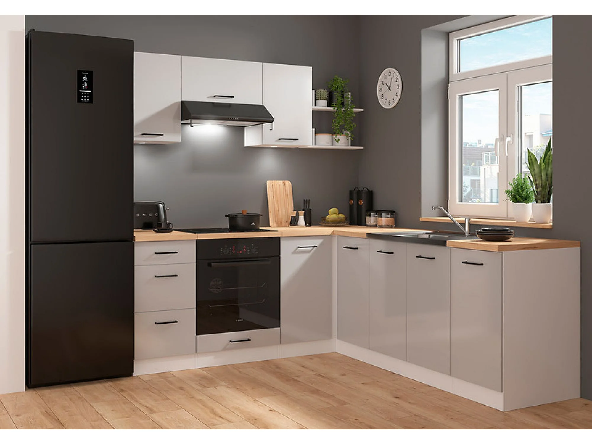 Cuisine d'angle complète 200x220 cm, Meubles de cuisine modulables coloris Gris clair brillant/Blanc, plan de travail Non inclus