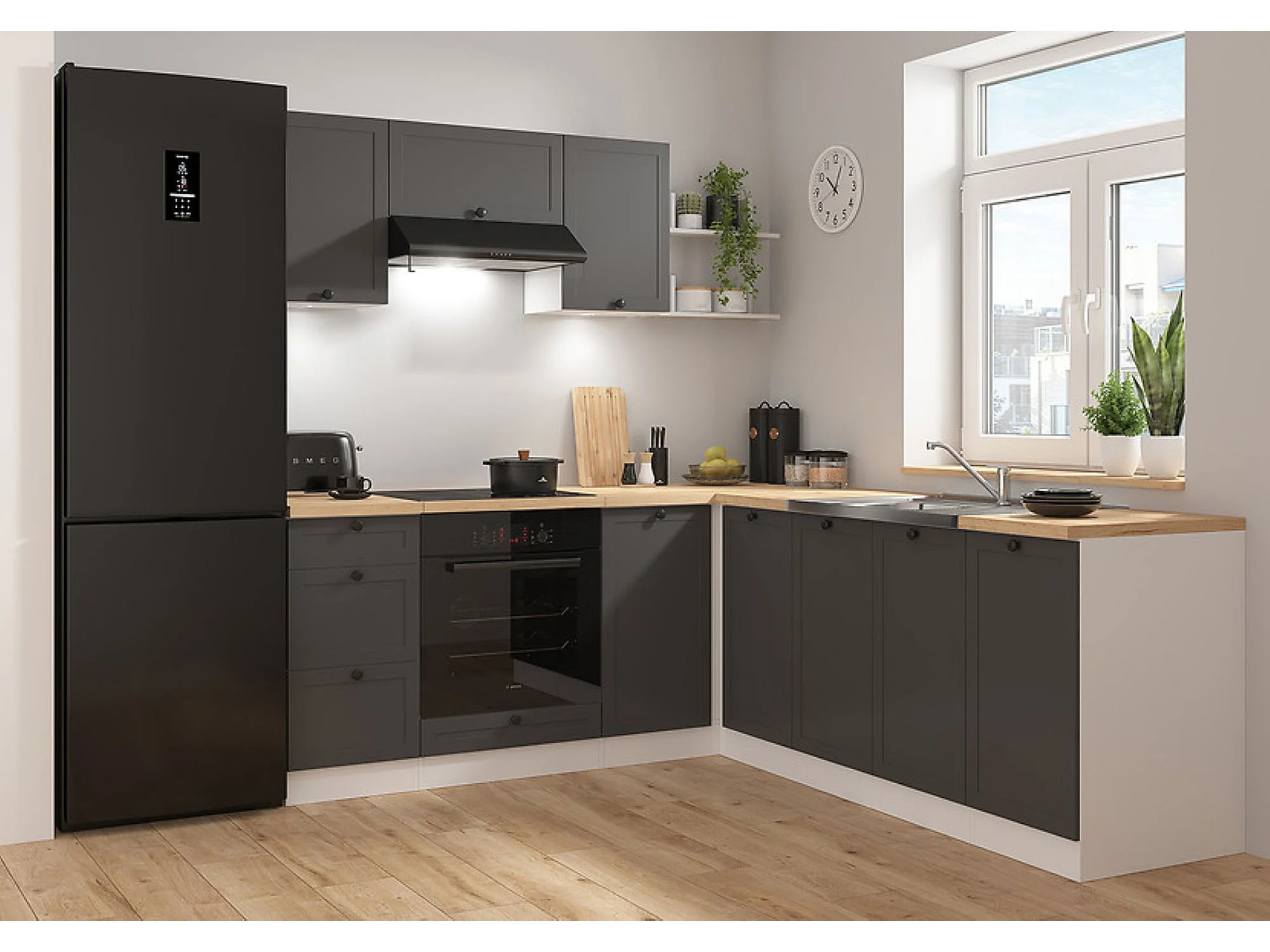 Cuisine d'angle complète 200x220 cm, Meubles de cuisine modulables coloris Gris graphite/Blanc, plan de travail Non inclus