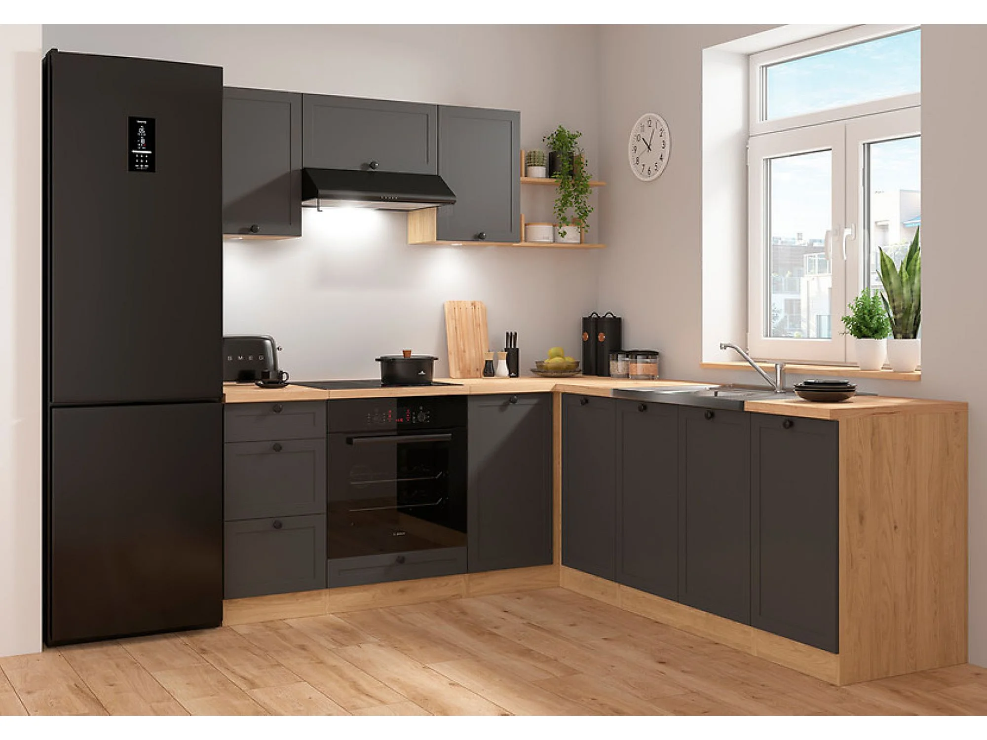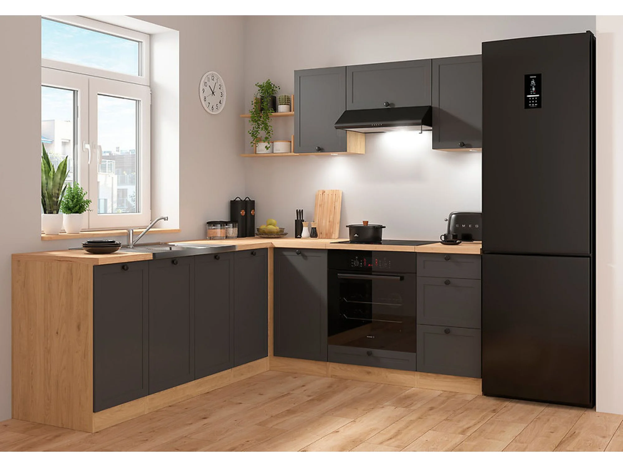 Cuisine d'angle complète 200x220 cm, Meubles de cuisine modulables coloris Gris graphite/Chêne bernstein, plan de travail Non inclus
