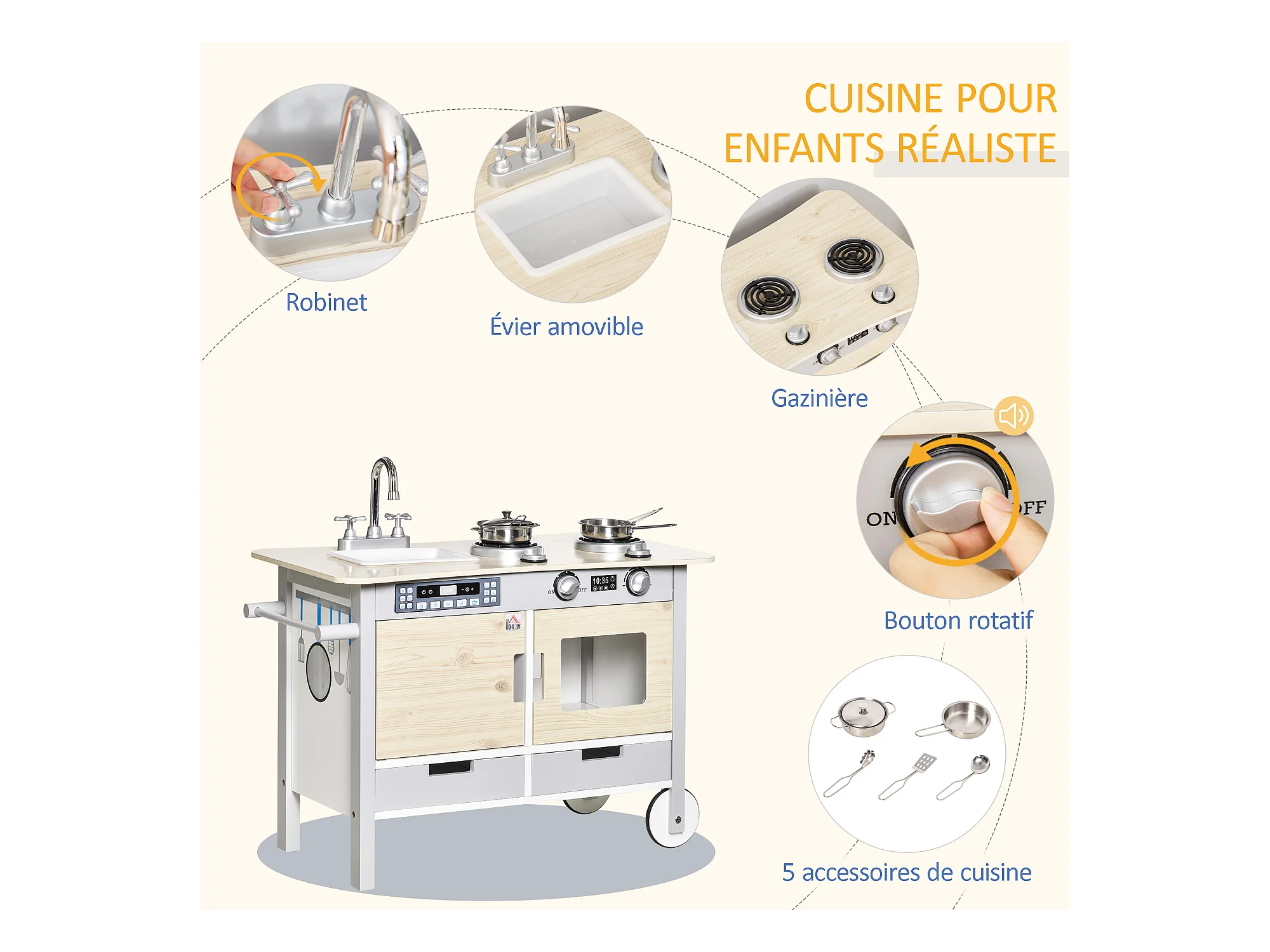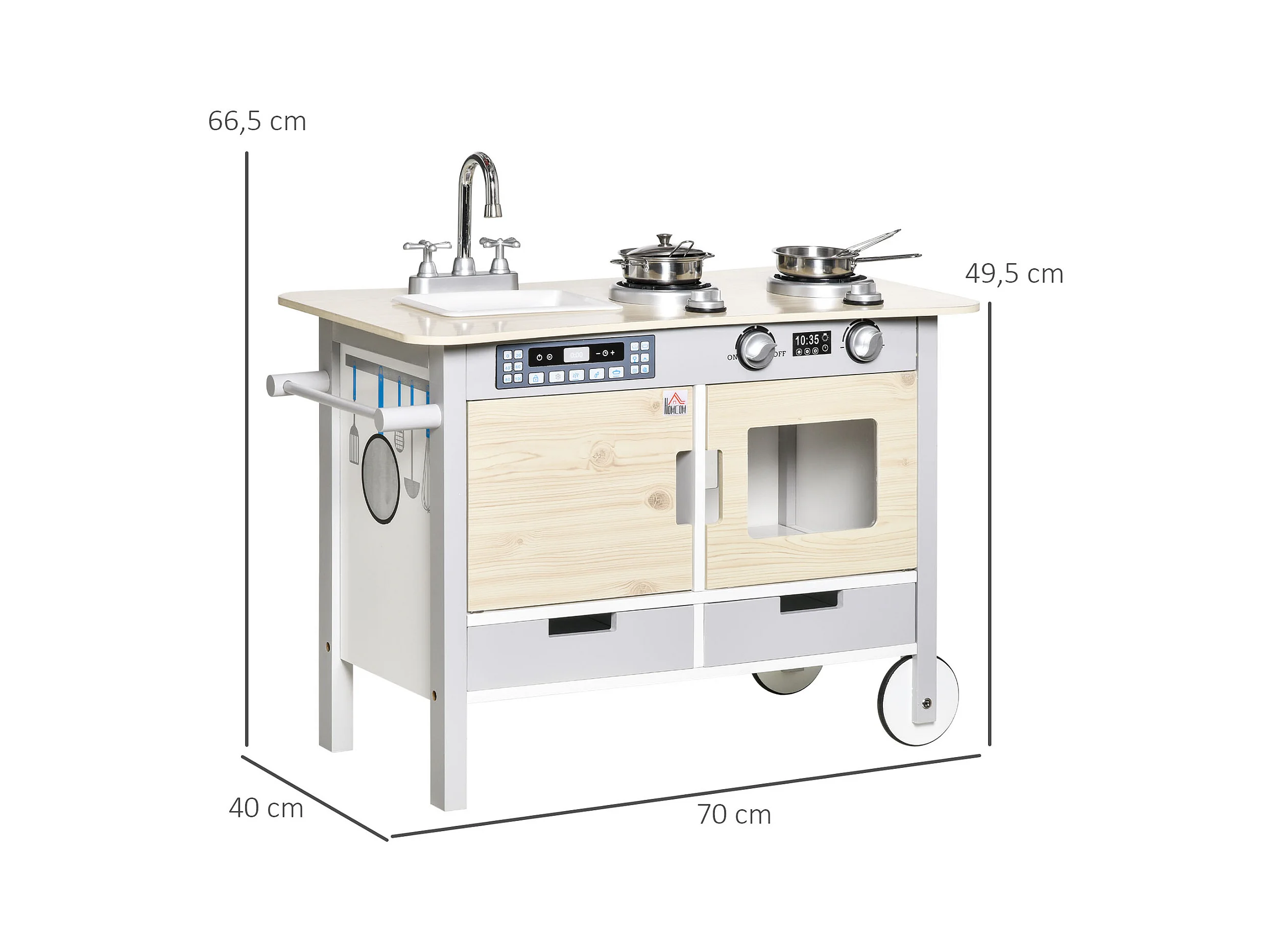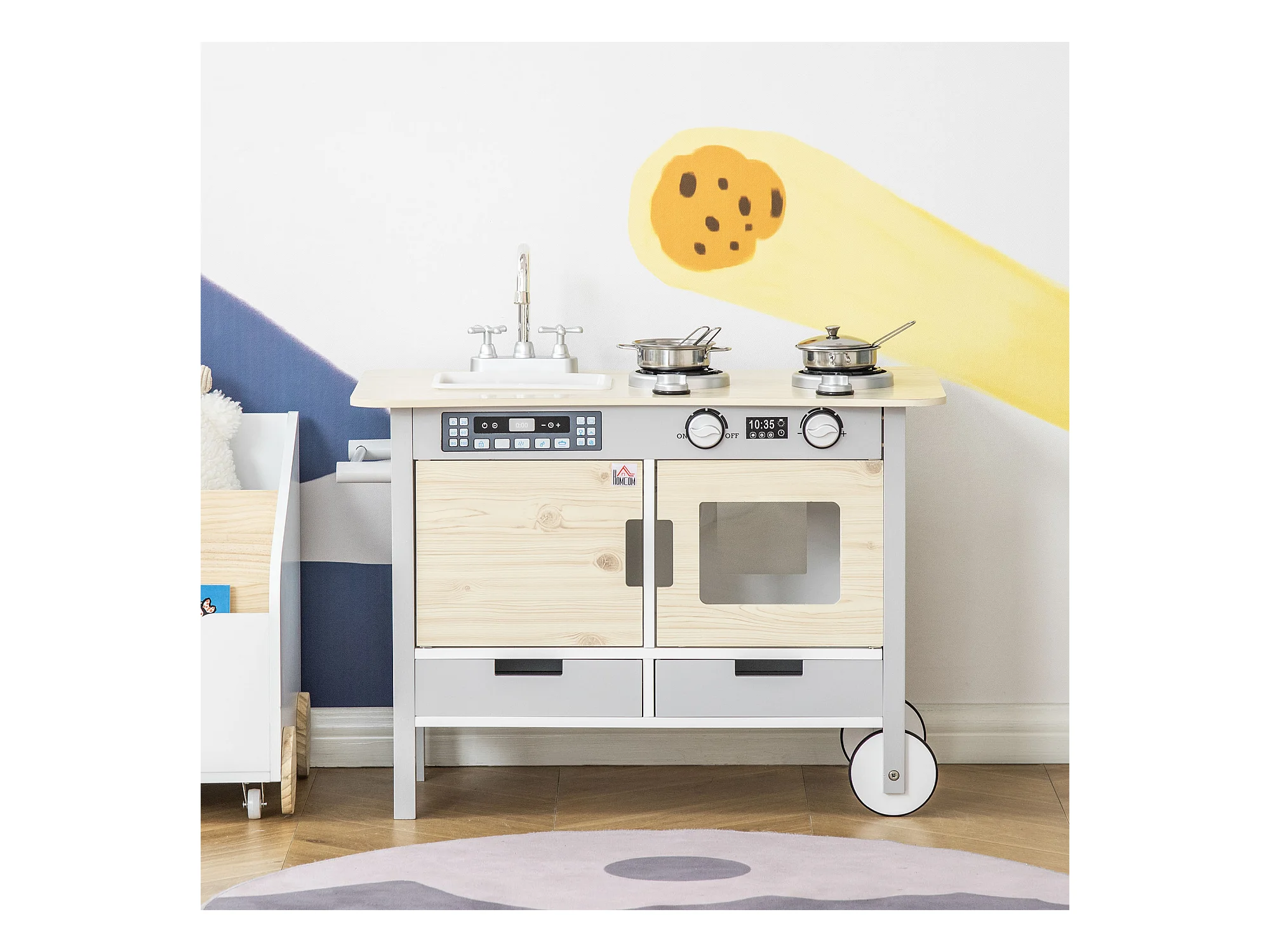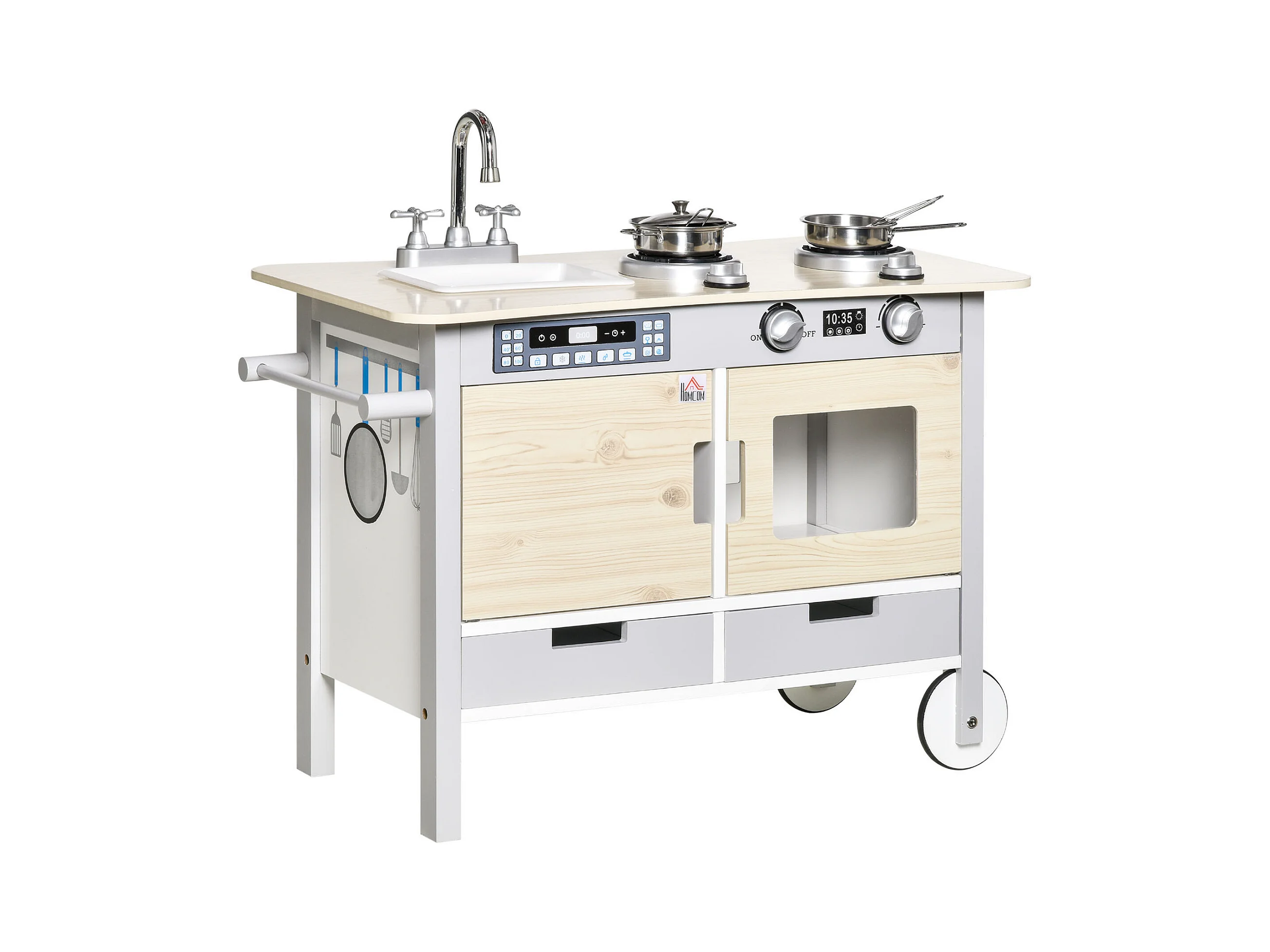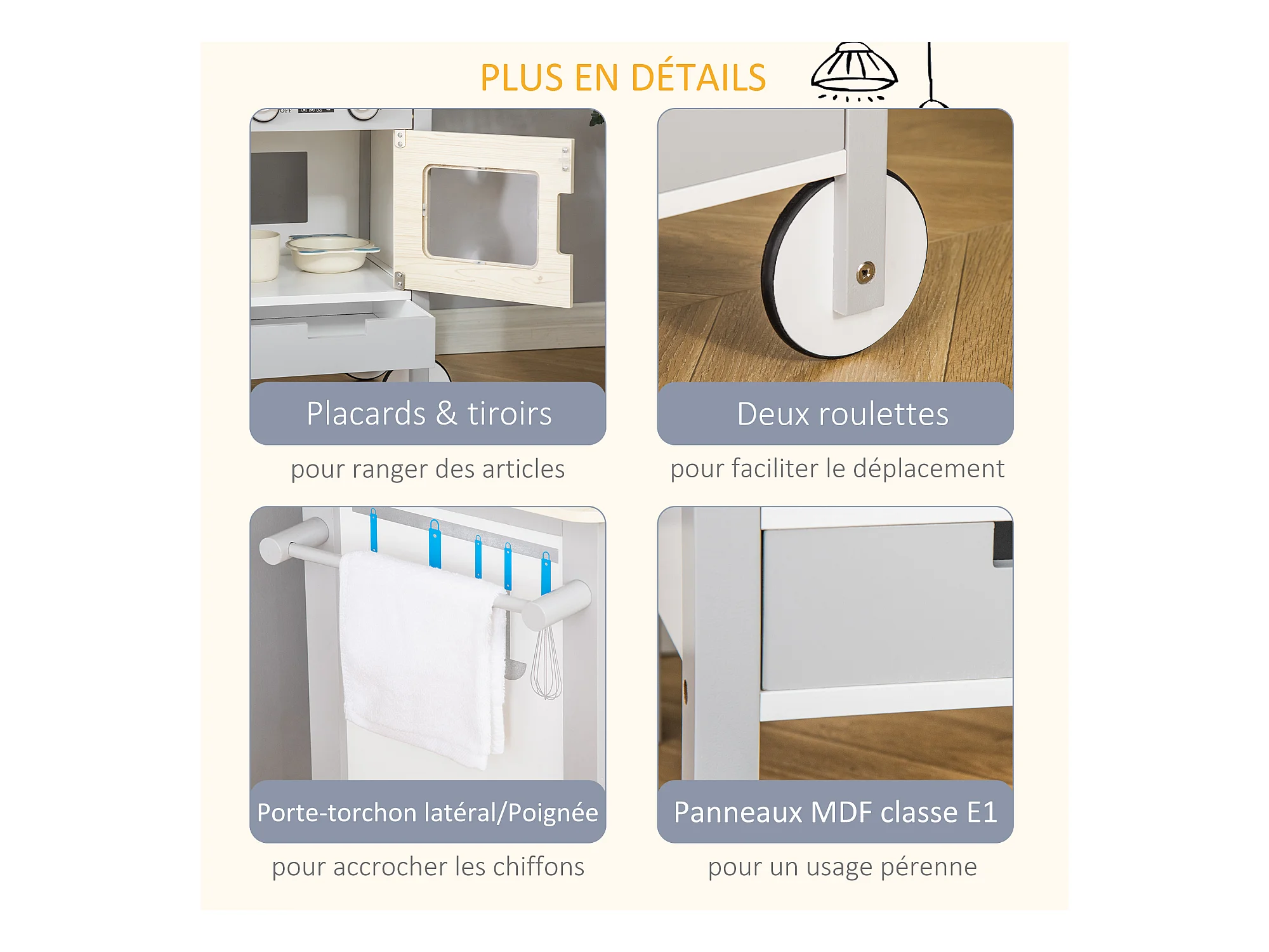 Cuisine desserte pour enfant 2 en 1 multi-équipement avec 5 accessoires acier inox. MDF aspect bois clair gris