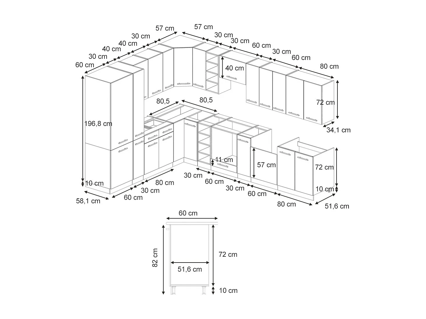 Cuisine en angle bleu clair-gris/blanc 347x60x81.6 fame-line
