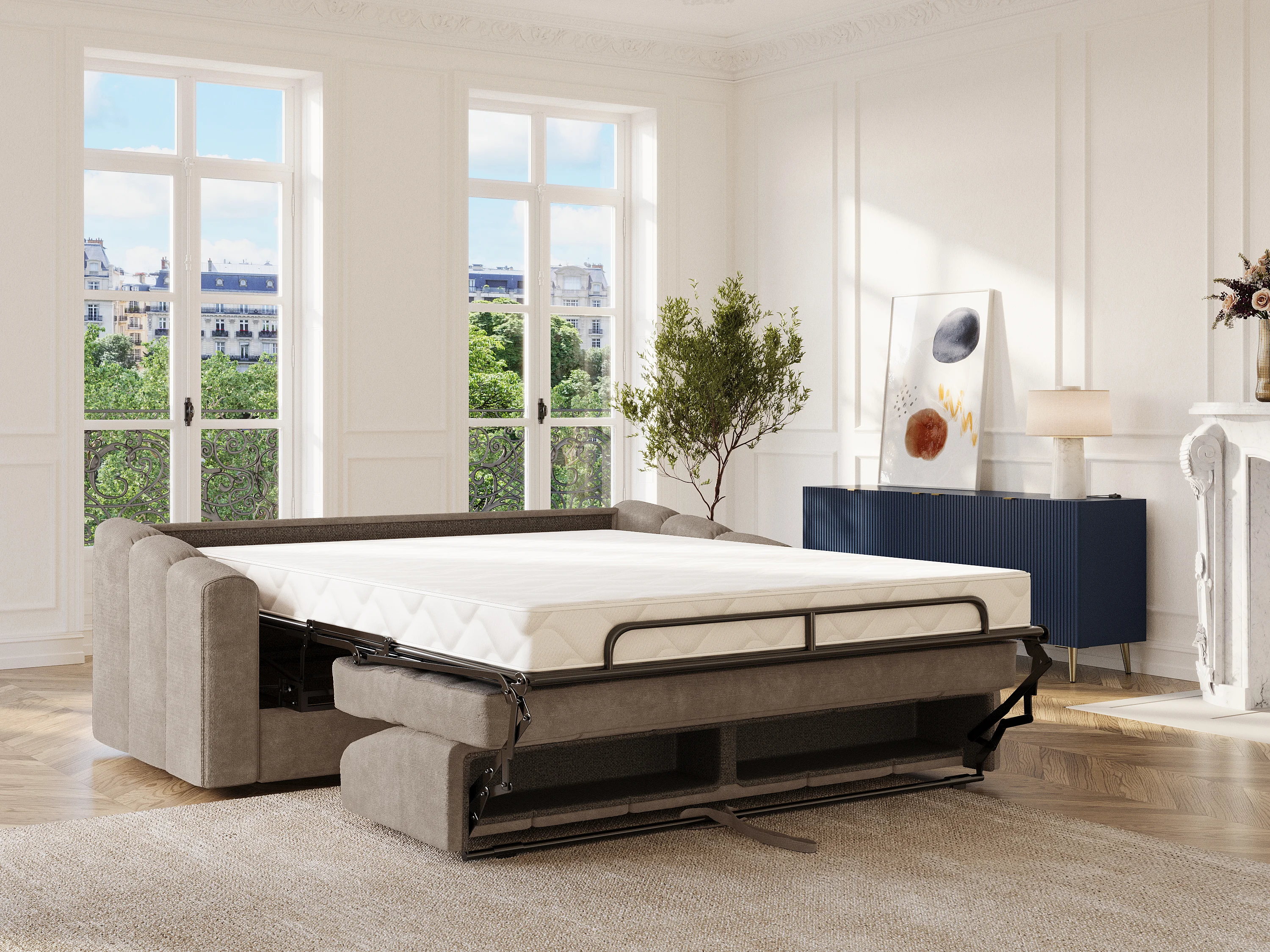 Canapé 3 places convertible express en tissu texturé taupe - Couchage lattes larges 140 cm - Matelas 18 cm - DARIELO