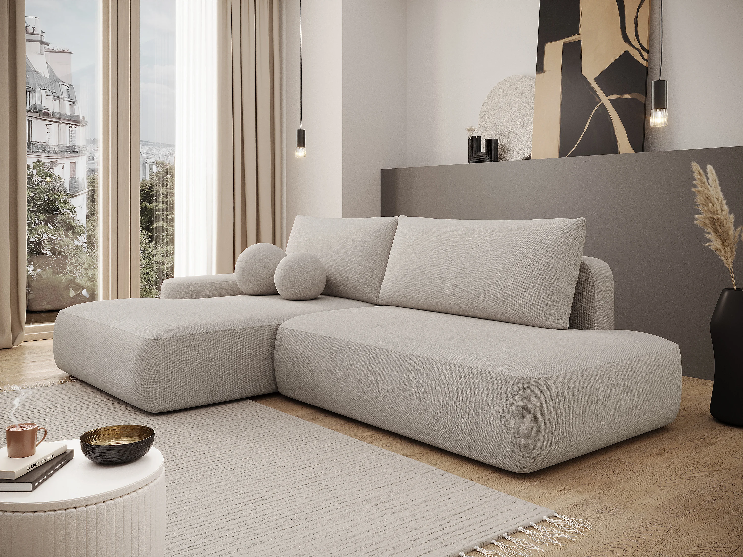 Canapé d'angle gauche ouvert convertible en tissu texturé beige DAVISO