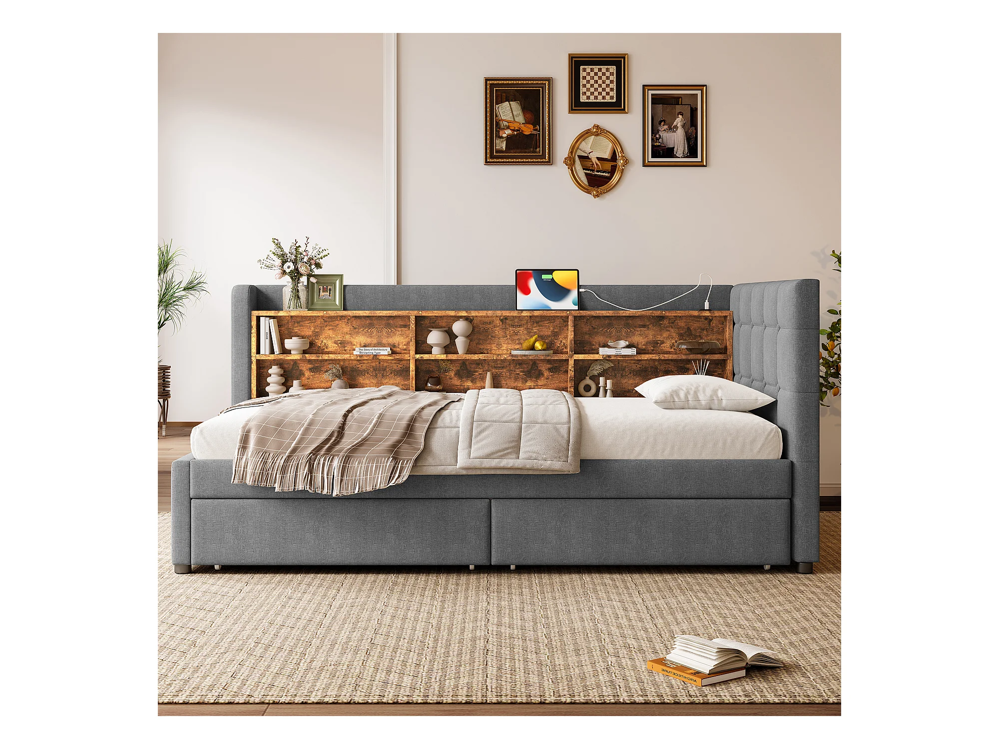 Daybett 90x200 cm, Tagesbett mit 2 Schubladen, USB + Typ C, Regalen und Ablagefächern, Leinen, Grau (207x101.5x78.5 cm)