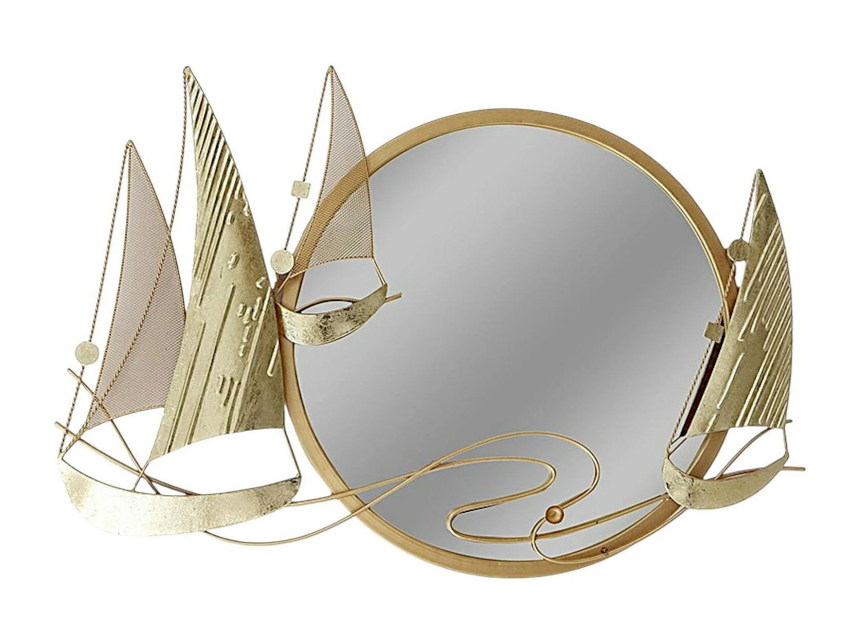 Décoration murale en métal avec miroir rond et bateaux dorés